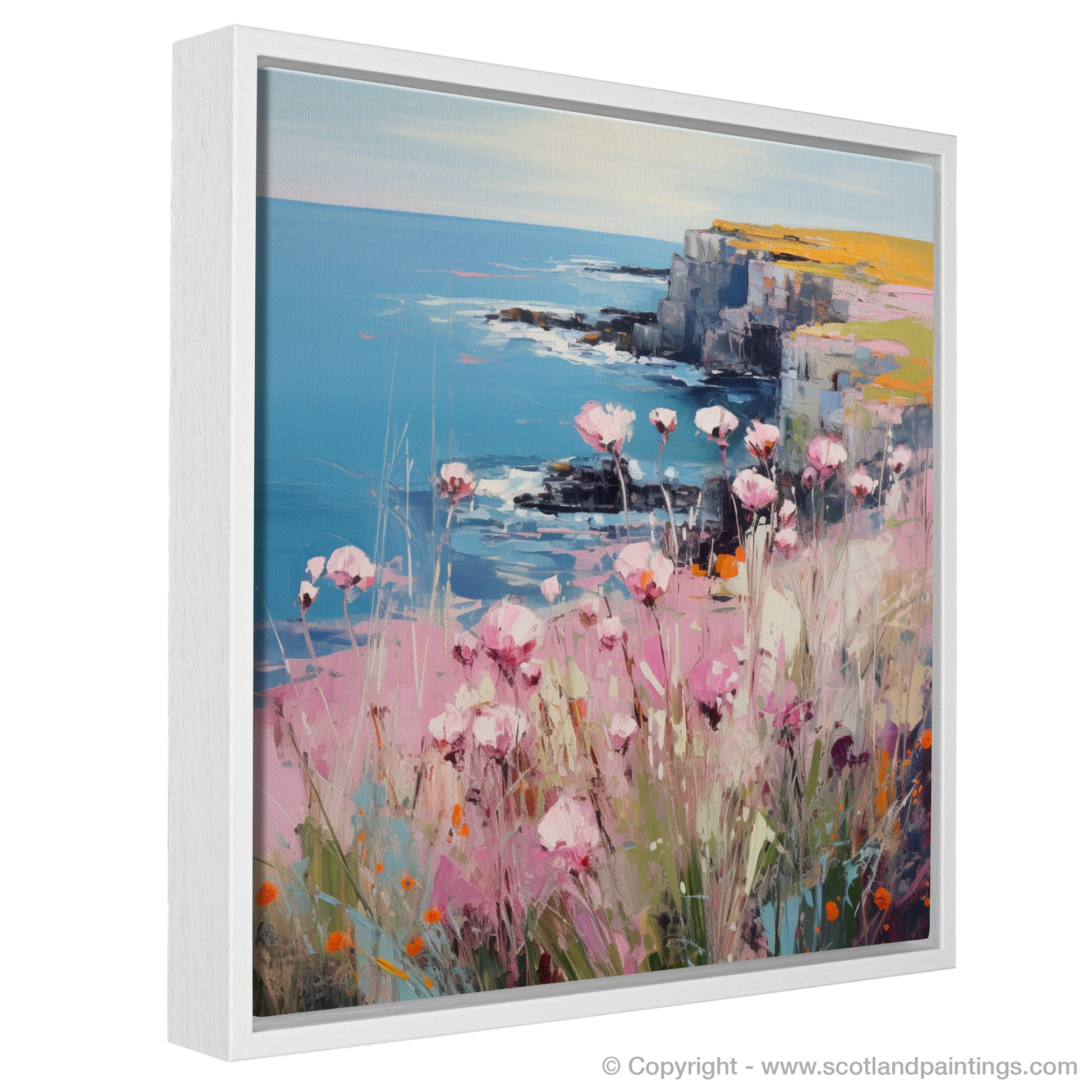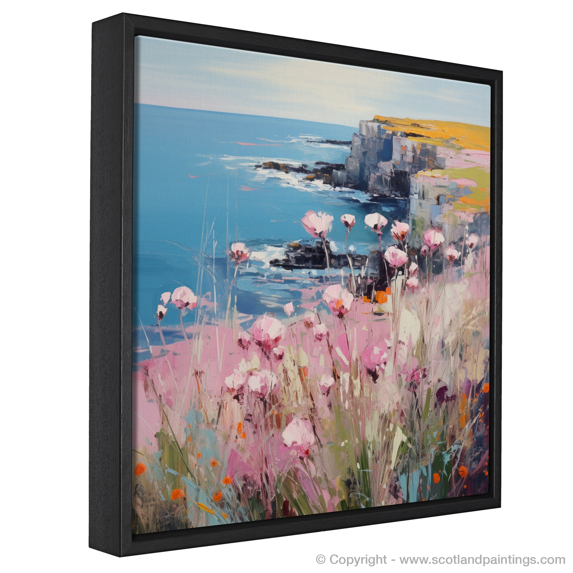 Glowing gently against the piece's canvas, blush-toned Sea thrift flowers dance delicately in the coastal breeze, each brushstroke contributing to a field of soft colour that seems to stretch infinitely. The vivacious pops of orange, mimicking the flora’s natural companions, add layers of depth and warmth to the composition.