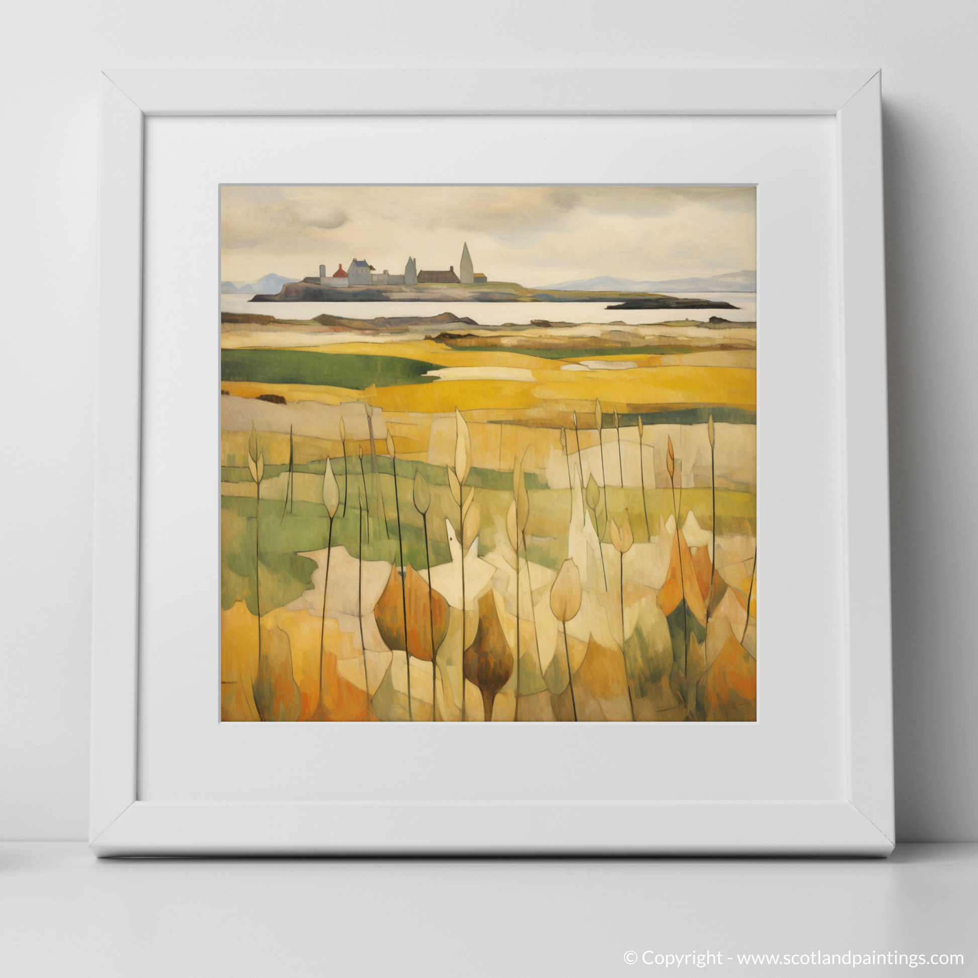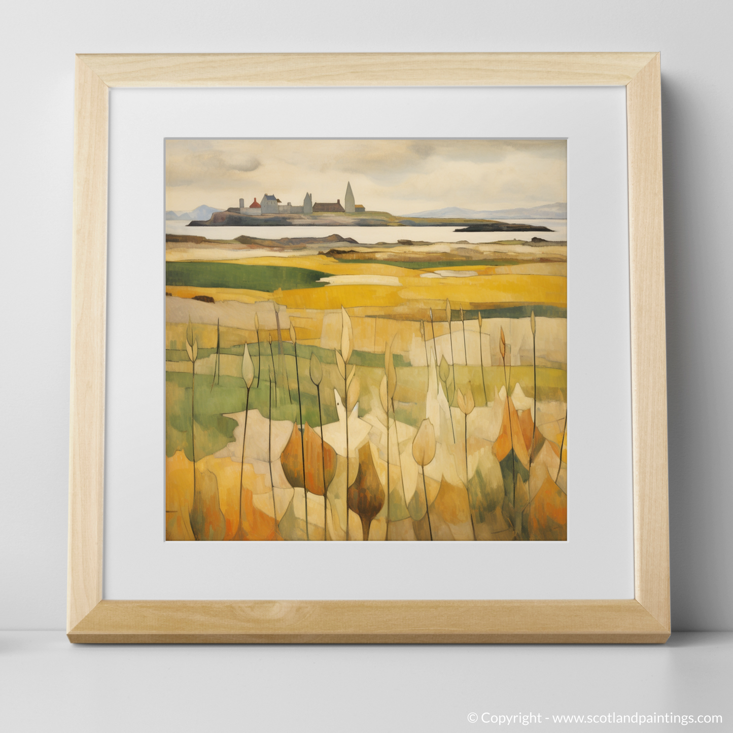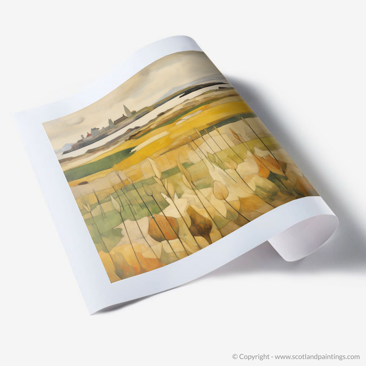 The background softly melts into a panoramic sweep of sandy dunes and subtle waterways, crowned by the distant fortress-like silhouette on the horizon—a subtle yet poignant nod to Scotland's rugged island landscapes. A medley of interlocking shapes and demure earth tones embodies both the simplicity and complexity of the region's natural tapestry. Admirers of the Scottish countryside and lovers of avant-garde interpretations alike will find this print to be a compelling addition to their space, imbuing it with a serene yet thought-provoking atmosphere. The unique cubist approach reimagines the saltmarsh flora in a manner that is at once intellectual, meditative, and profoundly connected to the Scottish natural world.