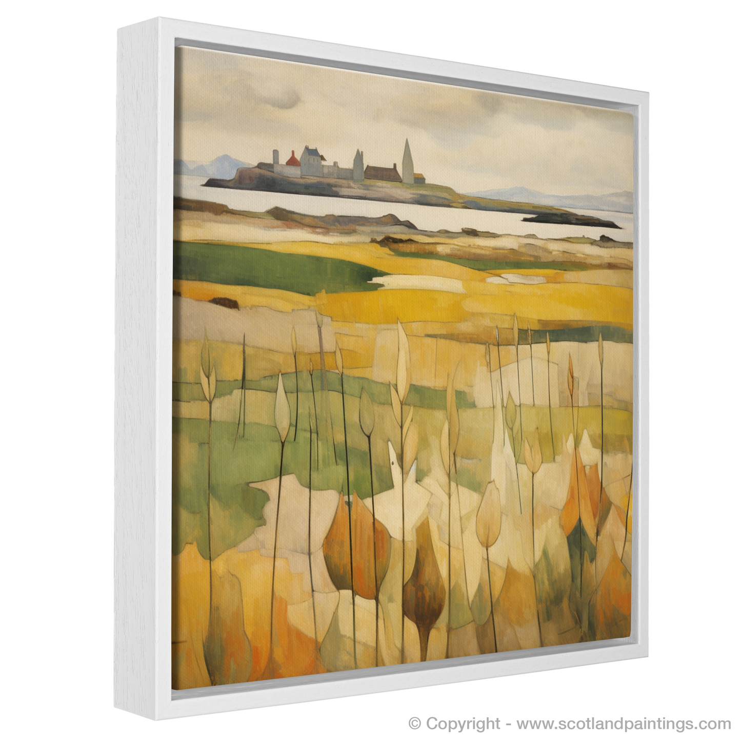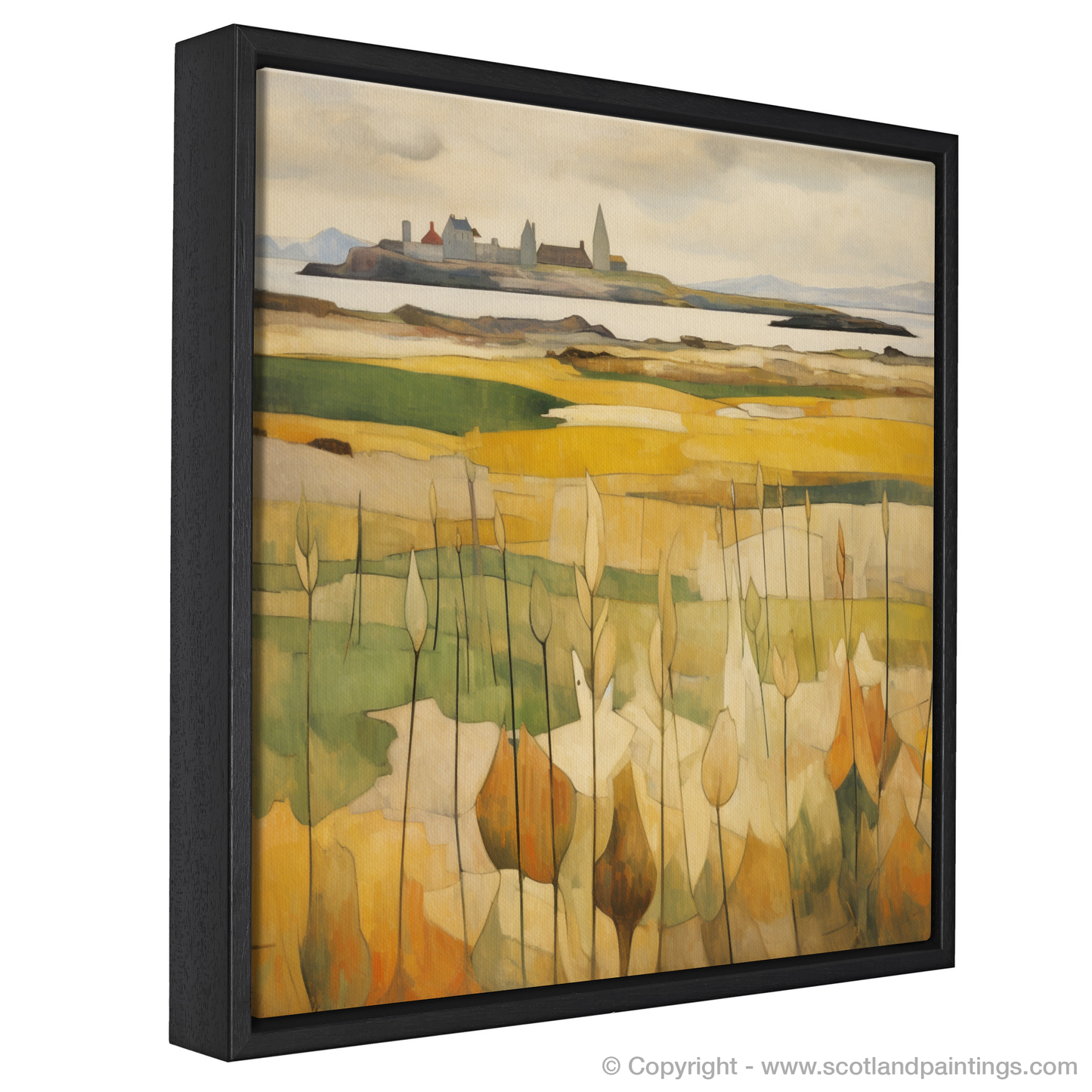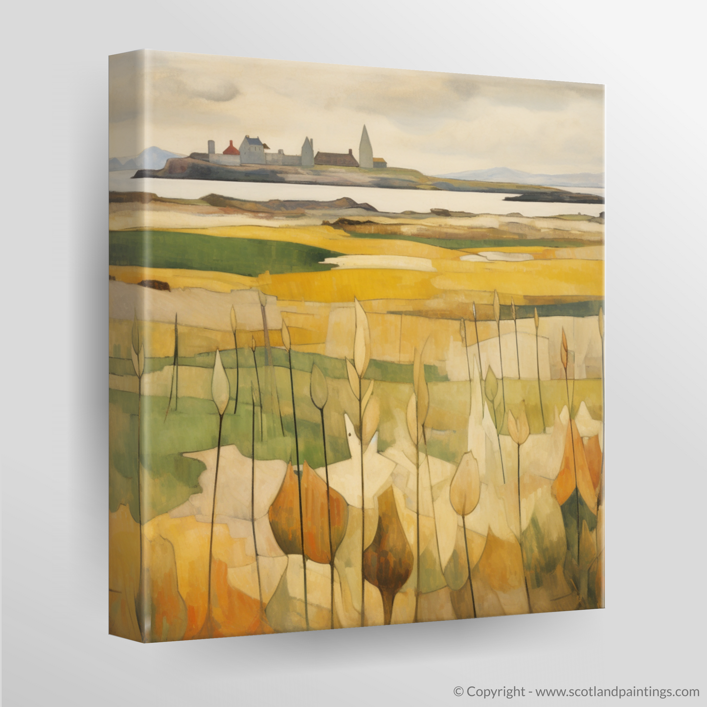 The background softly melts into a panoramic sweep of sandy dunes and subtle waterways, crowned by the distant fortress-like silhouette on the horizon—a subtle yet poignant nod to Scotland's rugged island landscapes. A medley of interlocking shapes and demure earth tones embodies both the simplicity and complexity of the region's natural tapestry. Admirers of the Scottish countryside and lovers of avant-garde interpretations alike will find this print to be a compelling addition to their space, imbuing it with a serene yet thought-provoking atmosphere. The unique cubist approach reimagines the saltmarsh flora in a manner that is at once intellectual, meditative, and profoundly connected to the Scottish natural world.