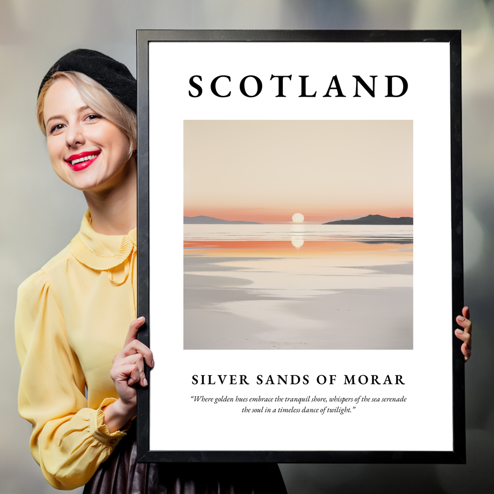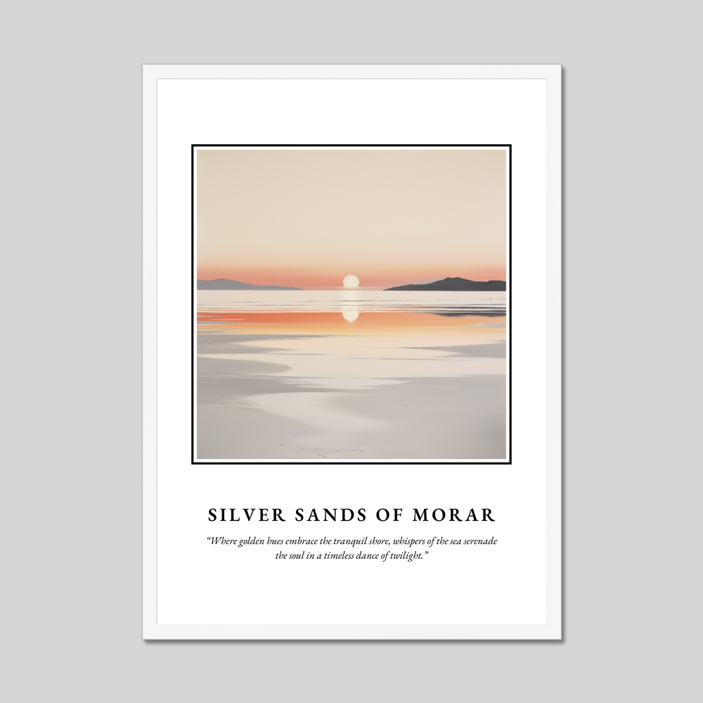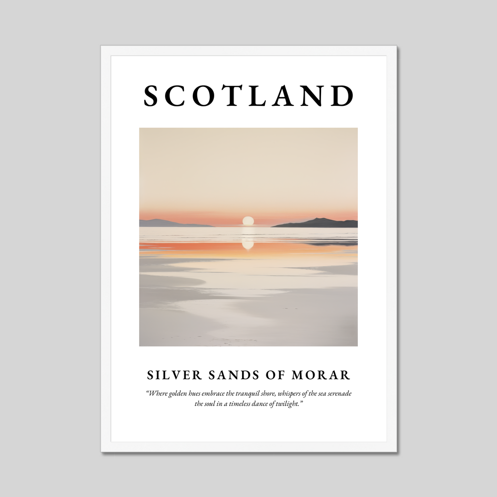 The Silver Sands of Morar, located on Scotland's rugged west coast, are renowned for their dazzling white beaches and crystal-clear waters. Gently lapped by the ever-changing tides of the Atlantic, these sands form a picturesque setting that consistently captivates visitors from around the world. The ethereal qualities depicted in our poster reflect the magical essence of this location, inviting a sense of peace and introspection.
