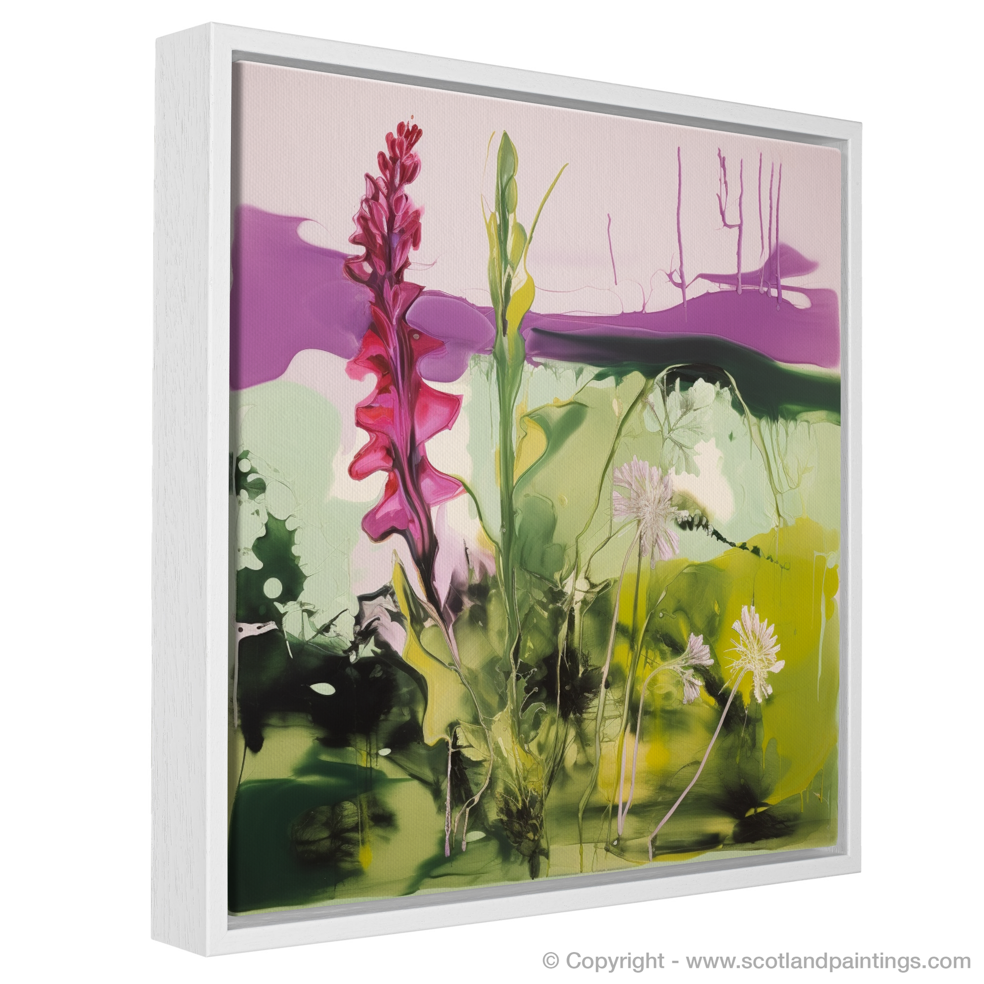 Step into a dream-like interpretation of Scottish woodlands with this enchanting print, part of our 'Scottish Flowers and Flora' collection. This abstract piece is a unique celebration of the foxglove, a captivating bloom that punctuates the lush undergrowth of Plockton's serene woods.