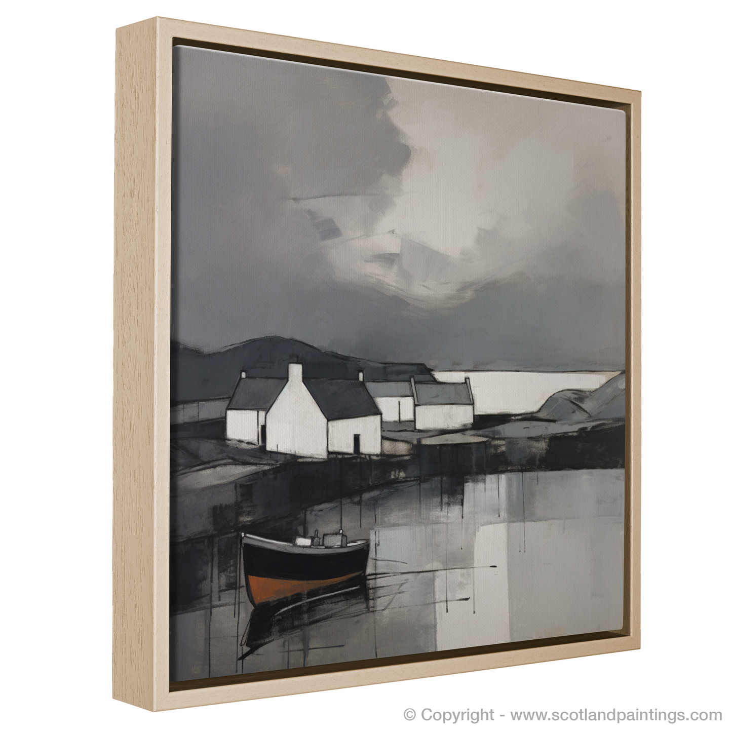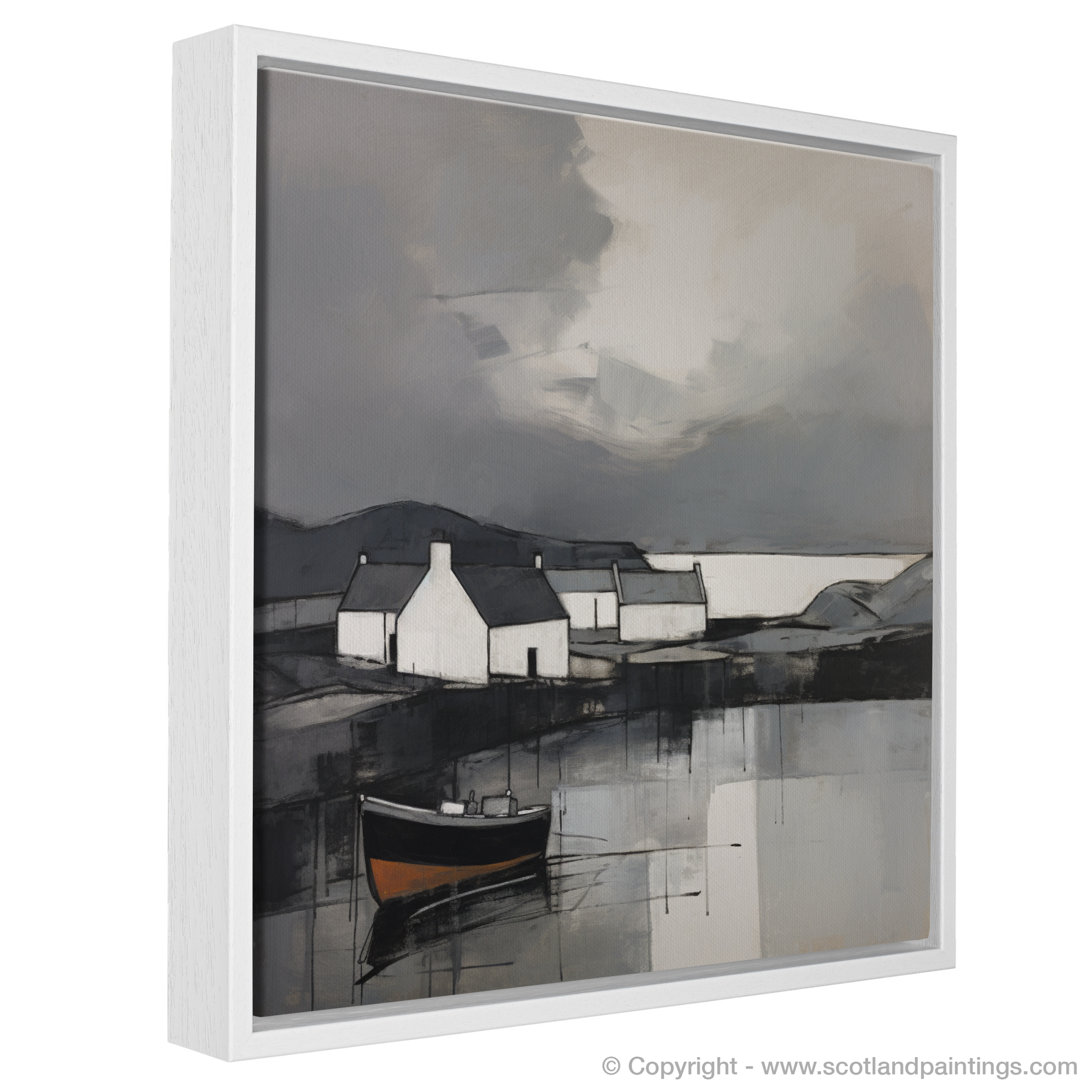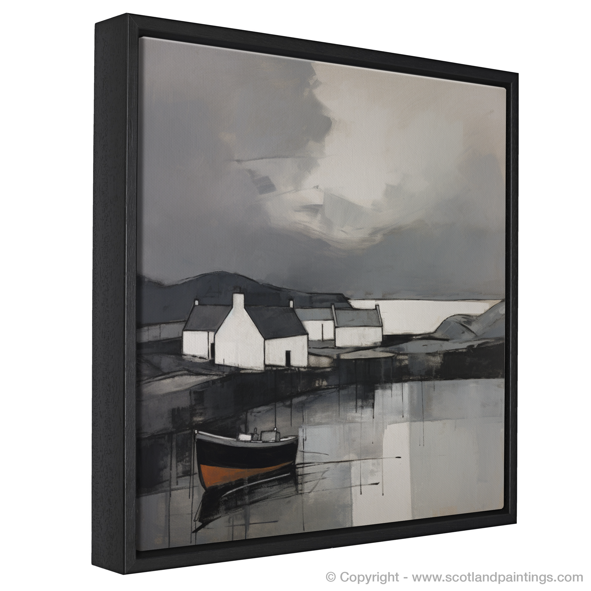 Immerse yourself in the moody ambiance of a Scottish harbour with this evocative abstract print. The piece portrays Craobh Haven Harbour amidst an impending storm, capturing both the calm before the tempest and the electrifying charge in the air that such weather brings. Dominant stormy hues of grey and black converge overhead, creating a dynamic contrast with the stark whiteness of the harbour buildings, whose forms are rendered with a geometric simplicity that prioritises emotion over detail.