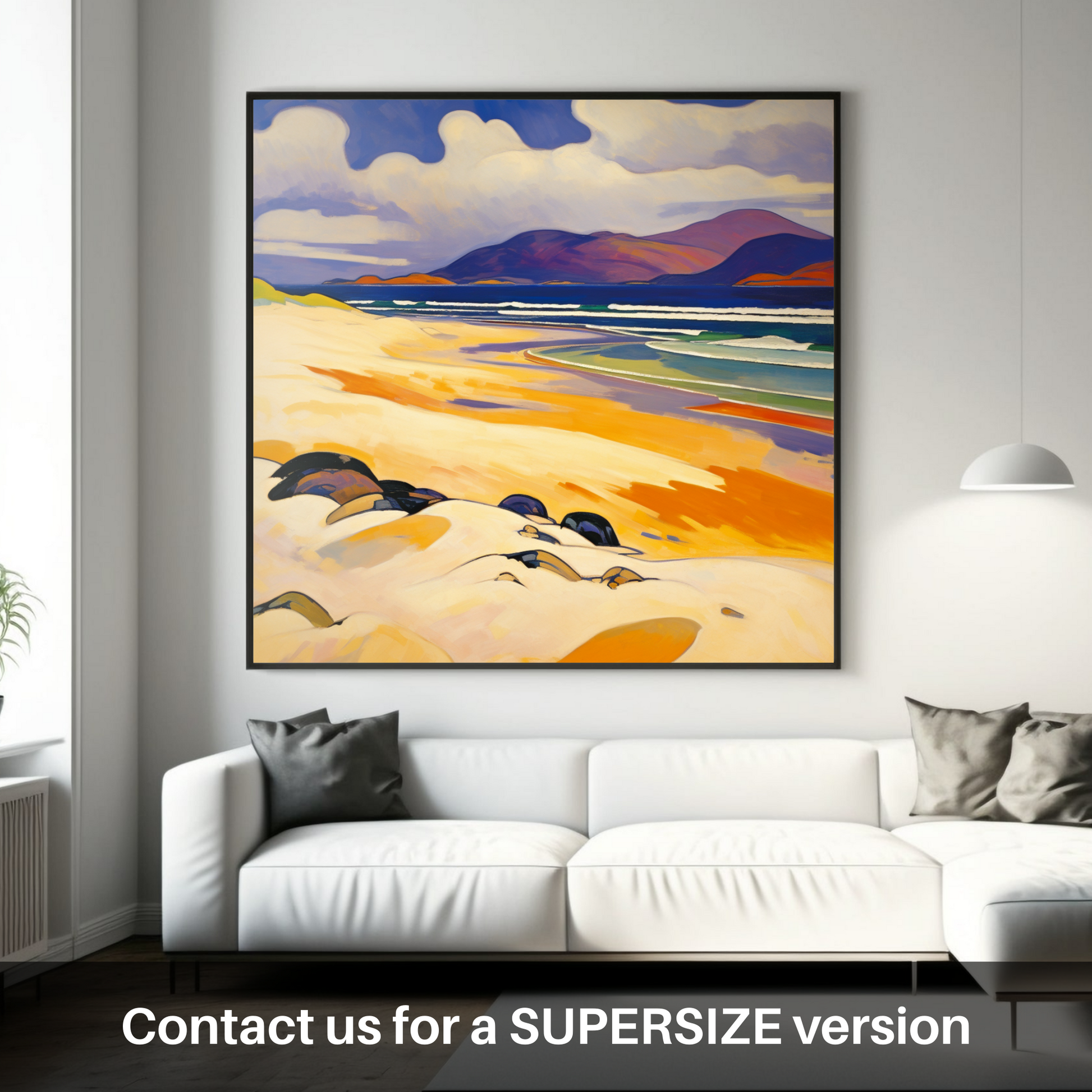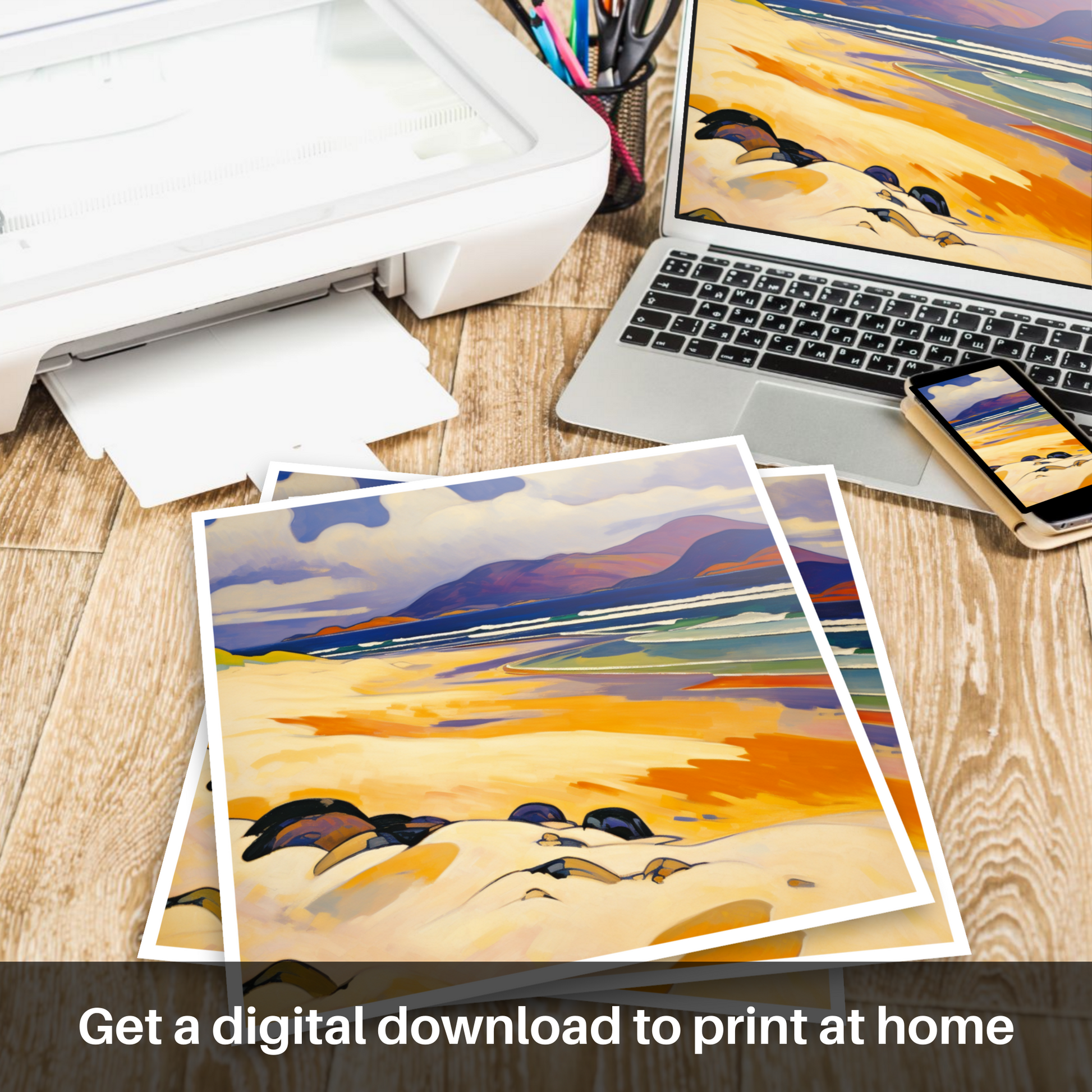 Capturing the raw beauty of the Hebrides, this vibrant print brings to life the untamed spirit of Scarista Beach on the Isle of Harris. With its striking use of colour and bold contours, the piece exudes the essence of Fauvist art, characterised by its disregard for naturalistic colour and detail in favour of intense, unmodulated hues that sing from the canvas.