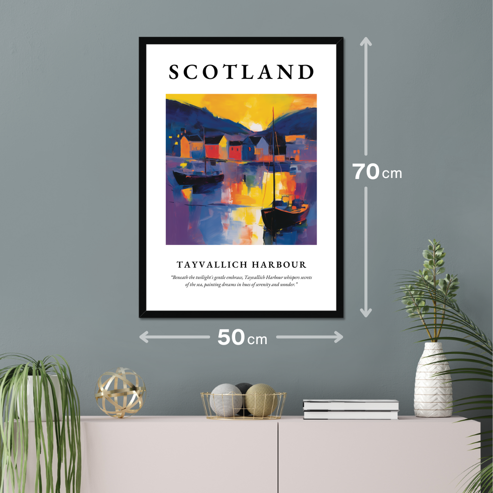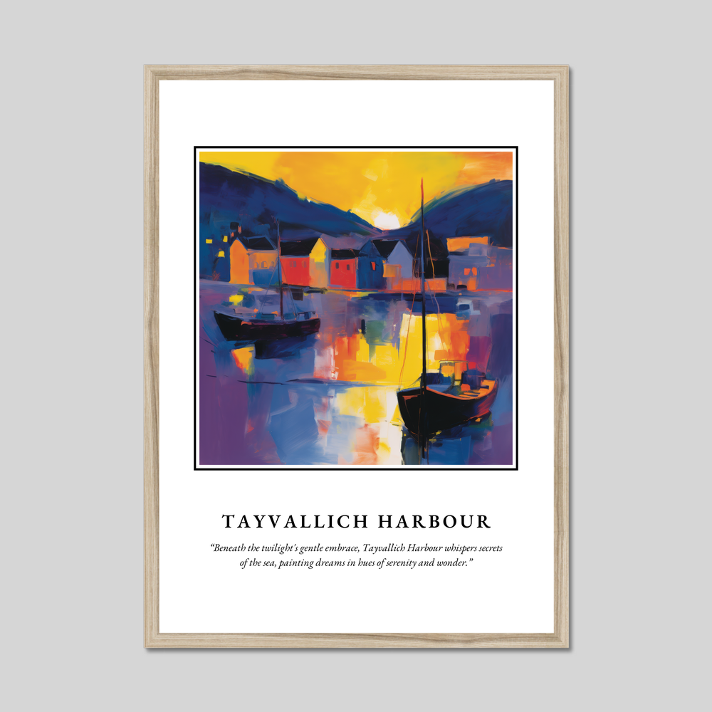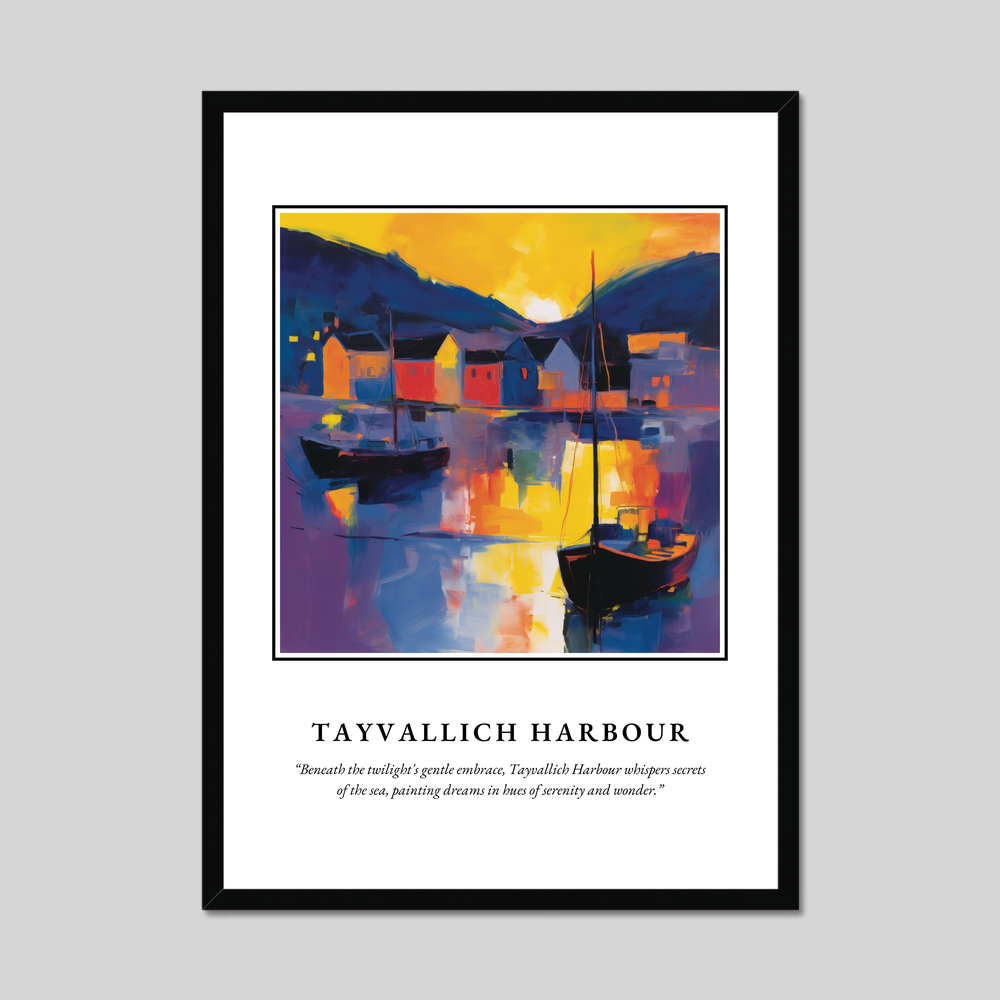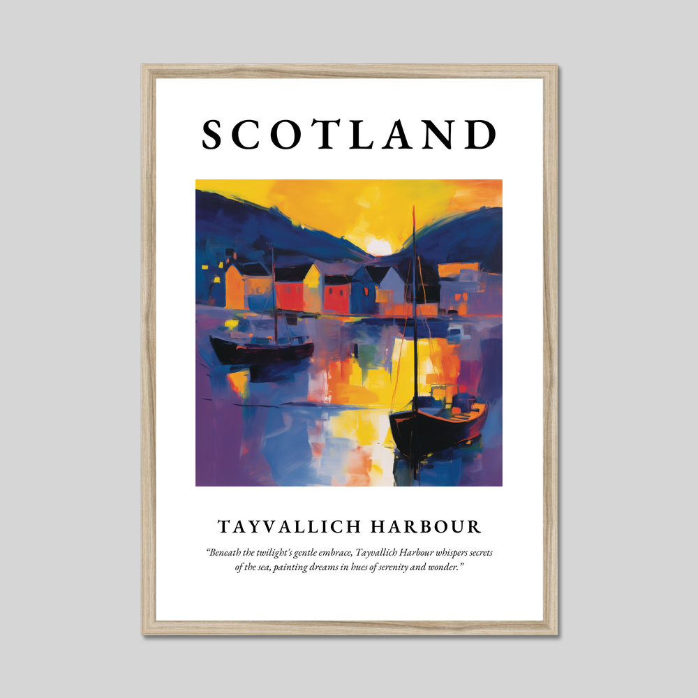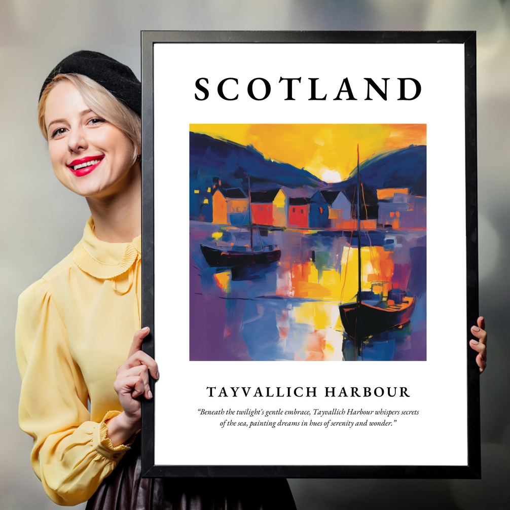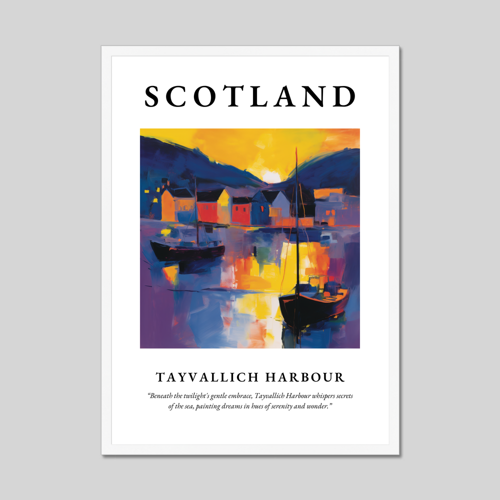 At the top, the bold letters spell out "SCOTLAND," immediately capturing attention and setting the scene for the breathtaking journey below. The heart of this piece features a mesmerising Abstract Expressionist rendition of Tayvallich Harbour. The dynamic brushstrokes and vivid colours encapsulate the essence of this serene locale, inviting viewers to lose themselves in its tapestry of blues, oranges, and purples. The quote beneath – "Beneath the twilight's gentle embrace, Tayvallich Harbour whispers secrets of the sea, painting dreams in hues of serenity and wonder." – adds a poetic touch.