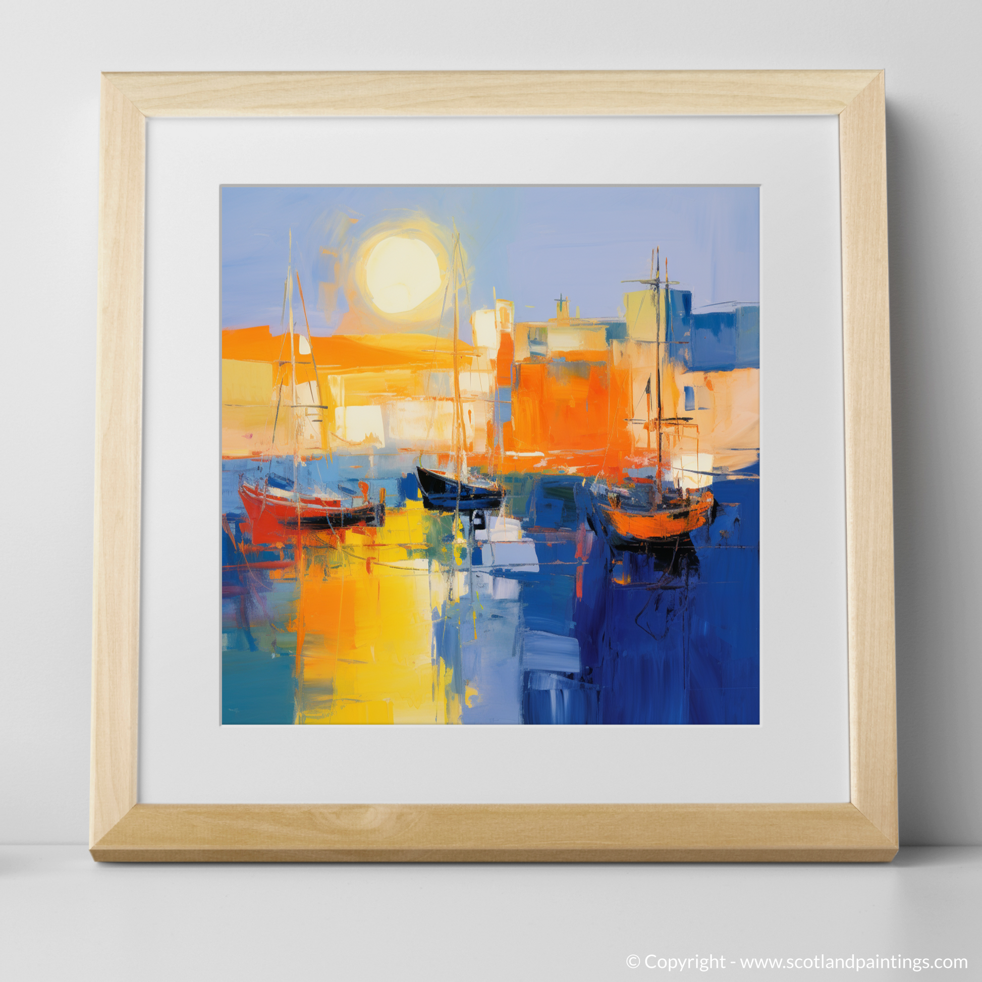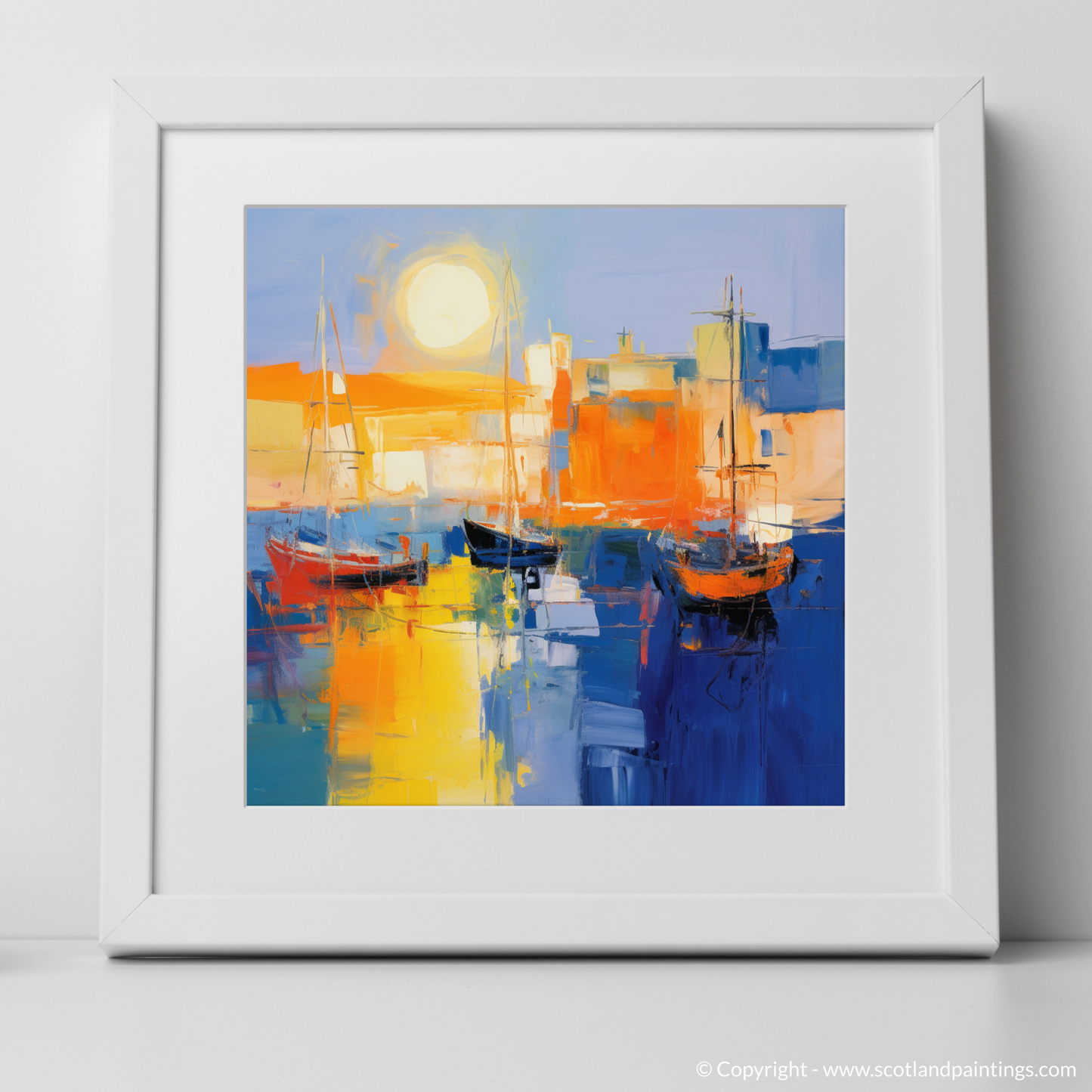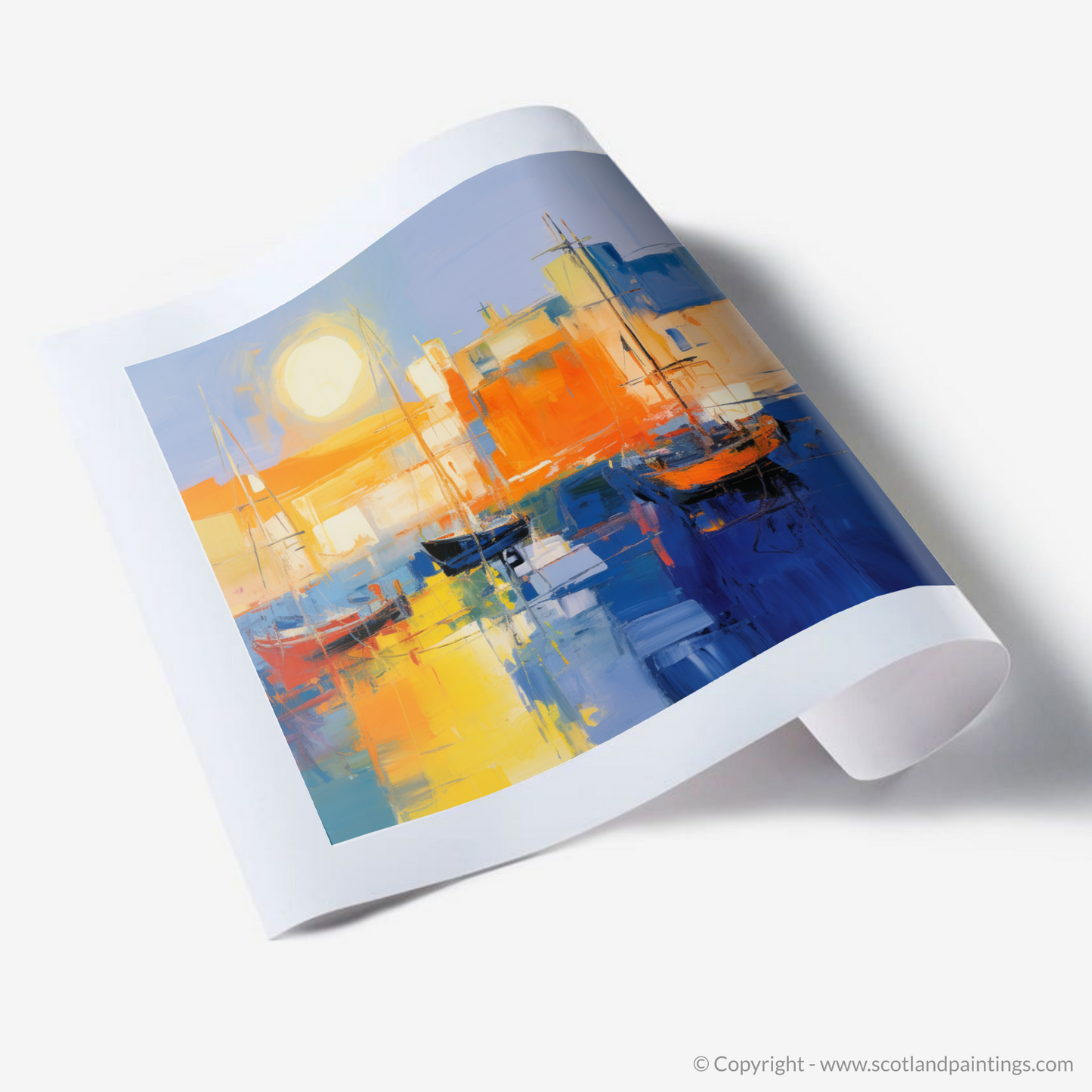 This print invites the viewer to explore the dynamic interplay of shape and shade—a truly sensory experience where the boundaries of harbour and horizon blur. The pure abstraction allows one's imagination to wander amid the shapes and colours, each brushstroke telling its own tale of the serene Scottish harbour at this enchanted hour.