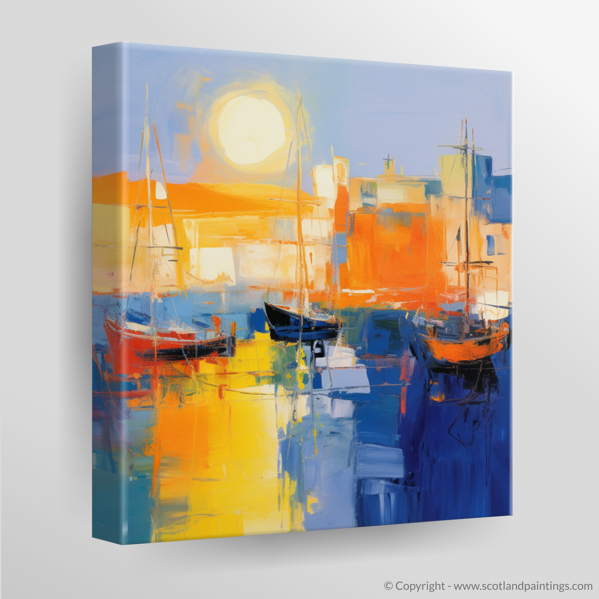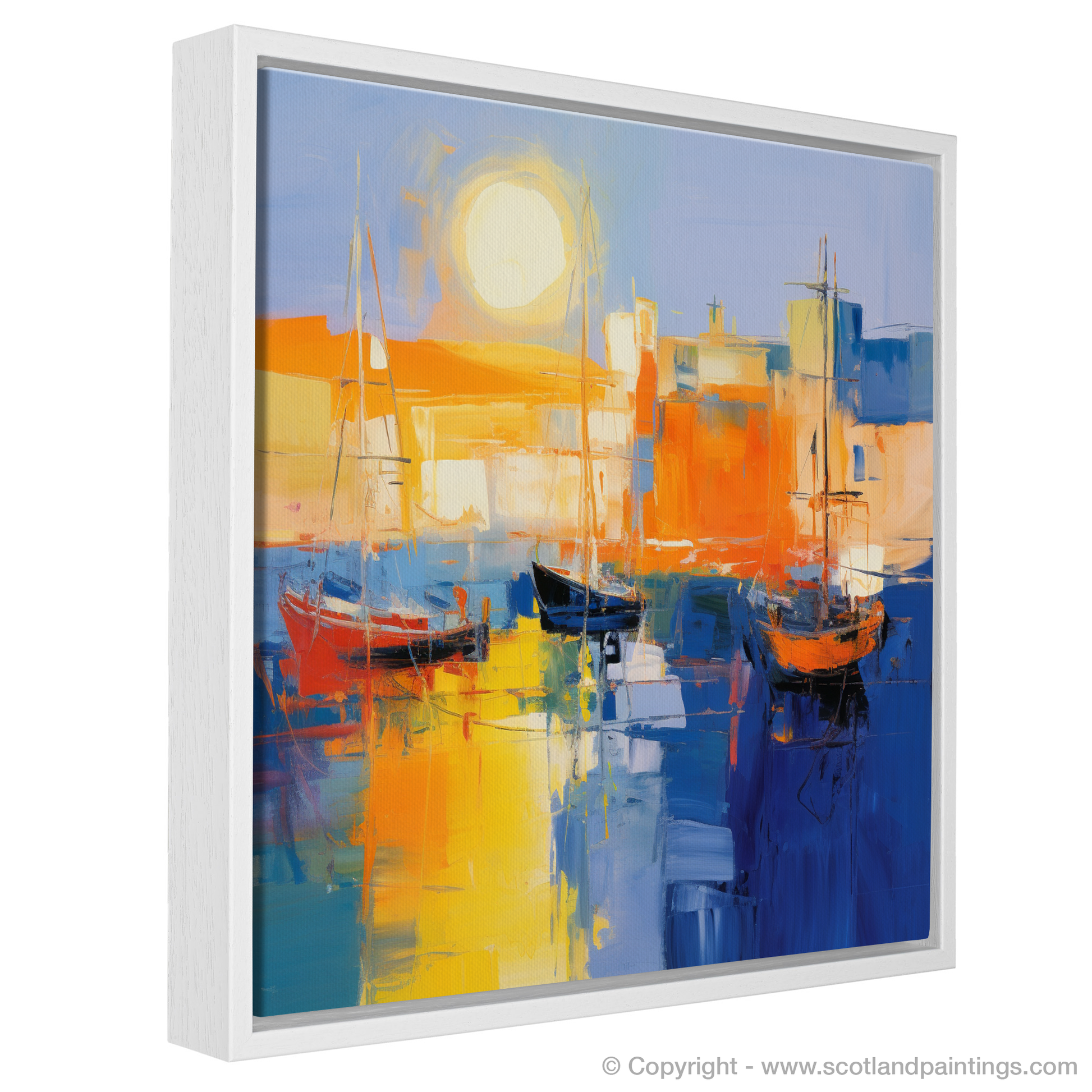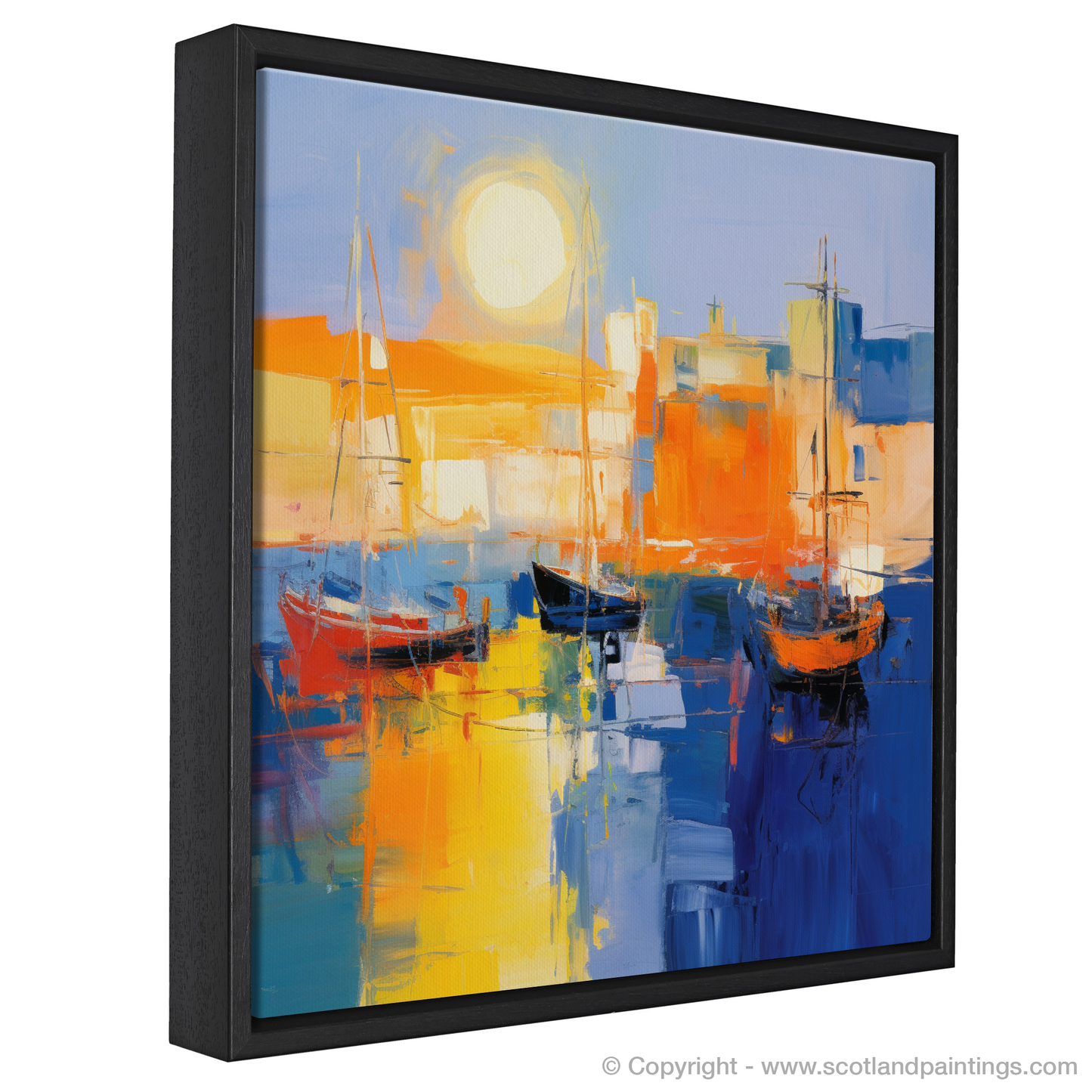 This print invites the viewer to explore the dynamic interplay of shape and shade—a truly sensory experience where the boundaries of harbour and horizon blur. The pure abstraction allows one's imagination to wander amid the shapes and colours, each brushstroke telling its own tale of the serene Scottish harbour at this enchanted hour.
