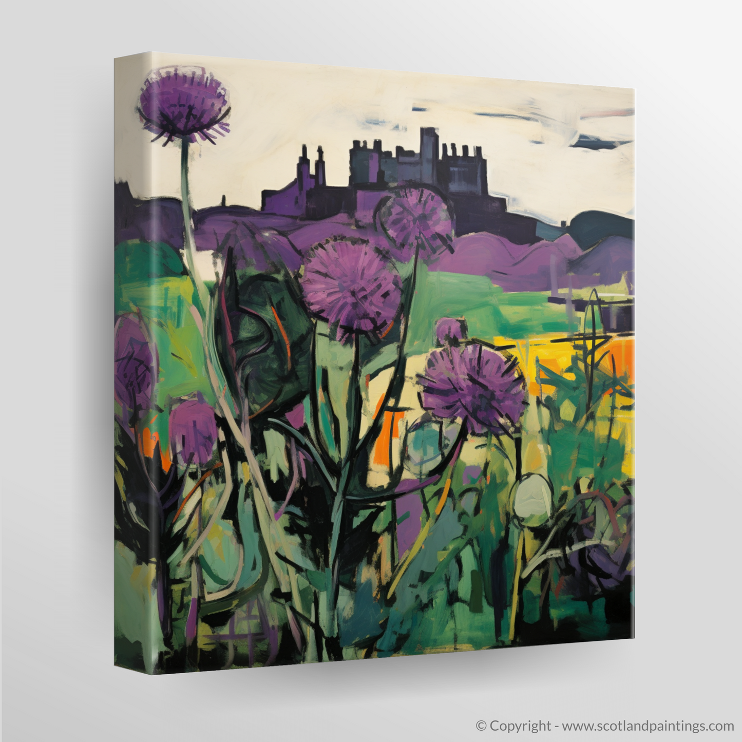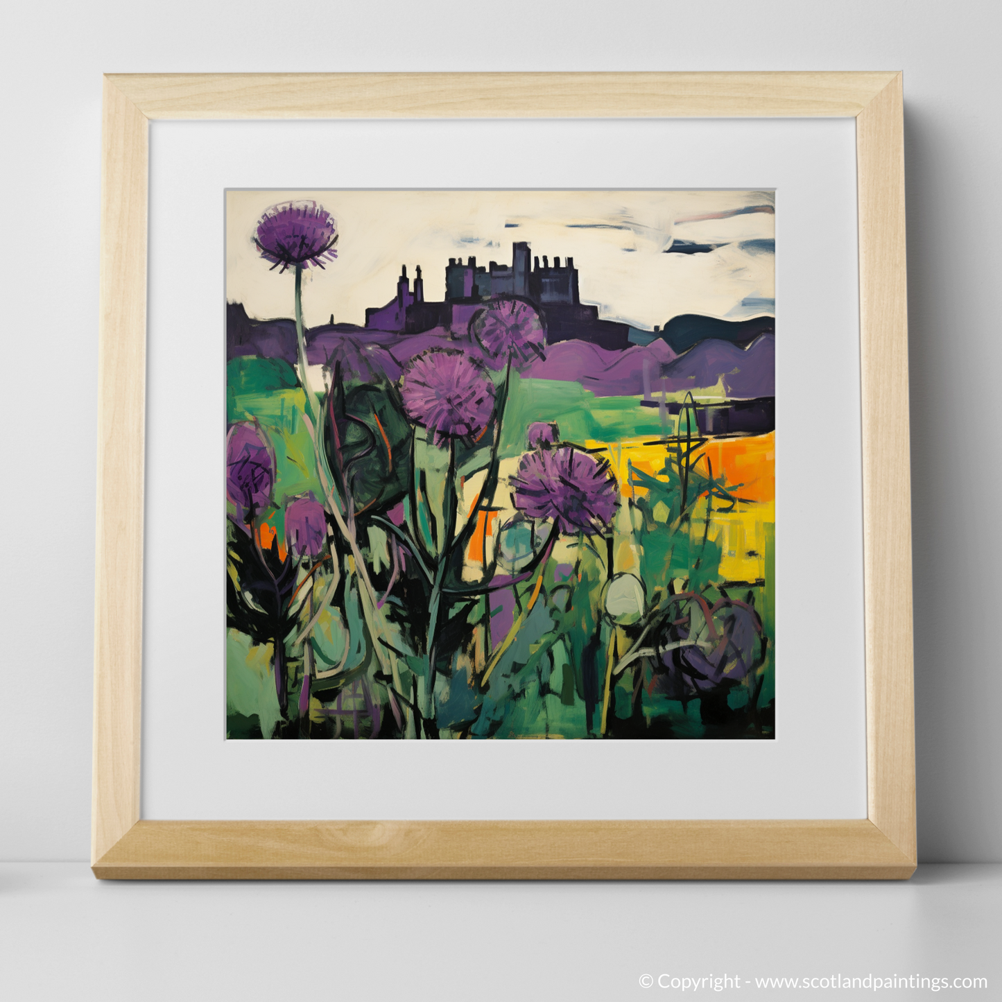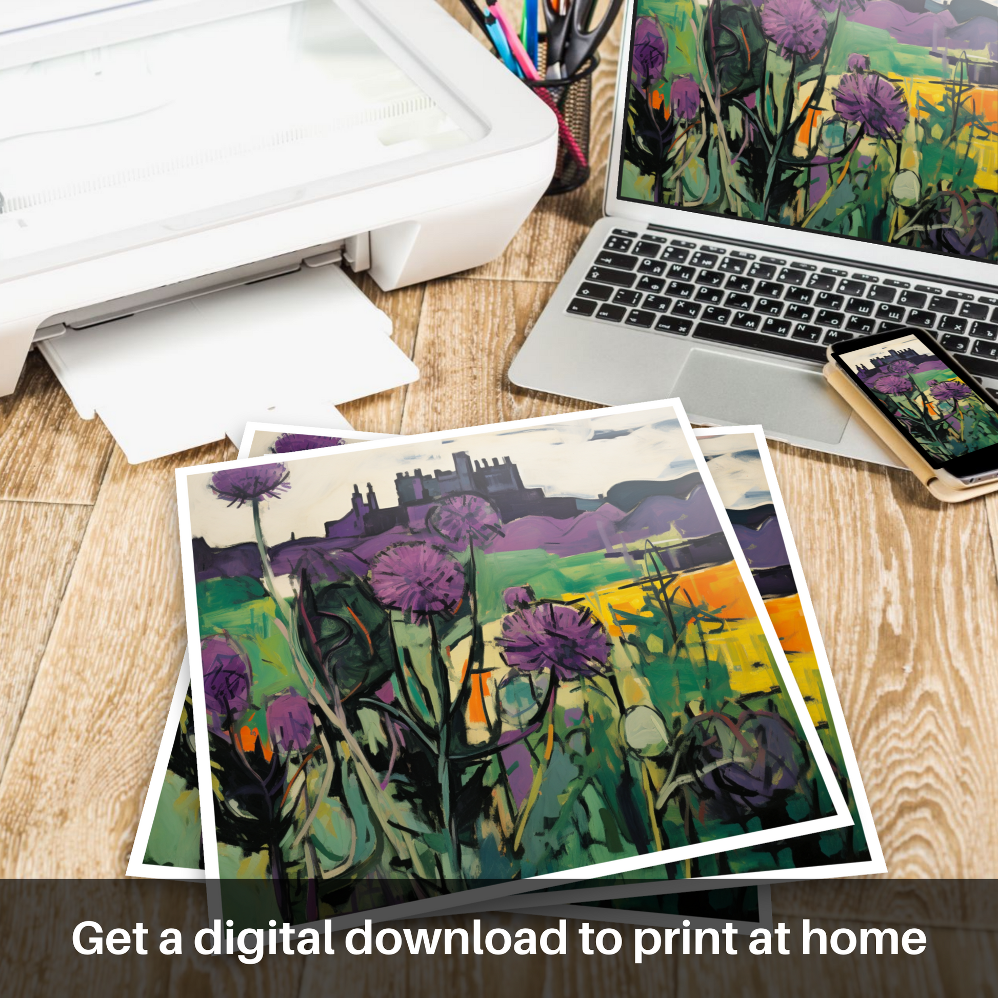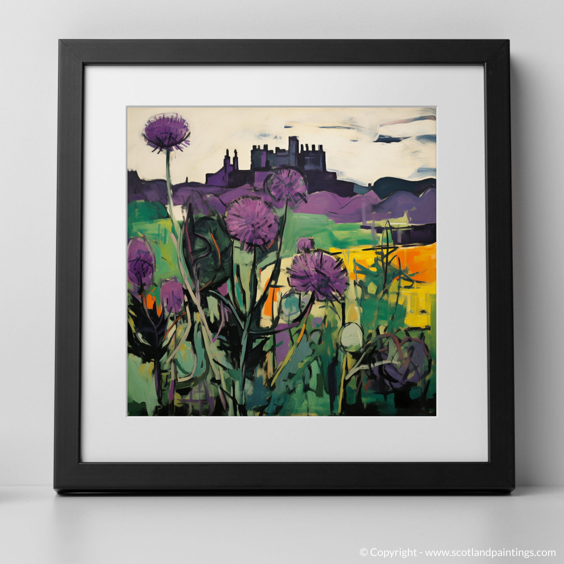 Part of the 'Scottish Flowers and Flora' collection, this piece is a tribute to the untamed spirit of Scotland's natural beauty, encompassing both the delicate poise of the thistle and the enduring grandeur of Stirling Castle, all while championing the freedom and vigor of abstract expressionism. Embrace the allure of Scotland with this mesmerising print, a testament to the wild heart that beats in every petal and stone.