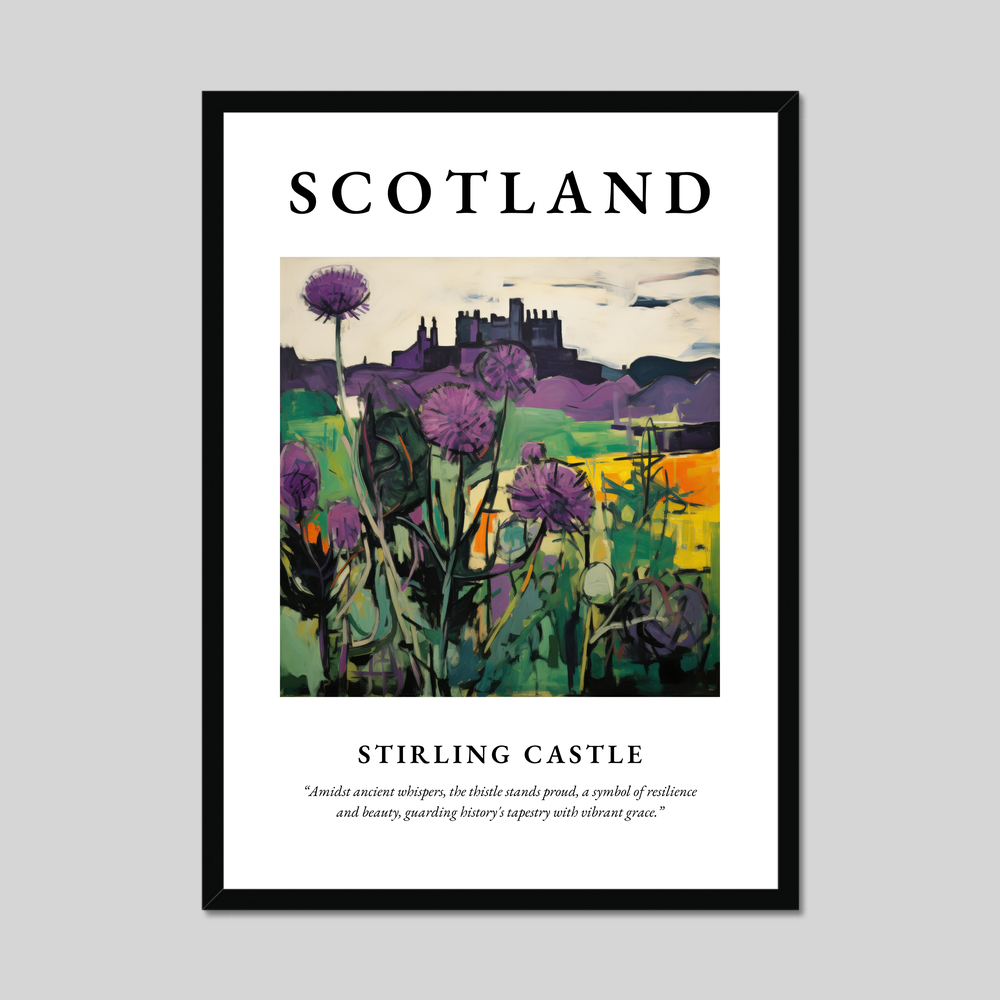The poster masterfully blends vivid hues and bold textures. Captured in the energetic style of Abstract Expressionism, the painting evokes the rugged beauty and indomitable spirit of Scotland. The dominant purples and greens, juxtaposed against the strong outline of Stirling Castle, bring to life the thistle's proud resilience, embodying both the strength and grace found in the Scottish landscape. The quote beneath, “Amidst ancient whispers, the thistle stands proud, a symbol of resilience and beauty, guarding history’s tapestry with vibrant grace,” perfectly encapsulates the sense of historical guardianship and natural beauty captured in this artwork.