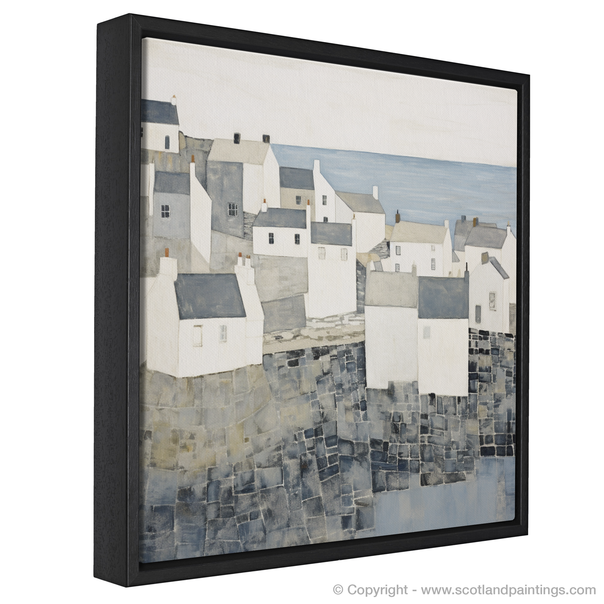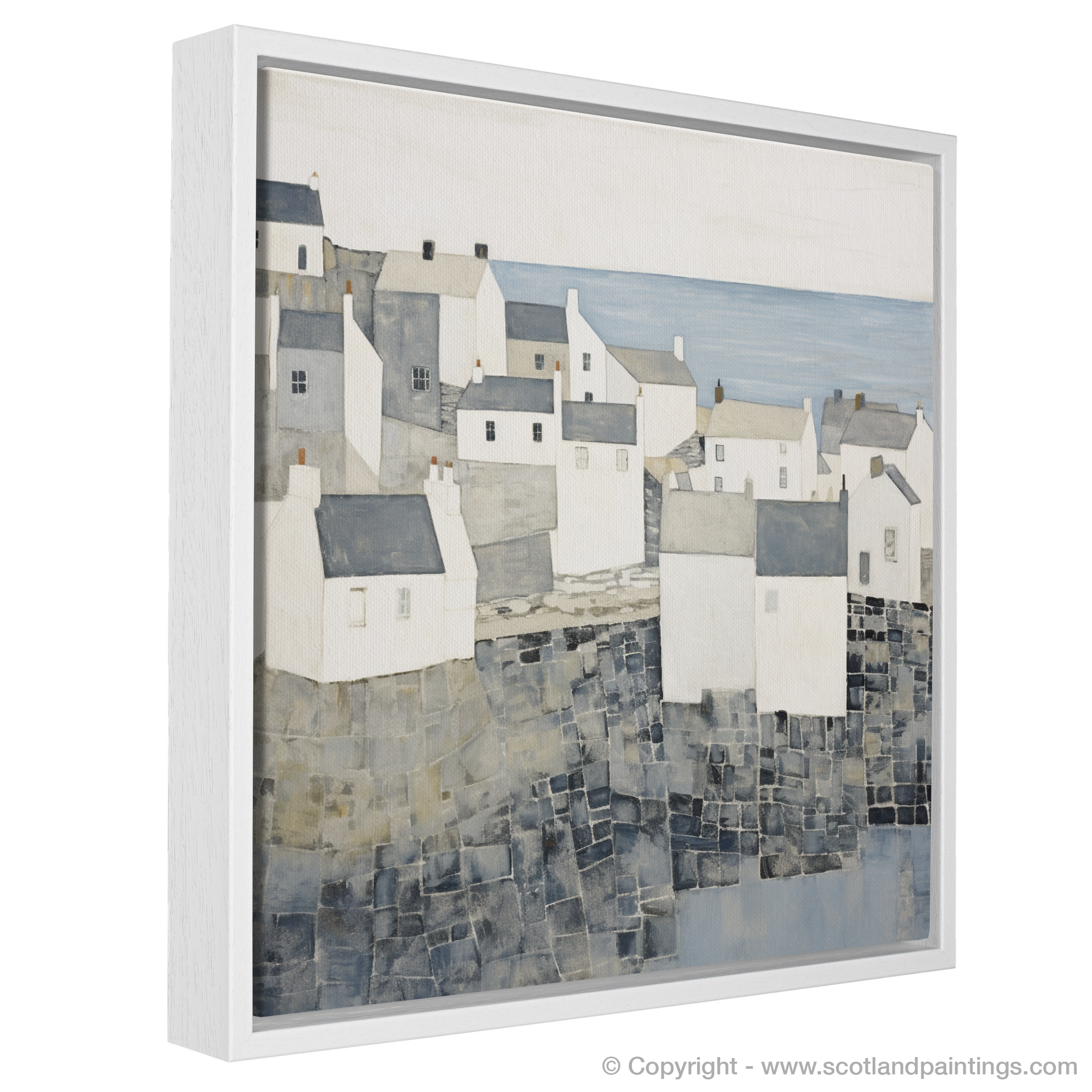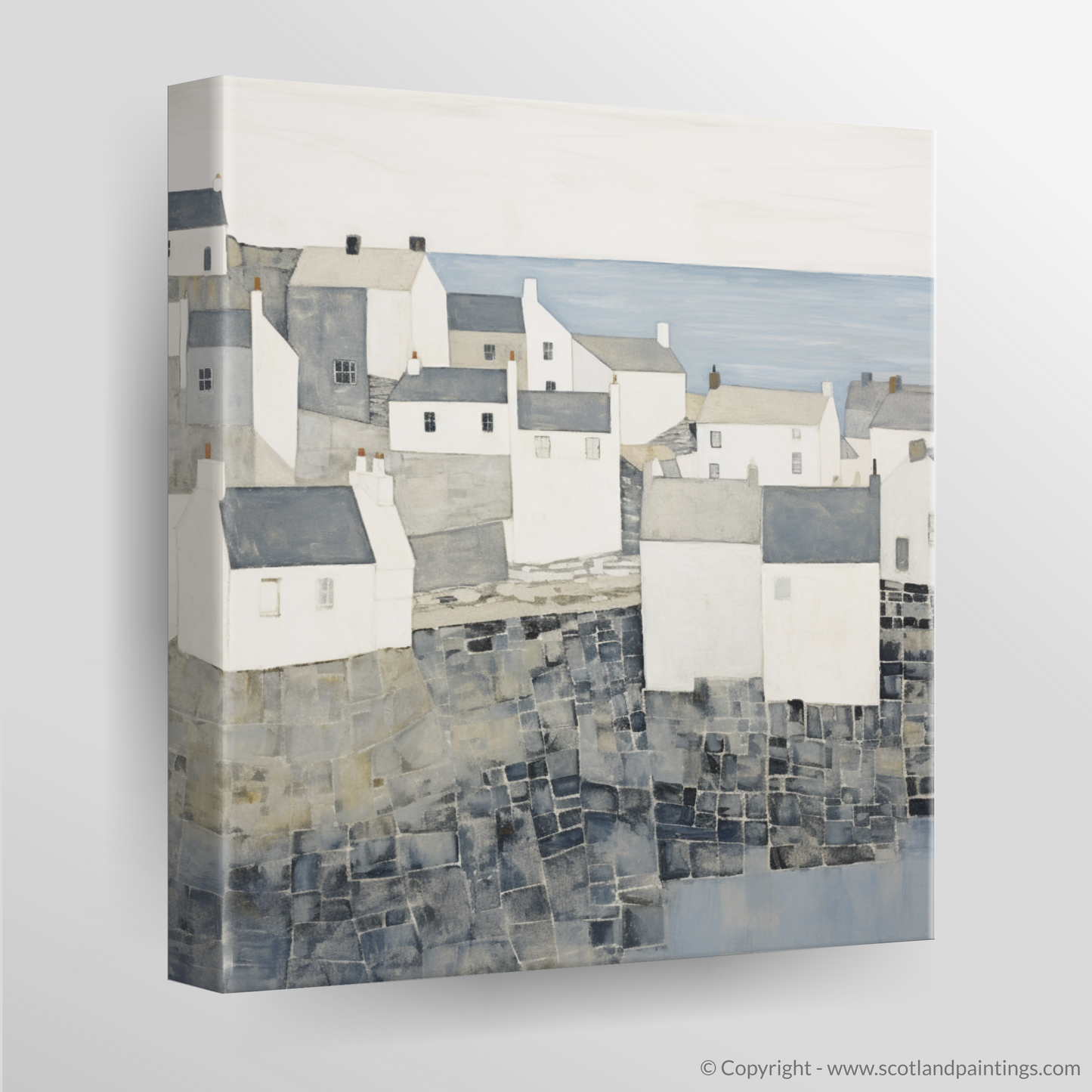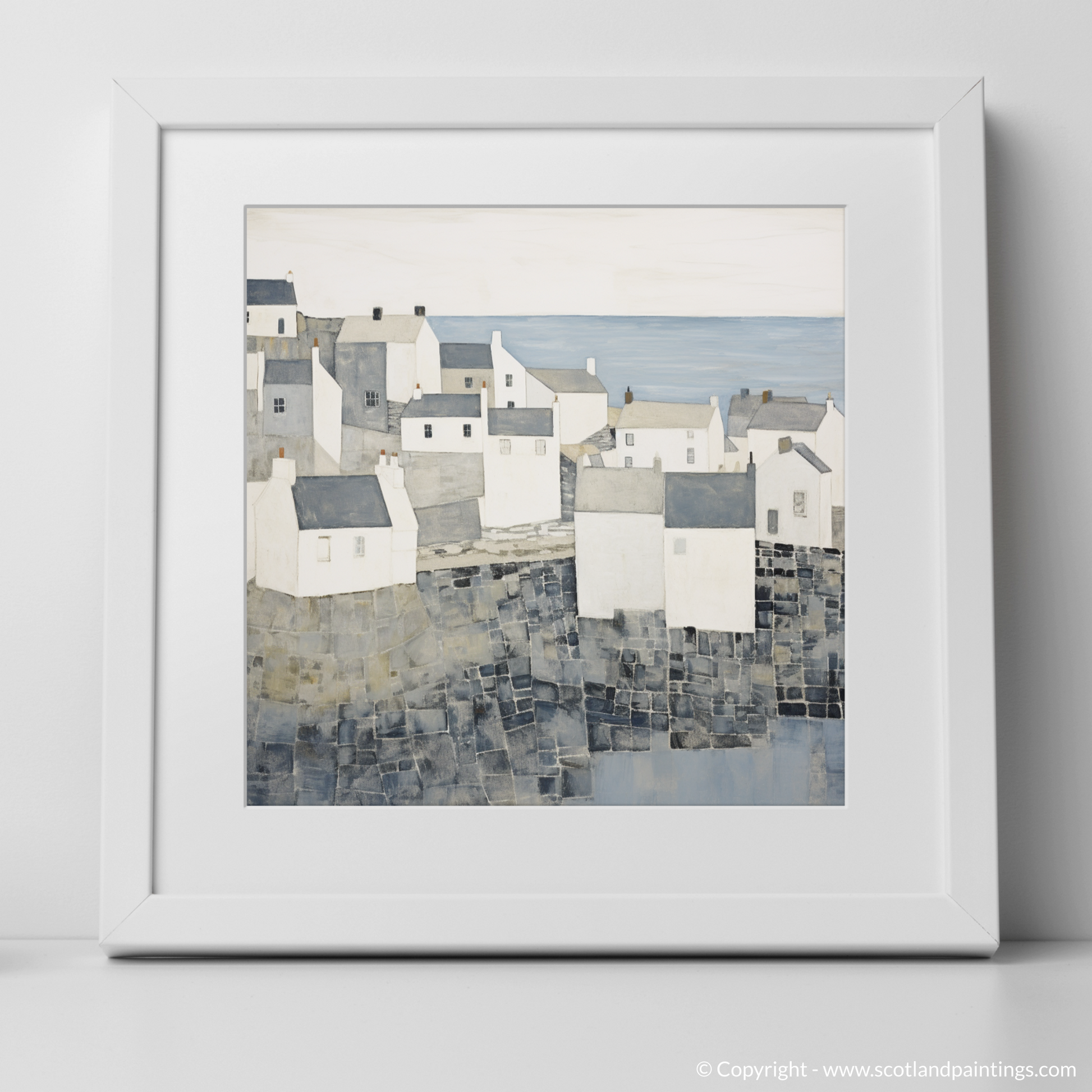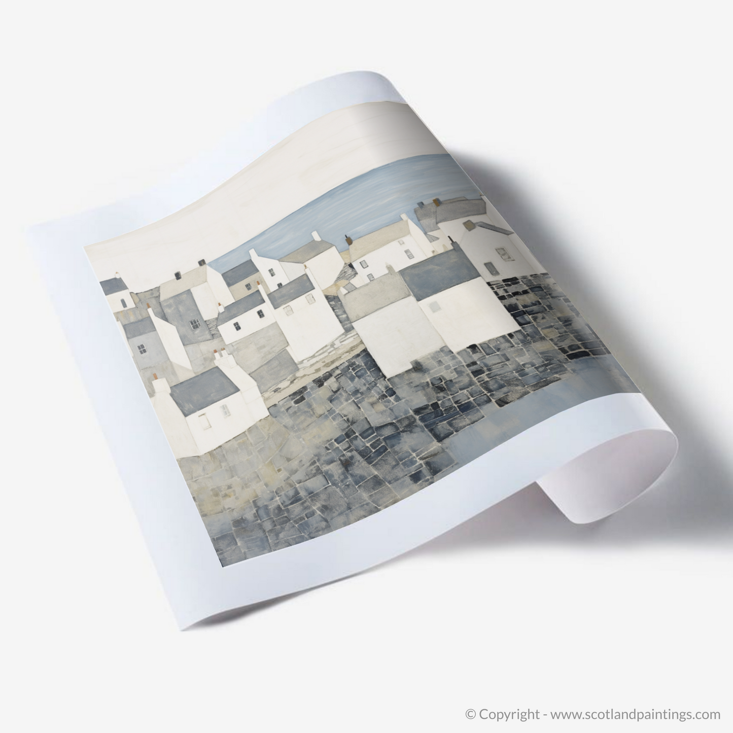 A gentle myriad of cool greys, whites, and blues dominates the canvas, drawing attention to the quintessential features of the harbour without surrendering to the confines of realism. The essence of Gardenstown's charming cottages is distilled into a series of irregular, cubist-inspired shapes that ascend from the harbour's edge, creating a dreamy, hill-like mosaic of homes that seem to huddle together against the vastness of the sea and sky.