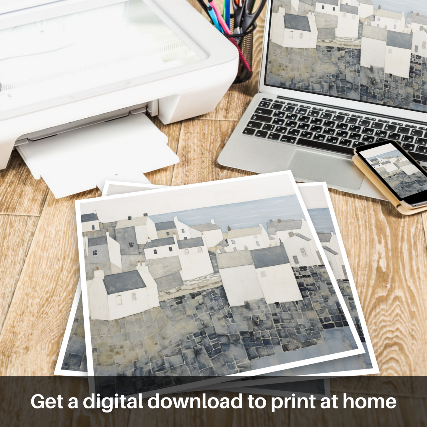 Immerse yourself in the serene complexity of this captivating abstract interpretation of Gardenstown Harbour, a jewel of Aberdeenshire. This evocative print invites onlookers to venture into a world where traditional architecture and the rugged beauty of the Scottish coastline are reimagined through a harmonious blend of geometric abstraction and softened colour palette.