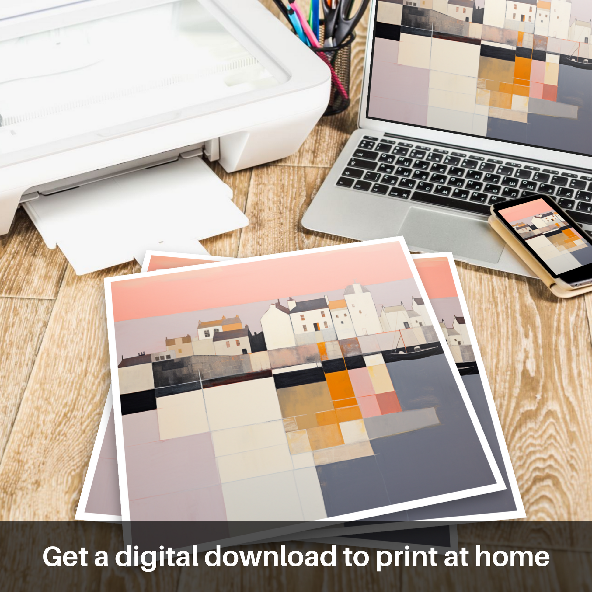 An ode to Scottish coastal life, this evocative print brings a touch of contemporary art to any space. It stands as a testament to the quiet allure of Pittenweem Harbour, alluring audiences with its interplay of colour, light, and abstract interpretation.