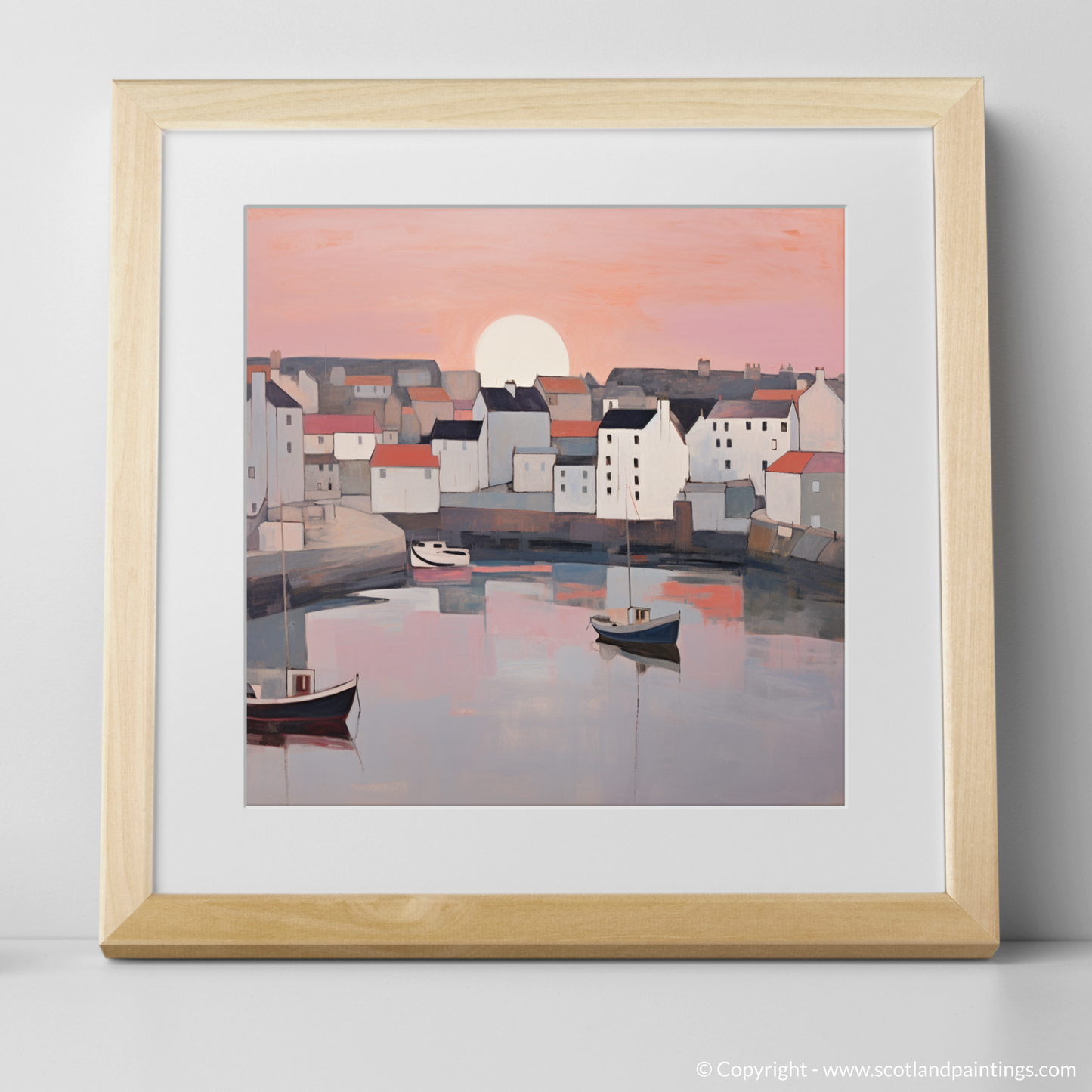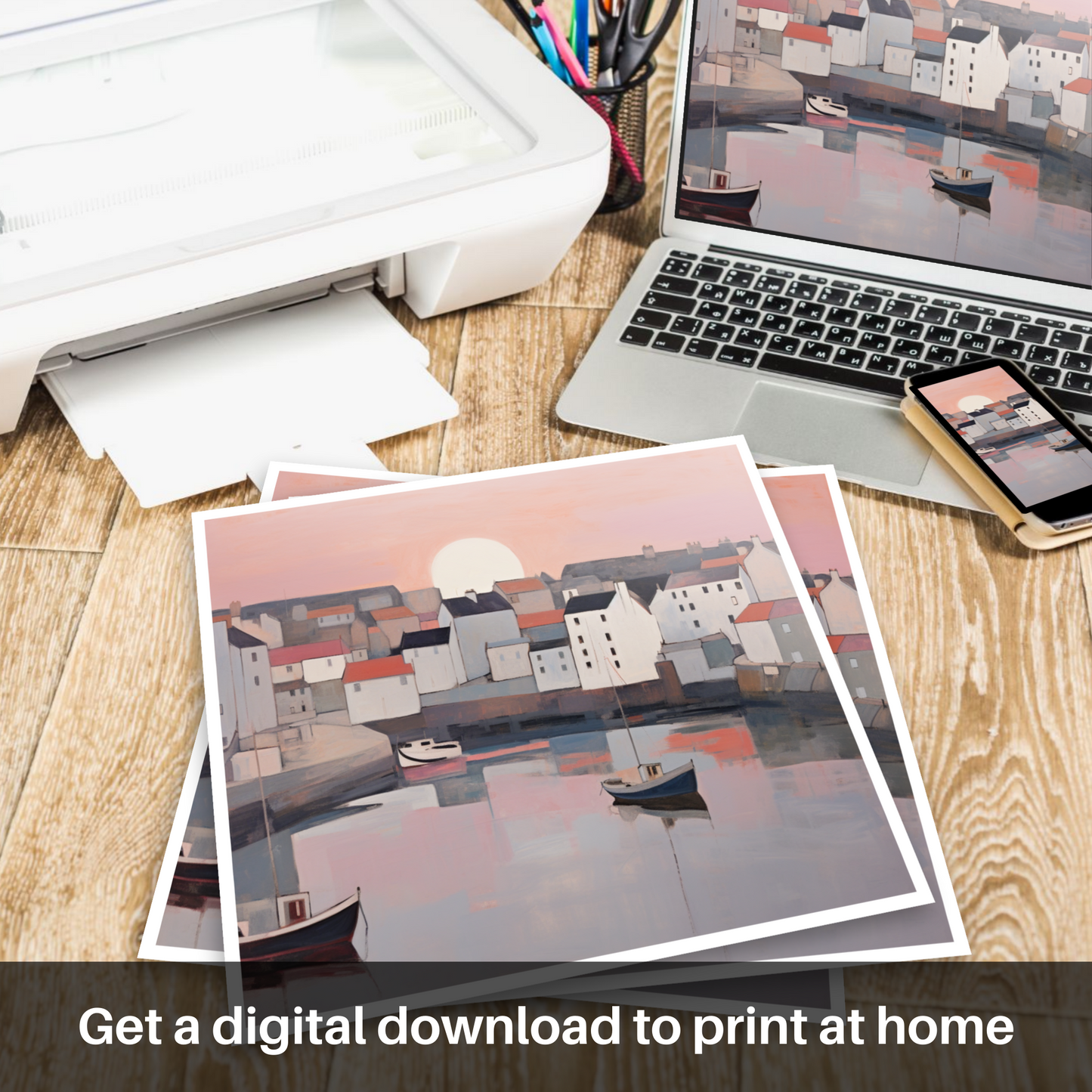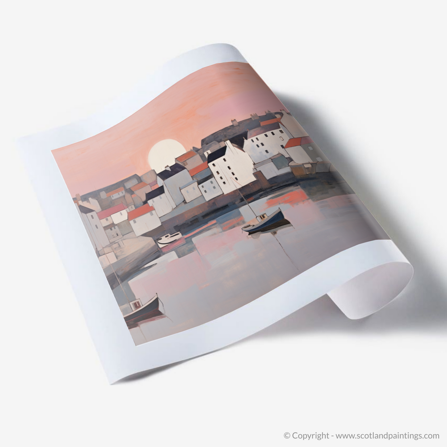 As the day's soft glow gives way to the tranquil allure of twilight, this evocative abstract print captures the serene beauty of Pittenweem Harbour bathed in the gentle hues of sunset. Subtle, muted pinks in the sky mingle with lavender and peach, reflecting upon the placid waters below and bestowing a dreamy warmth upon the scene. Stylised, geometric buildings seem to nestle together, their distinct shapes suggesting the quaint architecture for which Scottish harbours are cherished.