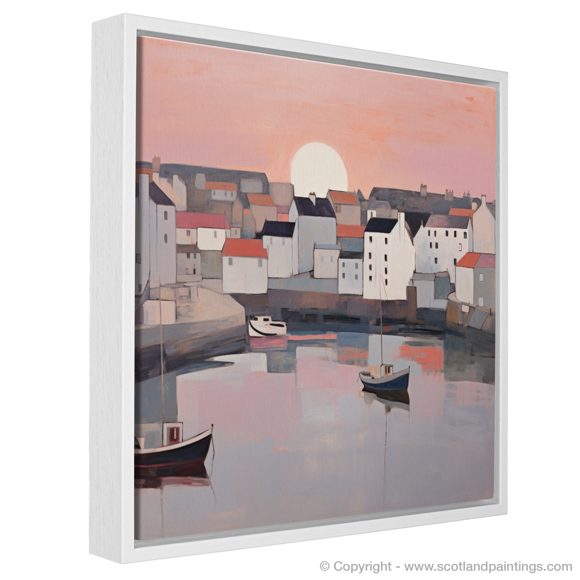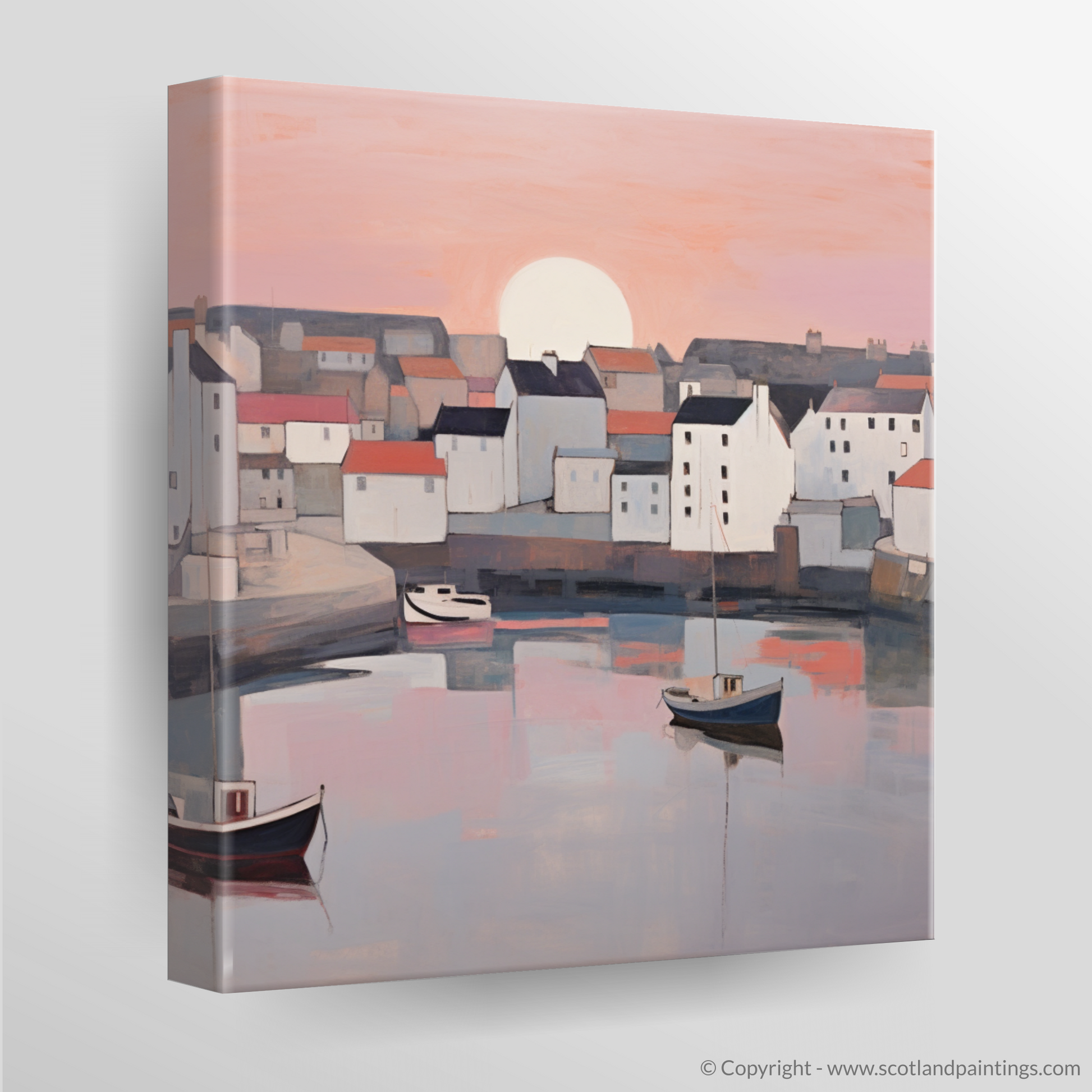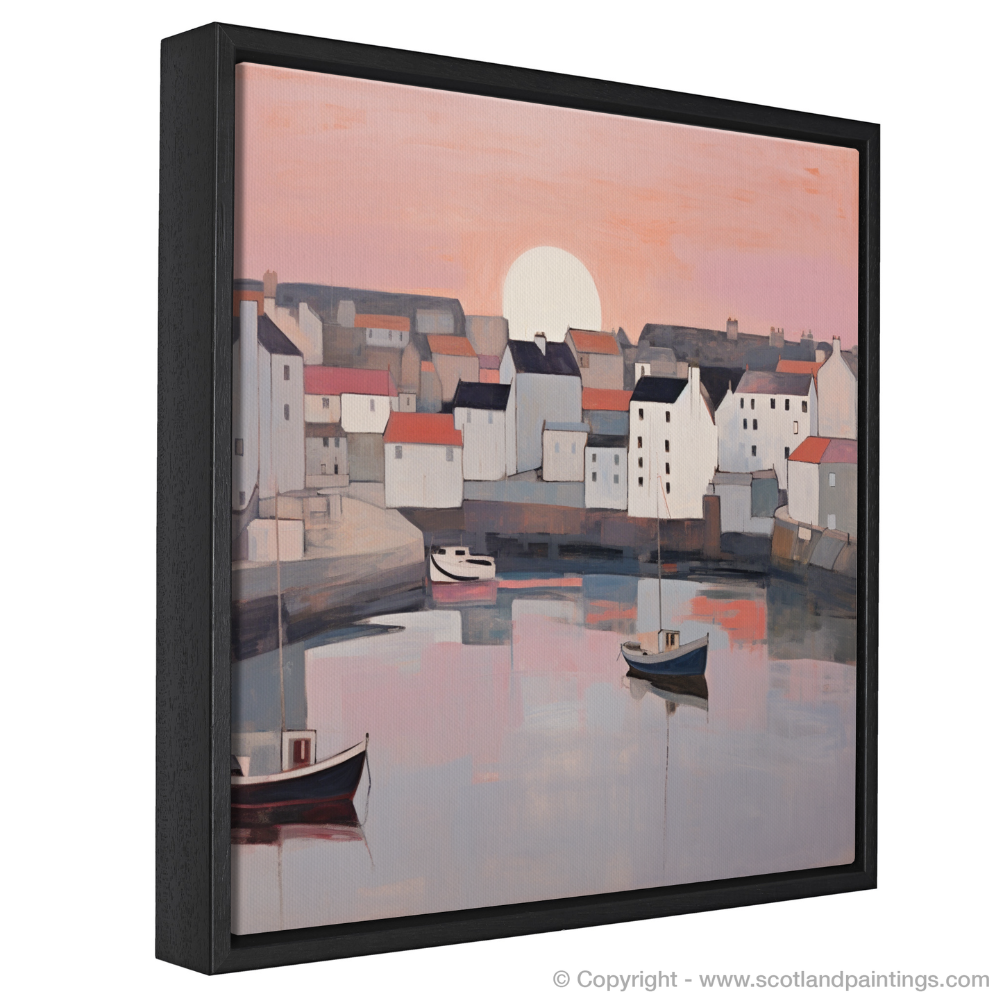 As the day's soft glow gives way to the tranquil allure of twilight, this evocative abstract print captures the serene beauty of Pittenweem Harbour bathed in the gentle hues of sunset. Subtle, muted pinks in the sky mingle with lavender and peach, reflecting upon the placid waters below and bestowing a dreamy warmth upon the scene. Stylised, geometric buildings seem to nestle together, their distinct shapes suggesting the quaint architecture for which Scottish harbours are cherished.