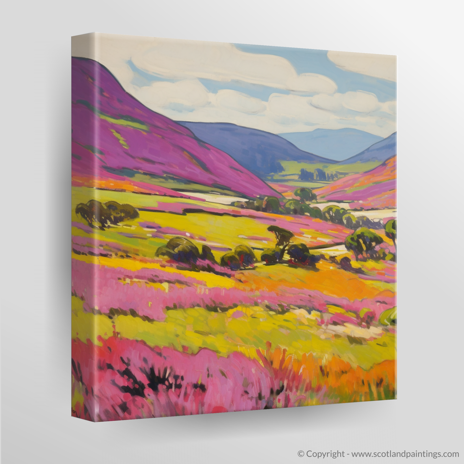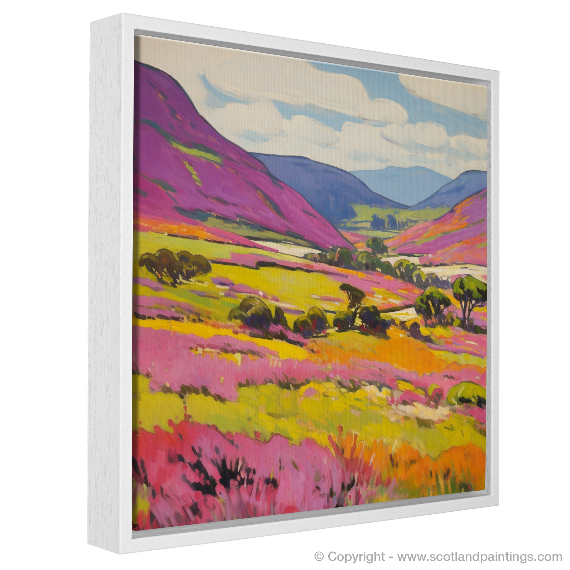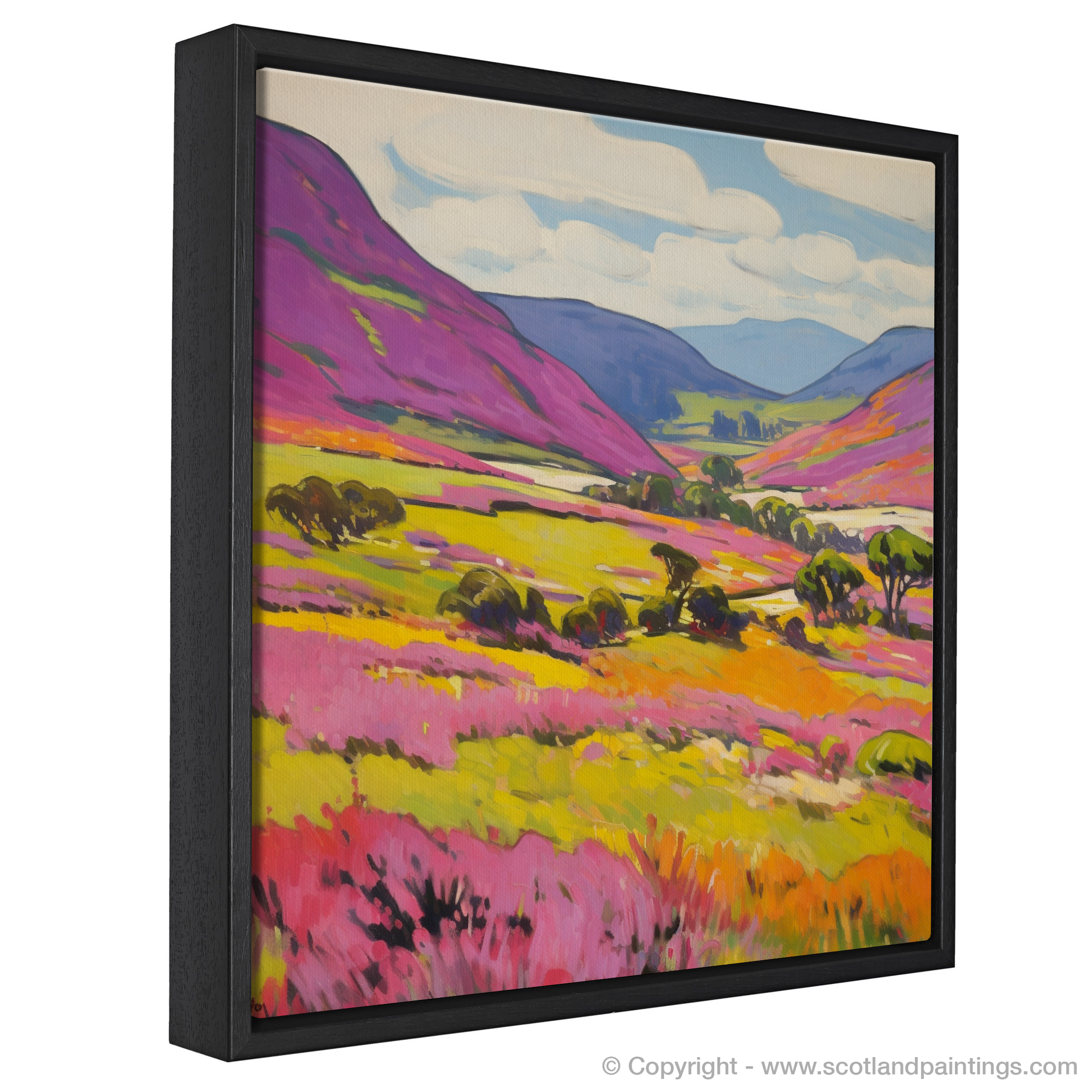 Captured in a vivid array of colours that sing to the soul, this evocative print invites viewers to immerse themselves in the untamed beauty of Aberdeenshire's moorlands. A patchwork of vibrant greens and deep purples blankets the undulating terrain, evoking the lush heather that famously adorns the hills of Braemar. Each brushstroke is charged with life, imbuing the scene with a wildness that is both electric and stirring.