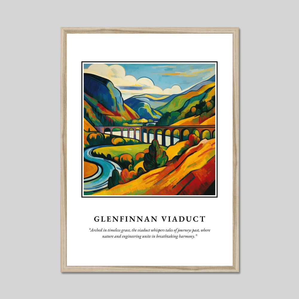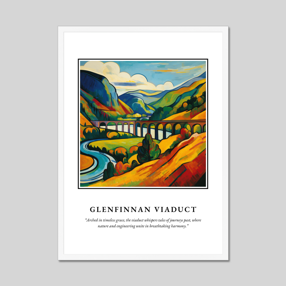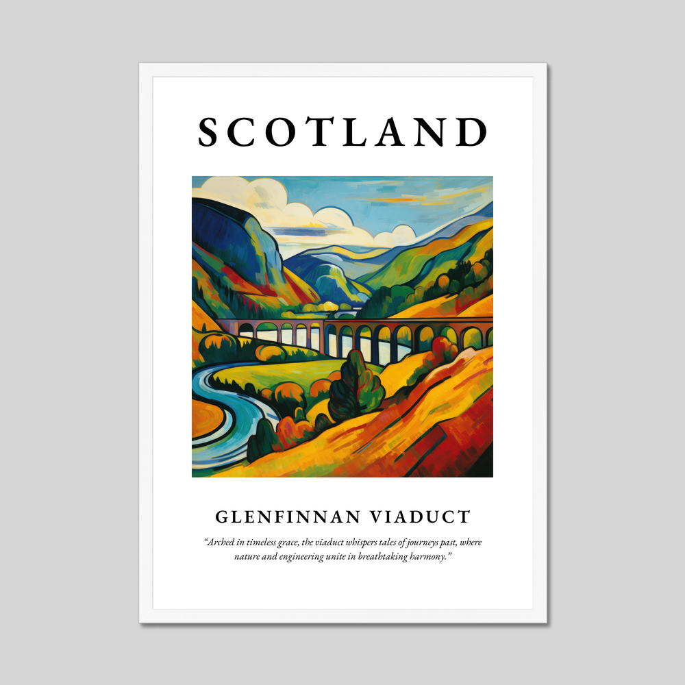 At the top, "SCOTLAND" commands attention in bold lettering, inviting you to delve deeper into the evocative scene below. The Fauvist painting of the Glenfinnan Viaduct bursts with vivid colours and dynamic brushstrokes, capturing the vibrant essence of this iconic landmark. Beneath the image, the quote, “Arched in timeless grace, the viaduct whispers tales of journeys past, where nature and engineering unite in breathtaking harmony,” enriches the narrative, inspiring a sense of wonder and nostalgia.