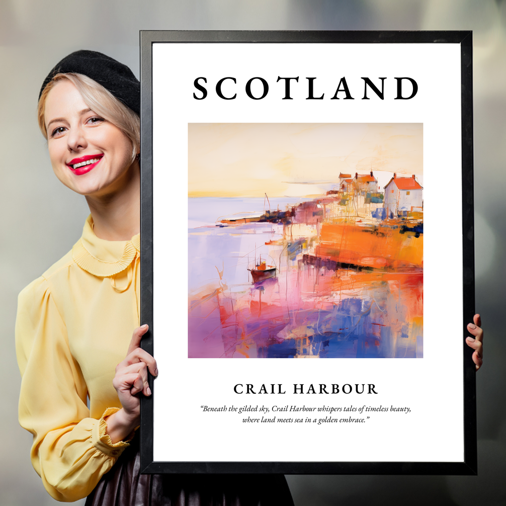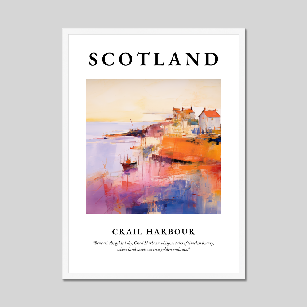 Adorning the top of the poster, “SCOTLAND” is emblazoned in bold lettering, proudly proclaiming your love for this enchanting country. Below, an abstract painting of Crail Harbour dances across the canvas, bathed in a palette of soft pastels and vivid hues. The composition captures the essence of a serene harbour nestled under a gilded sky, where vibrant splashes of colour evoke the tranquil yet lively allure of this historic locale. Beneath the artwork, the heartfelt quote: “Beneath the gilded sky, Crail Harbour whispers tales of timeless beauty, where land meets sea in a golden embrace.” perfectly encapsulates the magic that resonates from the scene.