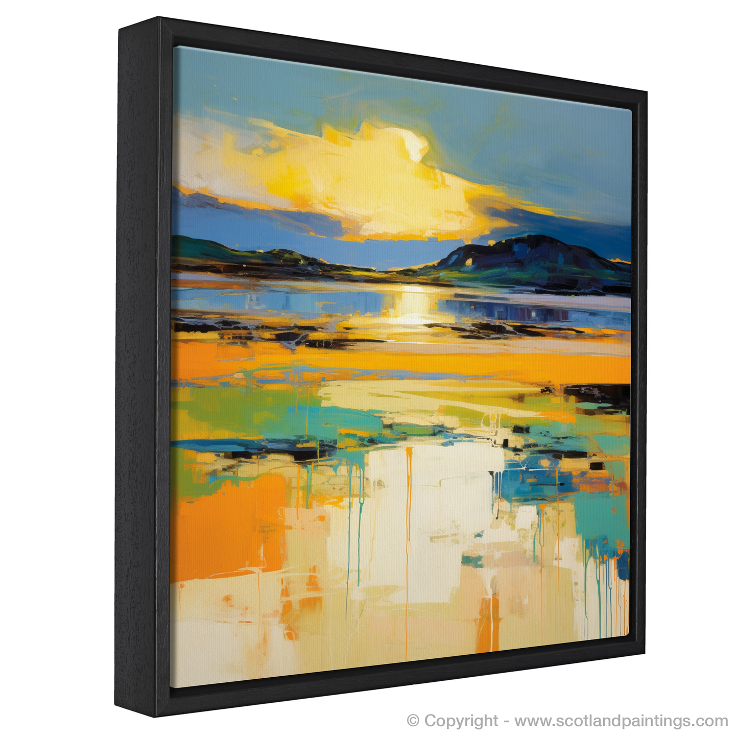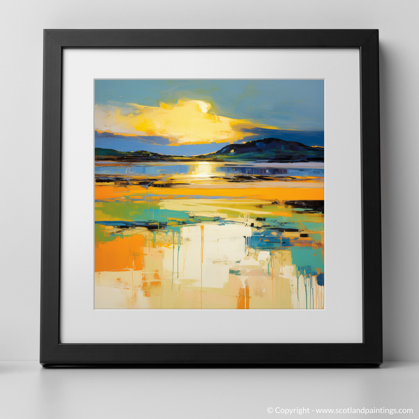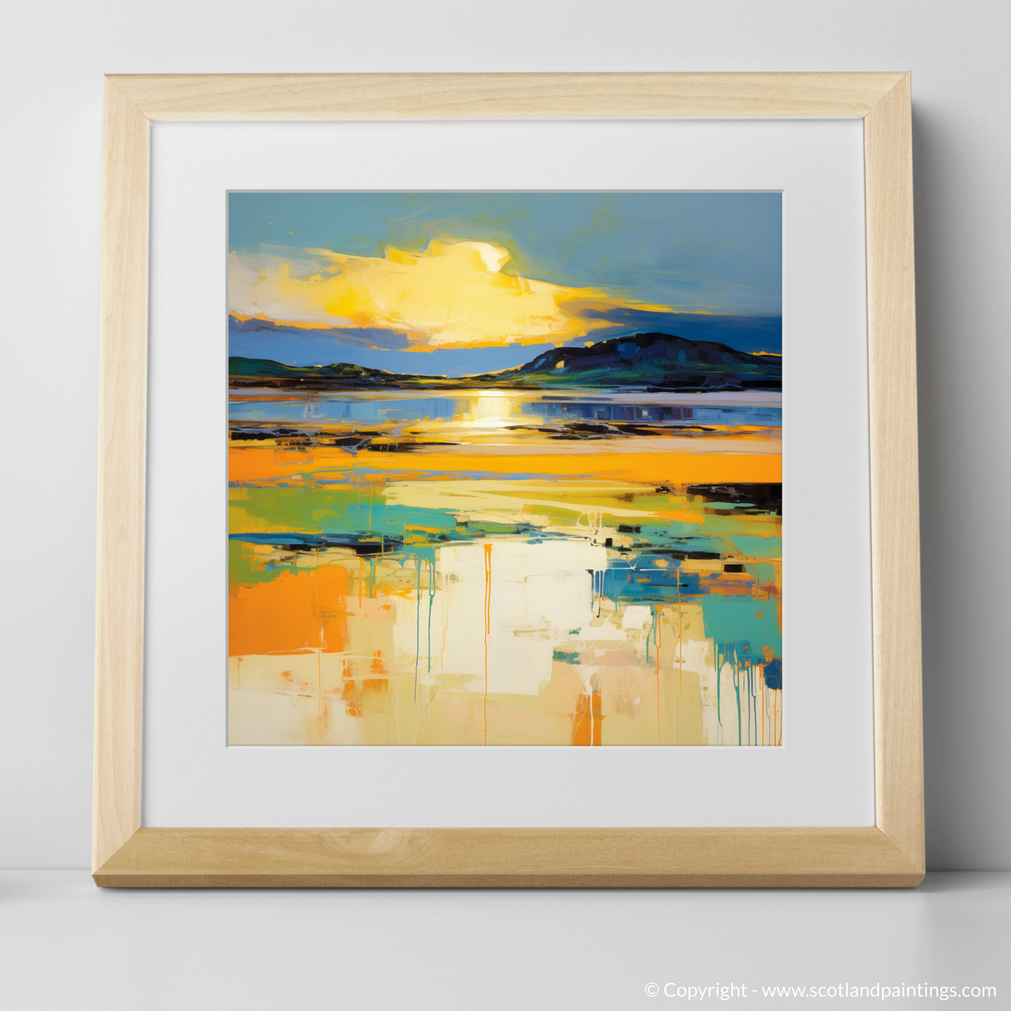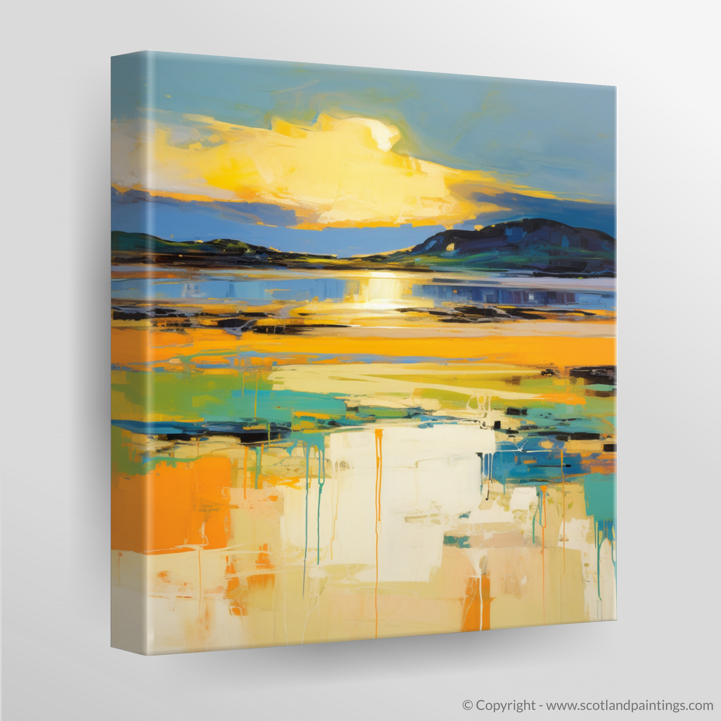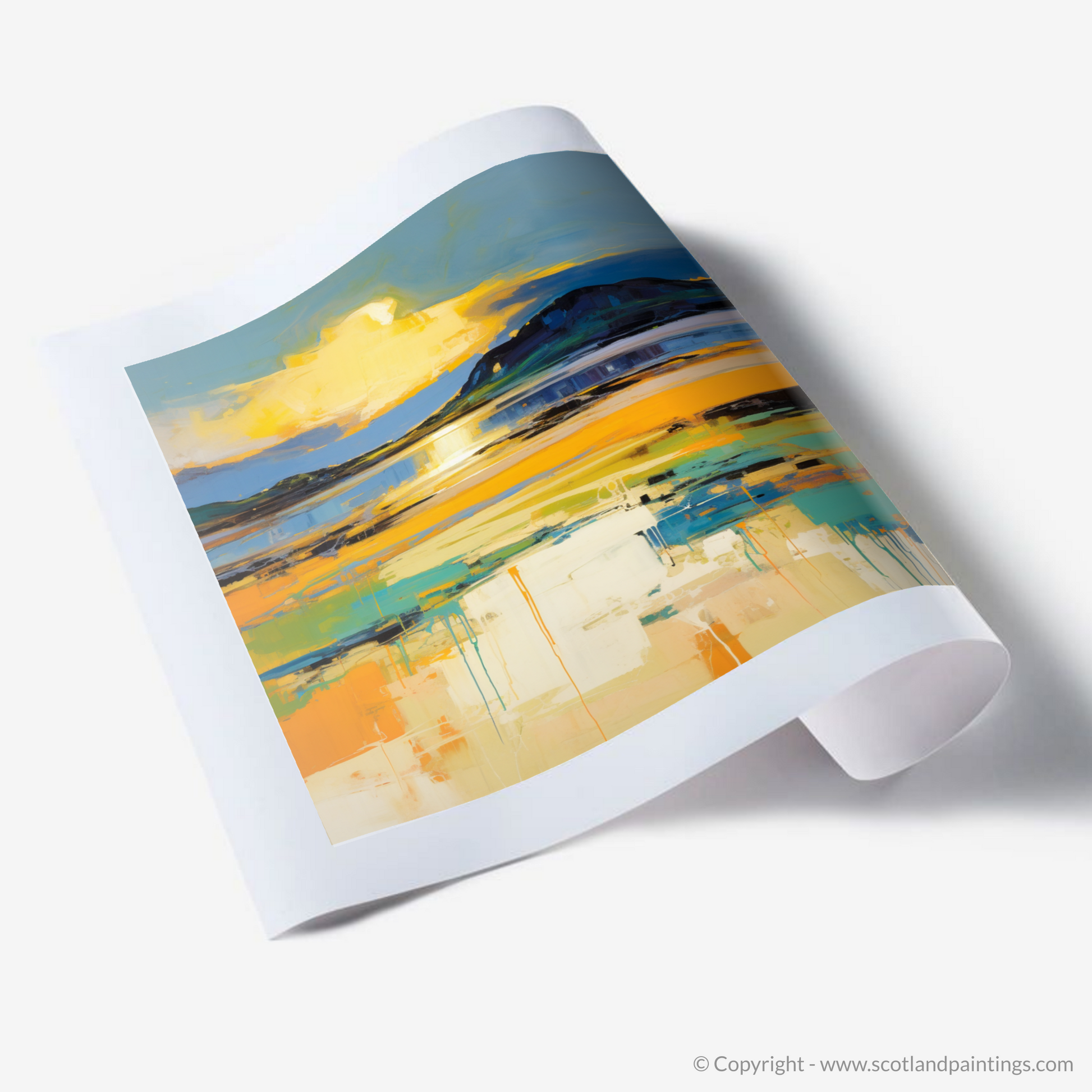 As the day's golden light fades into twilight, the essence of Traigh Mhor is vividly captured in this evocative abstraction. Swathes of bold orange and yellow hues dance across the canvas, reflecting the sun's last embrace, while the cool azure and gentle emerald tones hint at the tranquil sea washing over the Scottish cove. Each brushstroke and textured layer in this piece weaves an intricate story of the rugged shoreline, marrying the wild serenity of the land with the tumultuous beauty of the water.