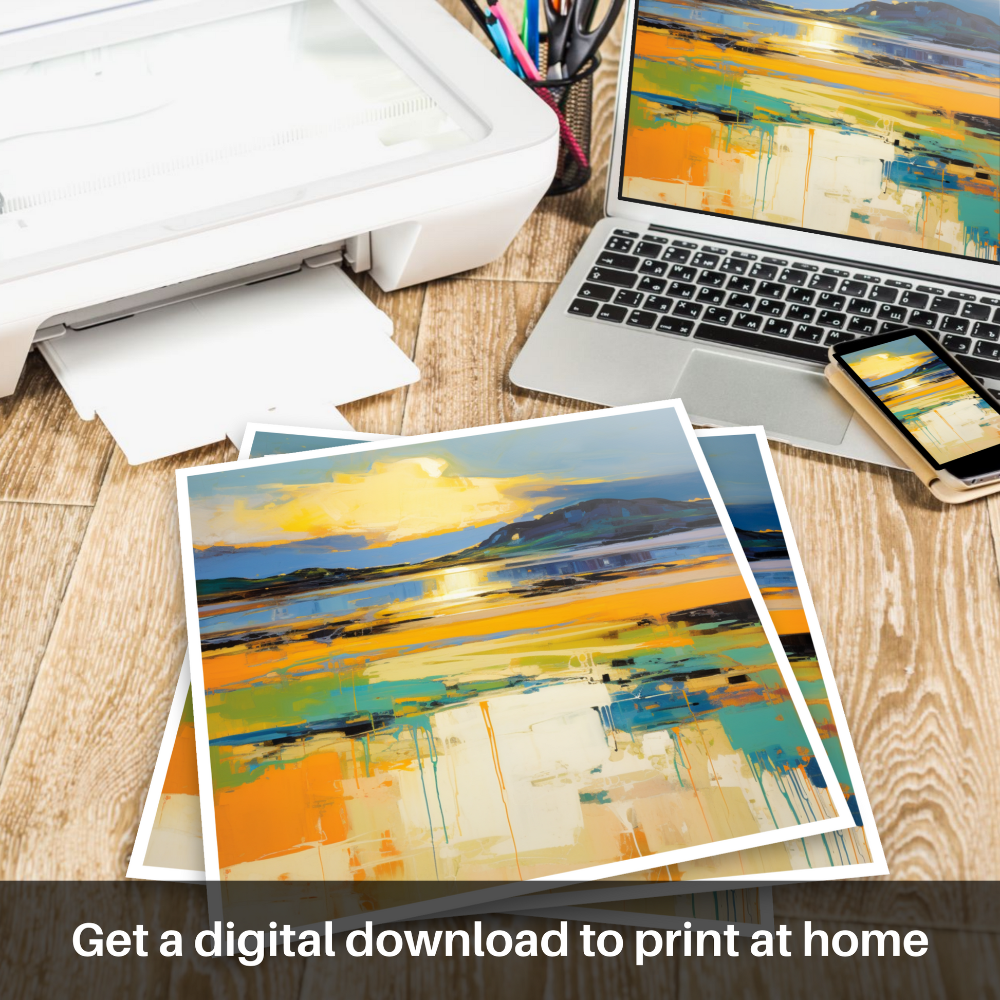 This vibrant piece, rich in texture and movement, is a testament to the captivating allure of Scotland's coastal landscapes. It is a tribute to the profound quietude and introspection that such natural beauty can inspire. Ideal for those who cherish the rugged charm of Scottish coves and the meditative power of abstract art, this print is an invitation to immerse oneself in the sublime majesty of nature's palette at the day's most magical hour.
