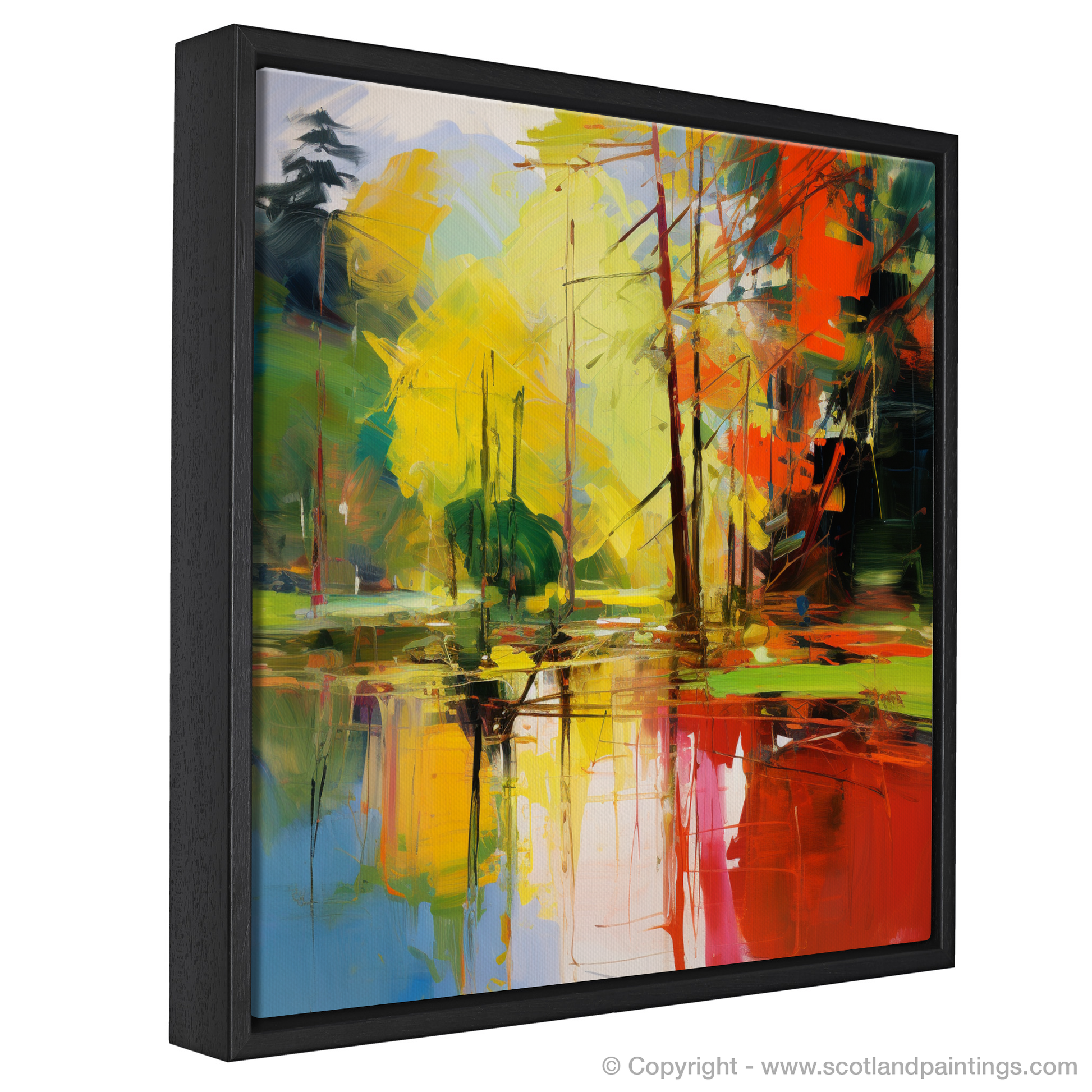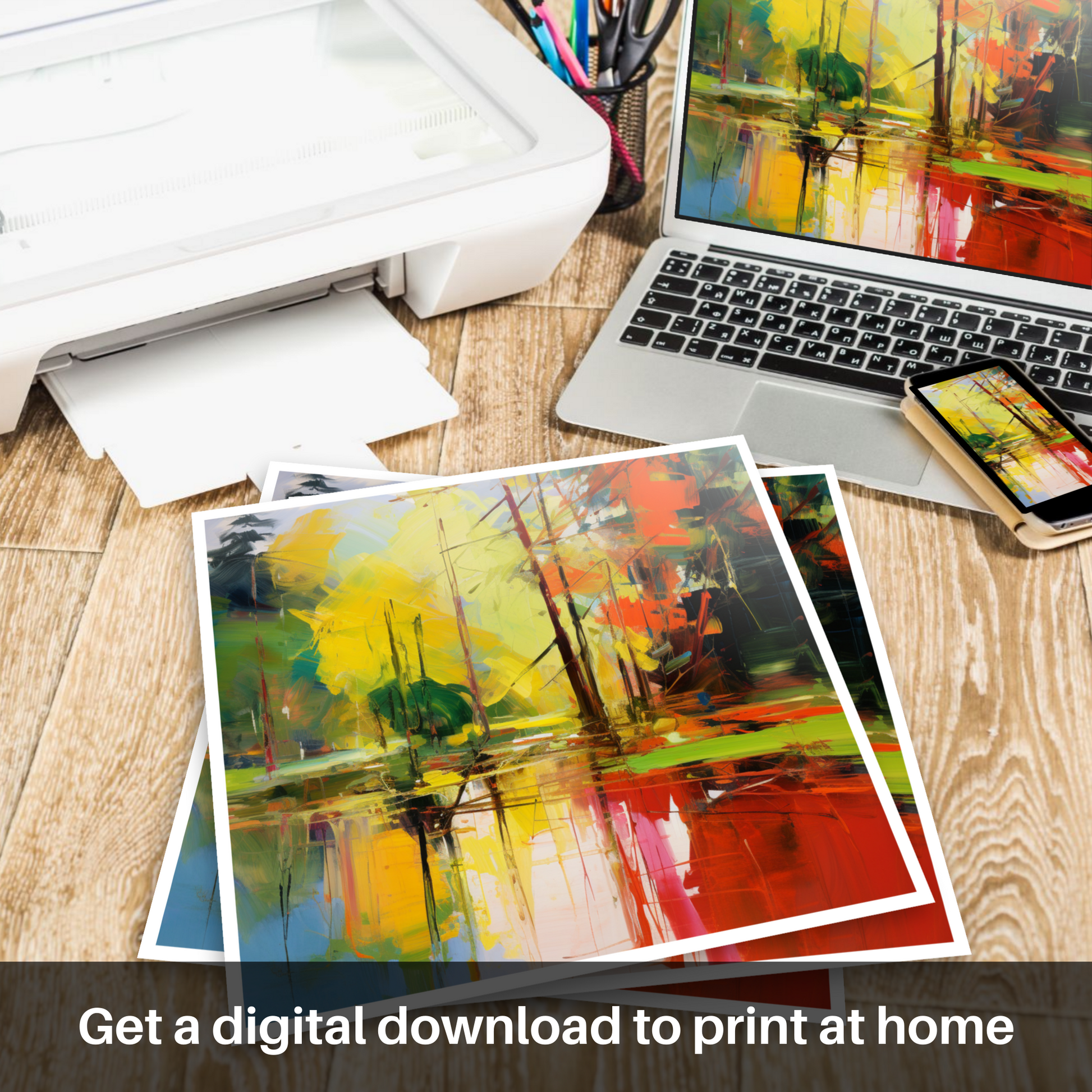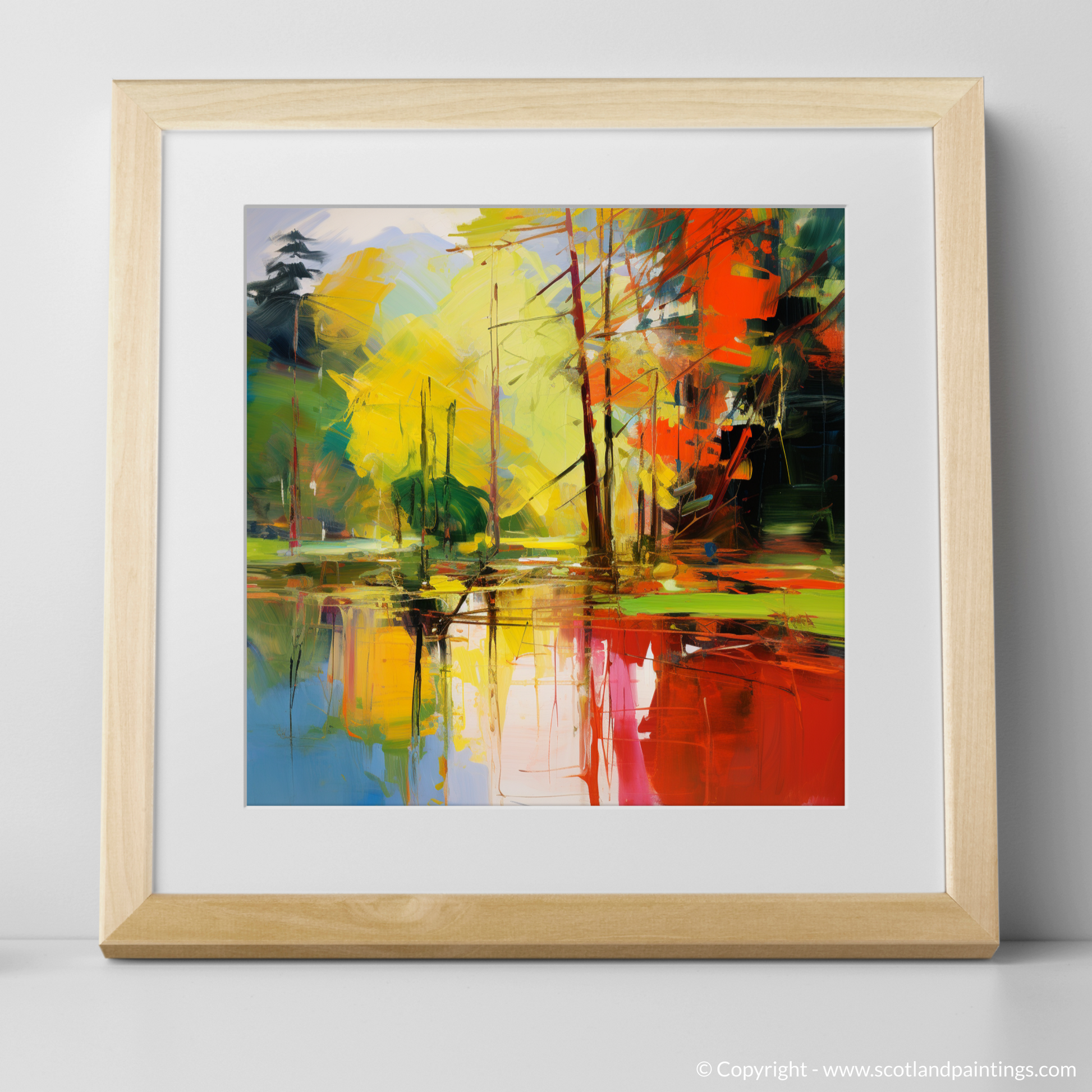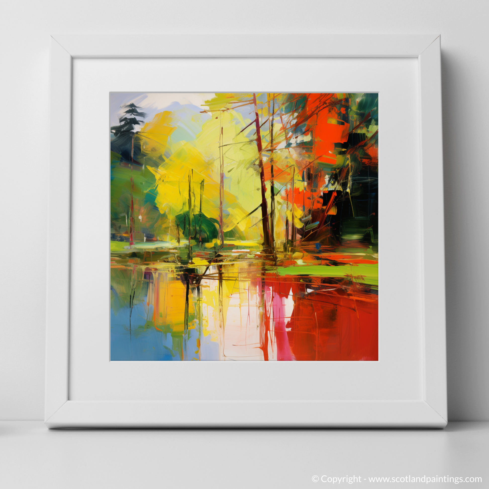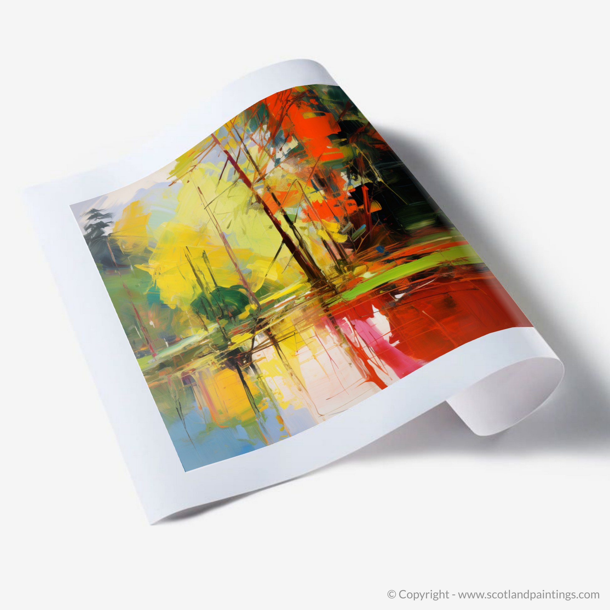 Immerse yourself in the vivid splendour of a Scottish forest, as realised through the dynamic strokes and vibrant palette of abstract expressionism. This compelling print captures the essence of Beecraigs Country Park, a natural jewel nestled in West Lothian, through an intoxicating blend of form and colour that dances across the canvas with wild abandon.