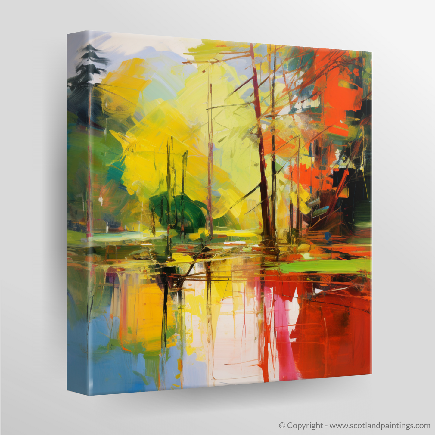 The pulsating energy of the piece is palpable, with a symphony of fiery reds, bright yellows, and deep greens swirled together to evoke the unpredictable beauty of the forest. Streaks of bold colour suggest the sun-dappled woodland canopy, while darker tones hint at the concealed depths beneath. The gestural brushstrokes dynamically convey movement, as if a gentle breeze whispers through the trees, shaking leaves and rippling the surface of an unseen loch.