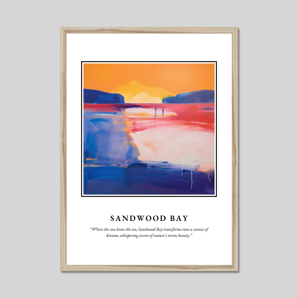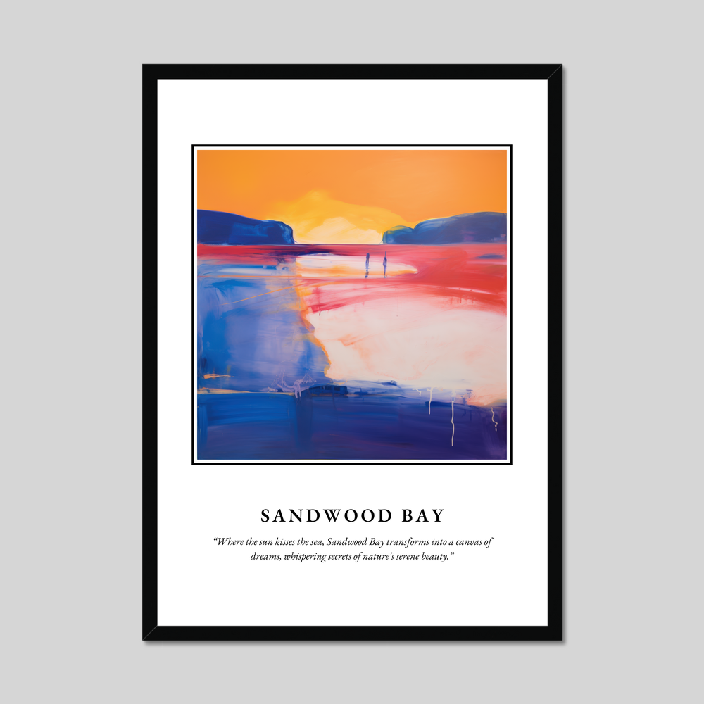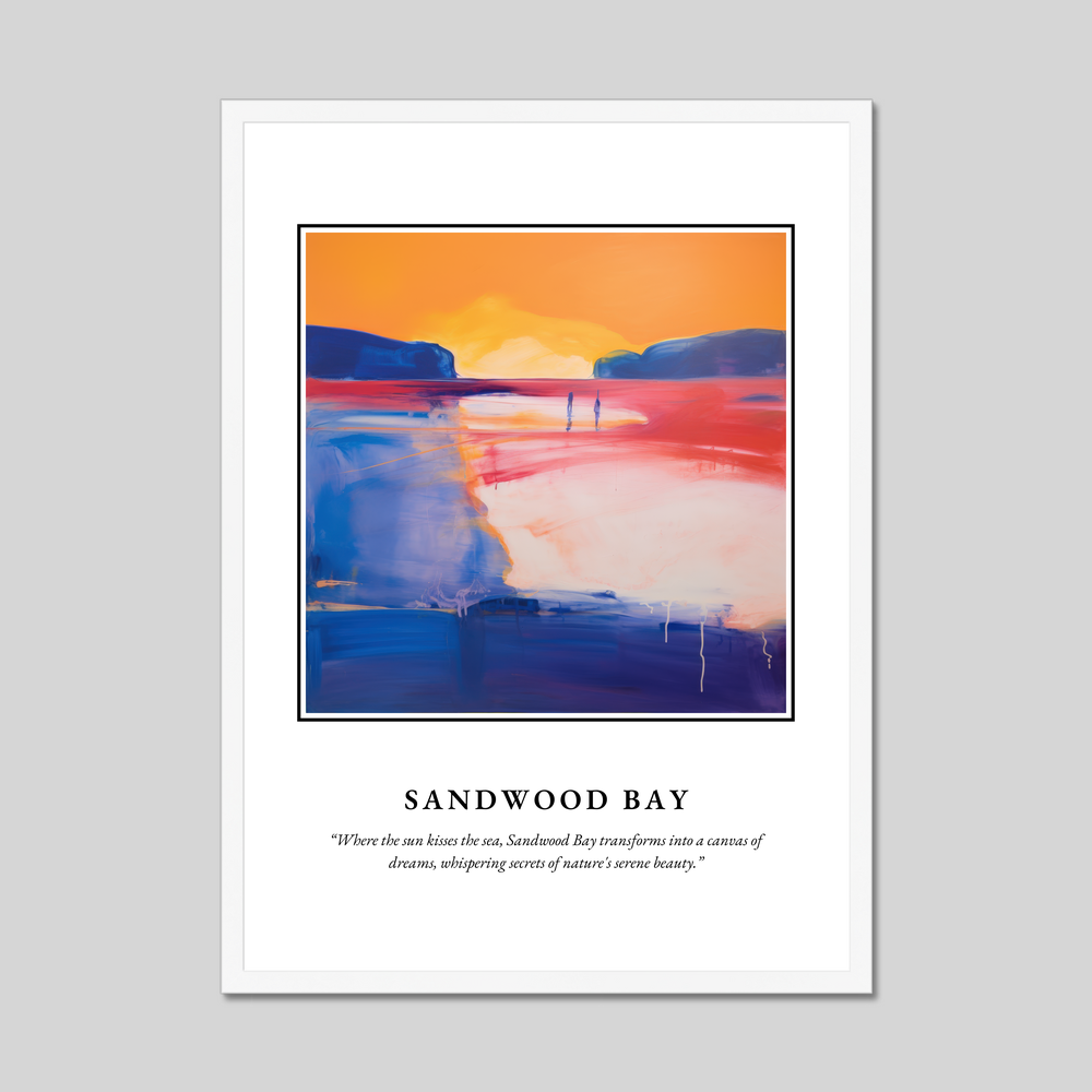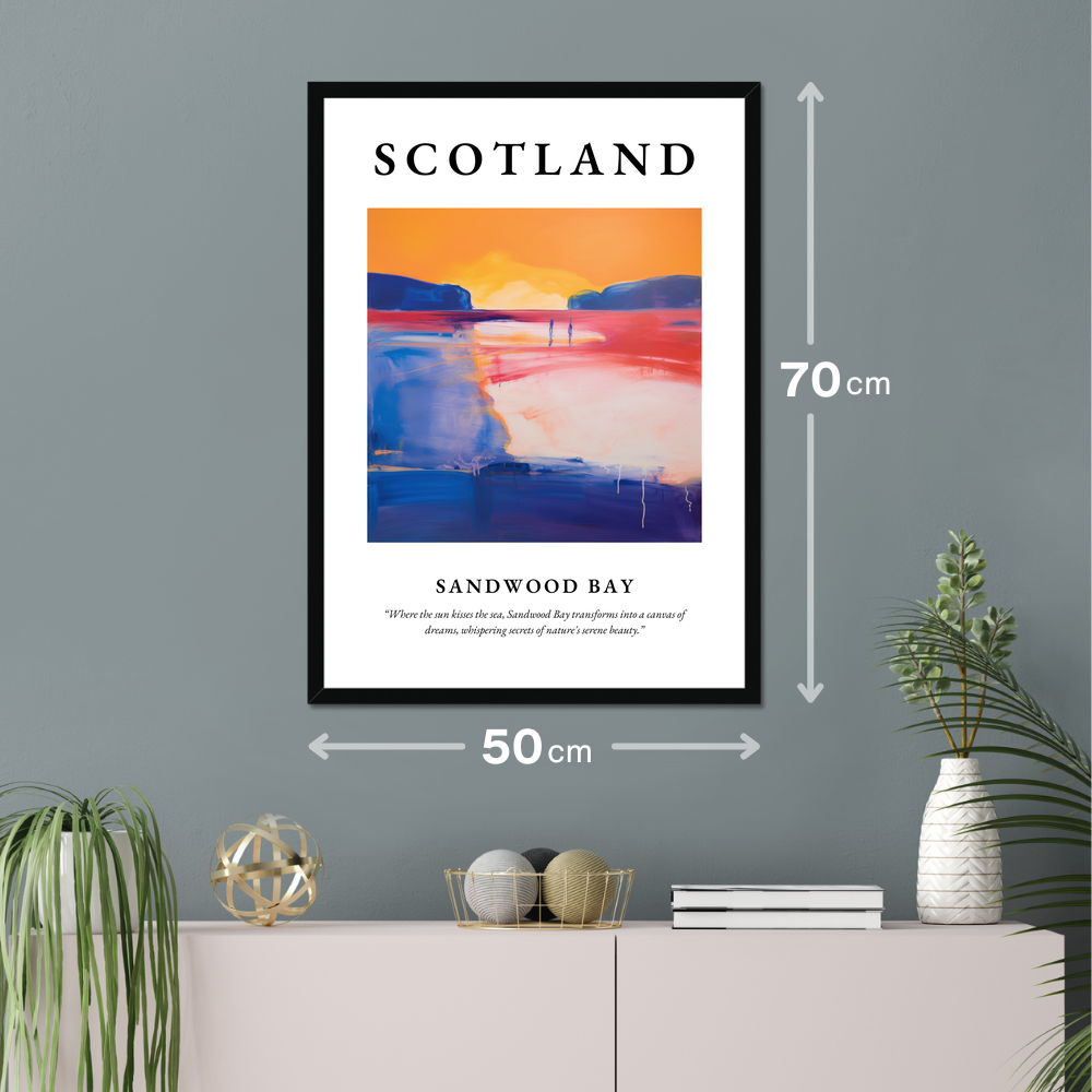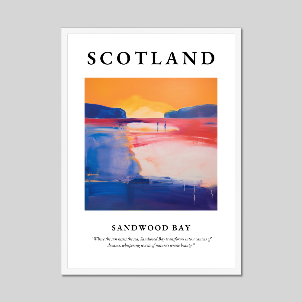 Immerse yourself in the ethereal allure of Sandwood Bay with our stunning 50cm x 70cm framed poster print. Adorned with the bold proclamation "SCOTLAND" at the top, this visually captivating piece captures the dramatic essence of one of Scotland's most picturesque beaches. Set in an abstract style, the artwork transforms the natural beauty of Sandwood Bay into a dreamlike vision. The painting’s vibrant colours and fluid forms seamlessly blend the sea and sky, creating a transcendent landscape filled with dynamic energy and serene beauty. Beneath this visual masterpiece, the evocative quote, “Where the sun kisses the sea, Sandwood Bay transforms into a canvas of dreams, whispering secrets of nature's serene beauty,” further transports you to this magical place.