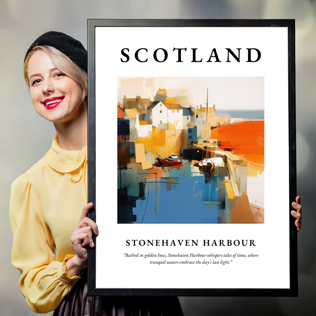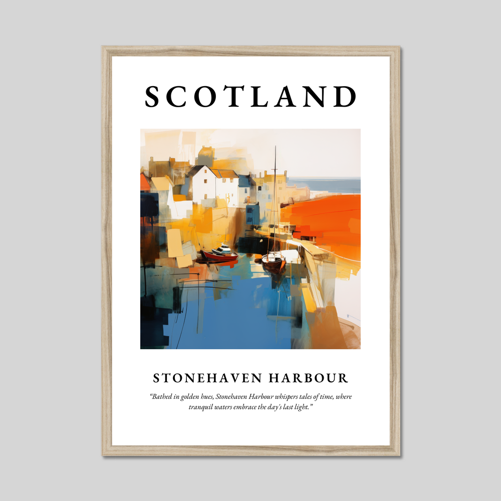 The word "SCOTLAND" boldly crowns the poster, leading the eye to a mesmerising abstract painting of Stonehaven Harbour. This abstract depiction skilfully blends vivid hues and dynamic shapes, suggesting the idyllic serenity and vibrant charm of the harbour. The accompanying evocative quote, “Bathed in golden hues, Stonehaven Harbour whispers tales of time, where tranquil waters embrace the day's last light,” perfectly encapsulates the harbour's ageless allure.