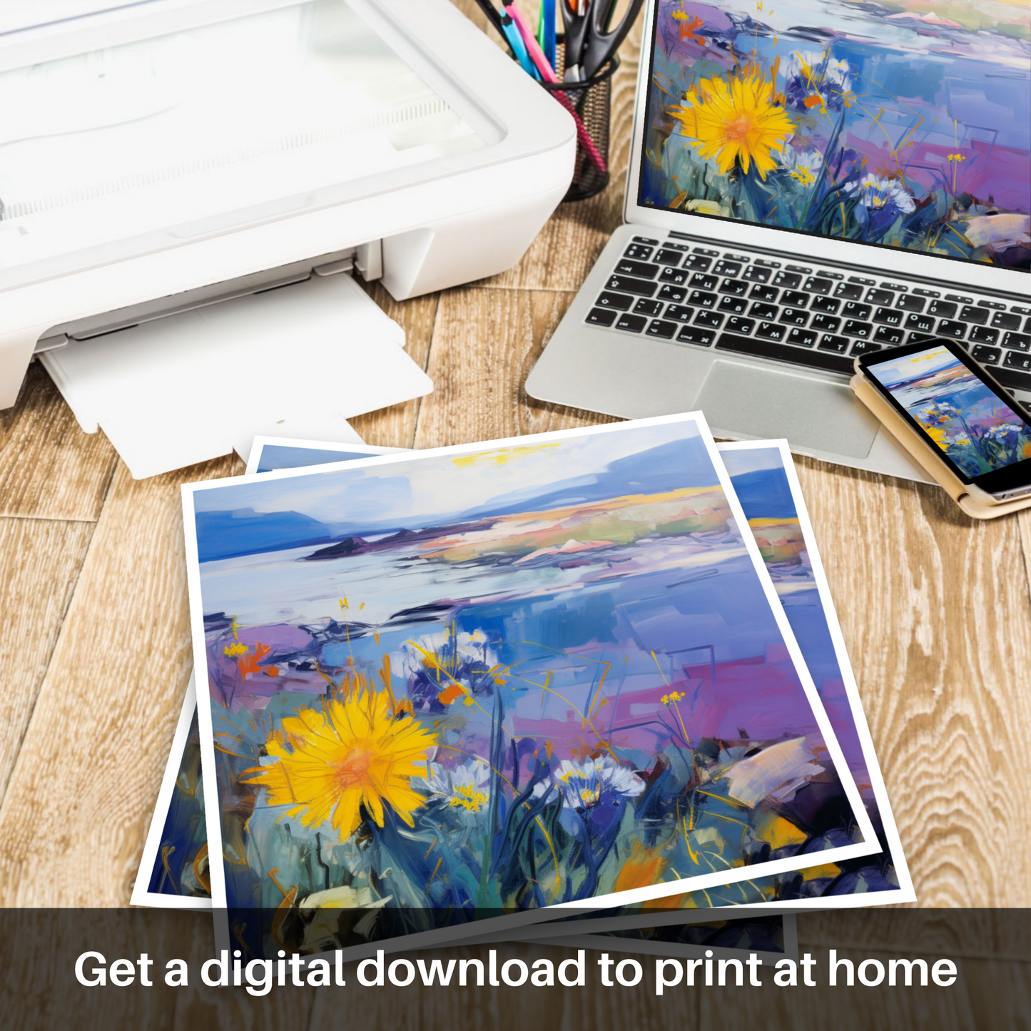 The artwork offers a passionate portrayal of the Scottish flora, masterfully abstracted to capture the viewer's imagination, invoking the rugged charm of the coast and the simple elegance of its native blooms. It's a piece that sings of the untamed wilds and the raw beauty to be found within the Scottish Flowers and Flora series. This print promises to bring a sense of Scotland's natural grandeur and artistic wonder to any space it graces.