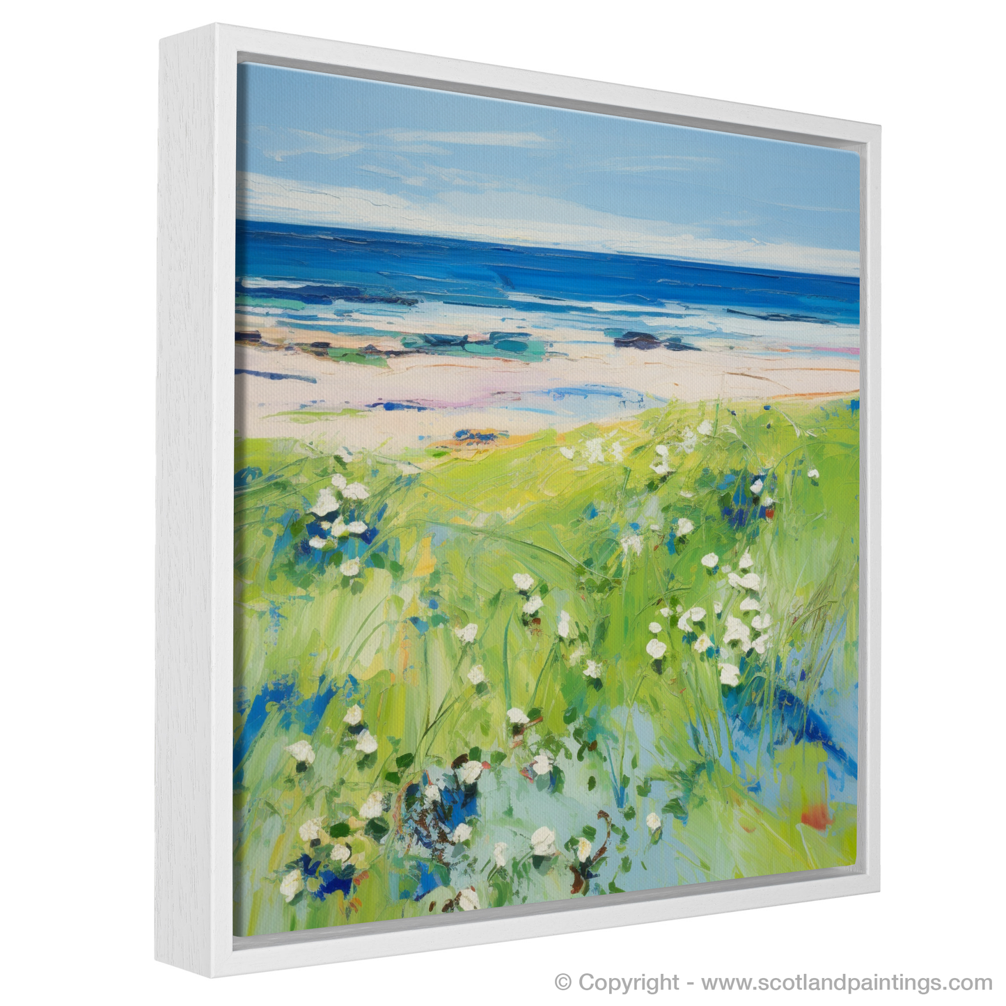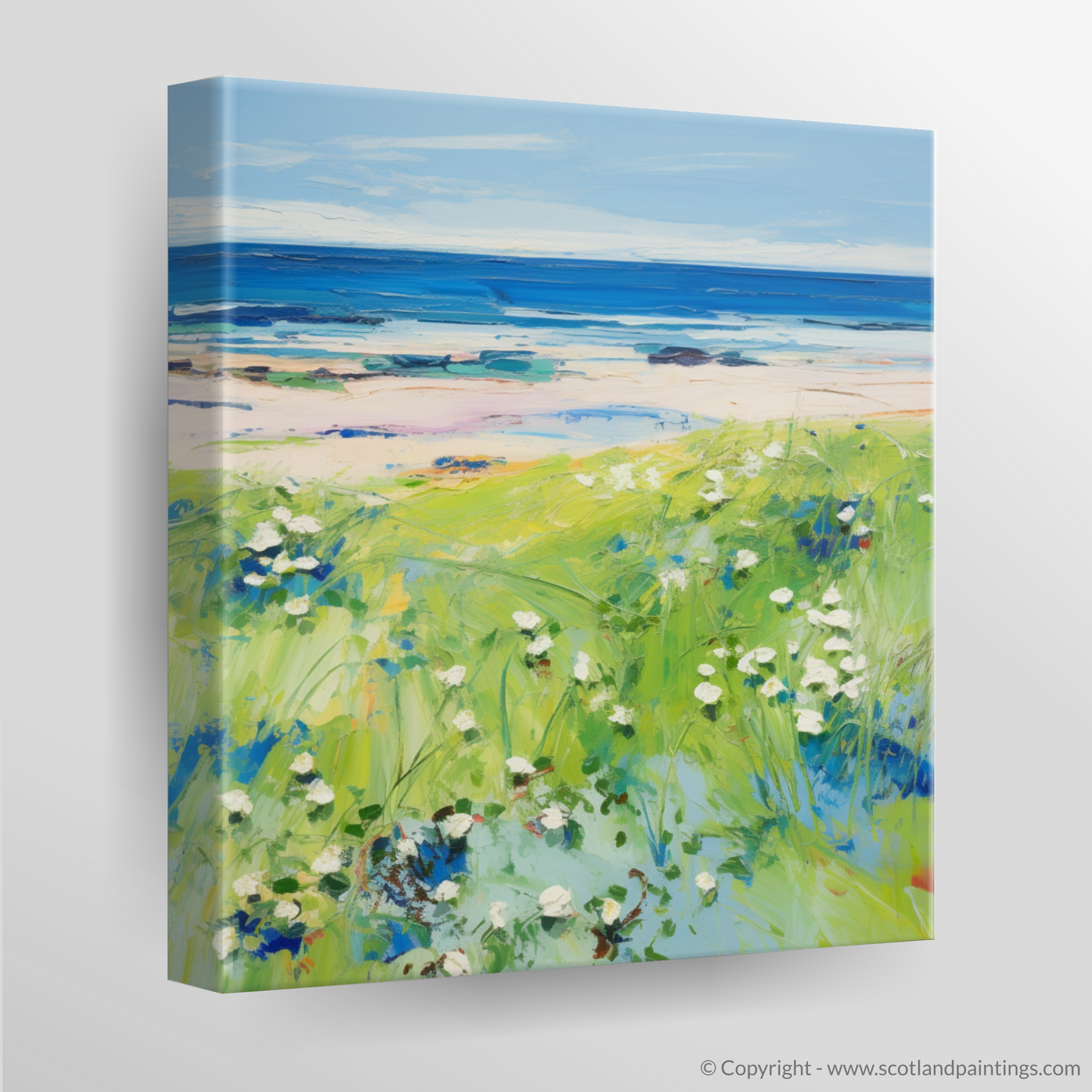 The texture in the piece evokes the roughness of the coastal landscape, with thick, impasto strokes that give a palpable sense of the wild Scottish breeze. Swirls of white and subtle blues reflect the fleeting visits of clouds above, suggesting the dynamic Scottish weather. Pops of colour interweave with the greens, hinting at wildflowers and elements that compose the rich tapestry of the shoreline.