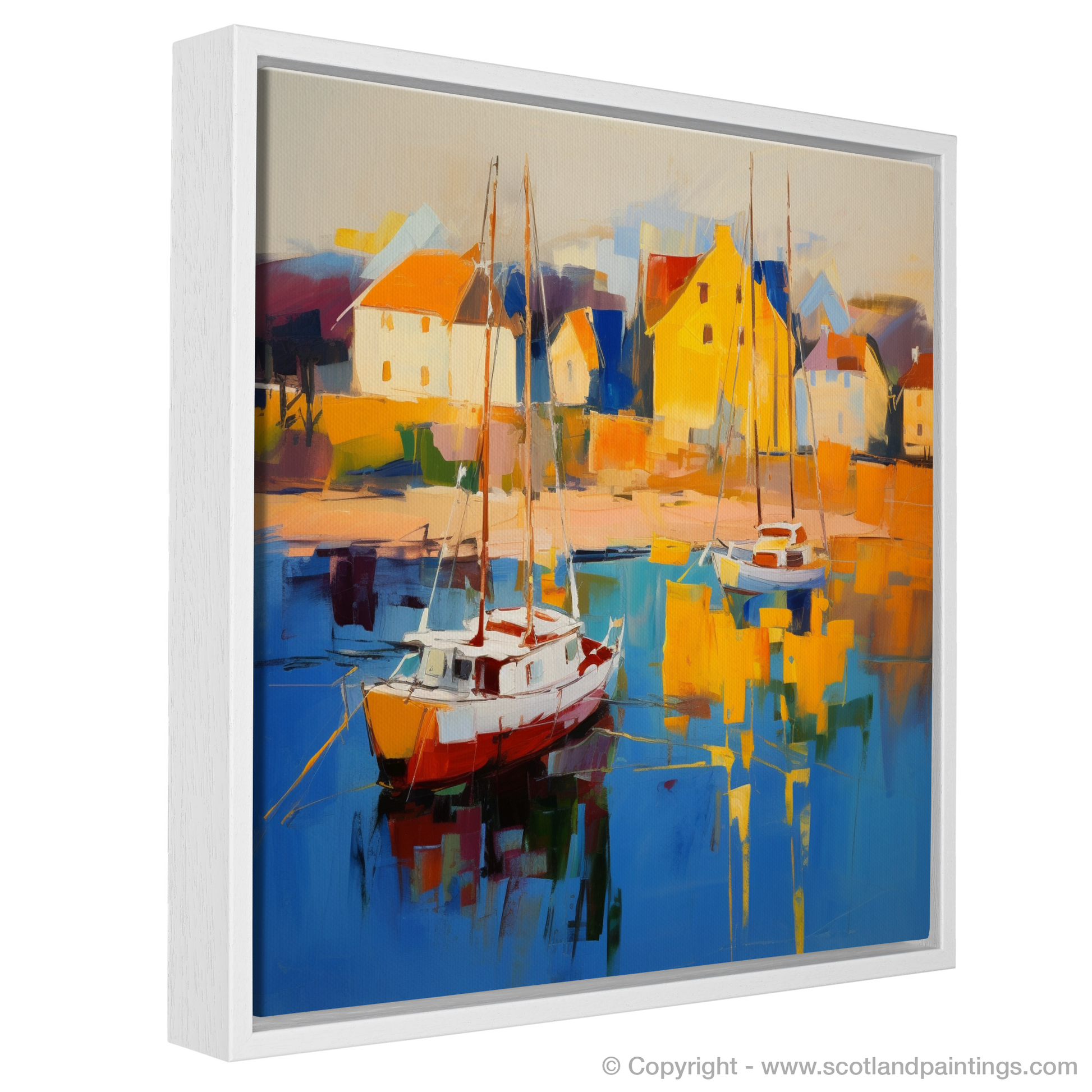Glints of the waning sun dance upon the harbour water, rendered in luminous shades of cobalt and ultramarine that reflect back the moored vessels and the architectural tapestry of buildings behind them. These structures are abstractly depicted, with their essence distilled into geometric forms awash with warm ochres, radiant yellows, and soft whites. The impression is of a harbour quietening as day gives way to dusk, with time itself seeming to slow within the frame.