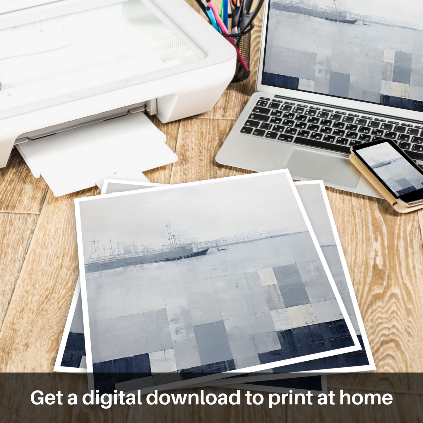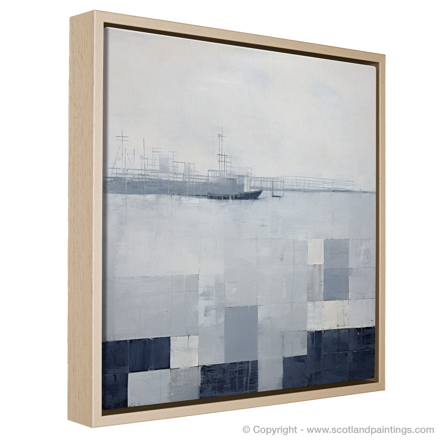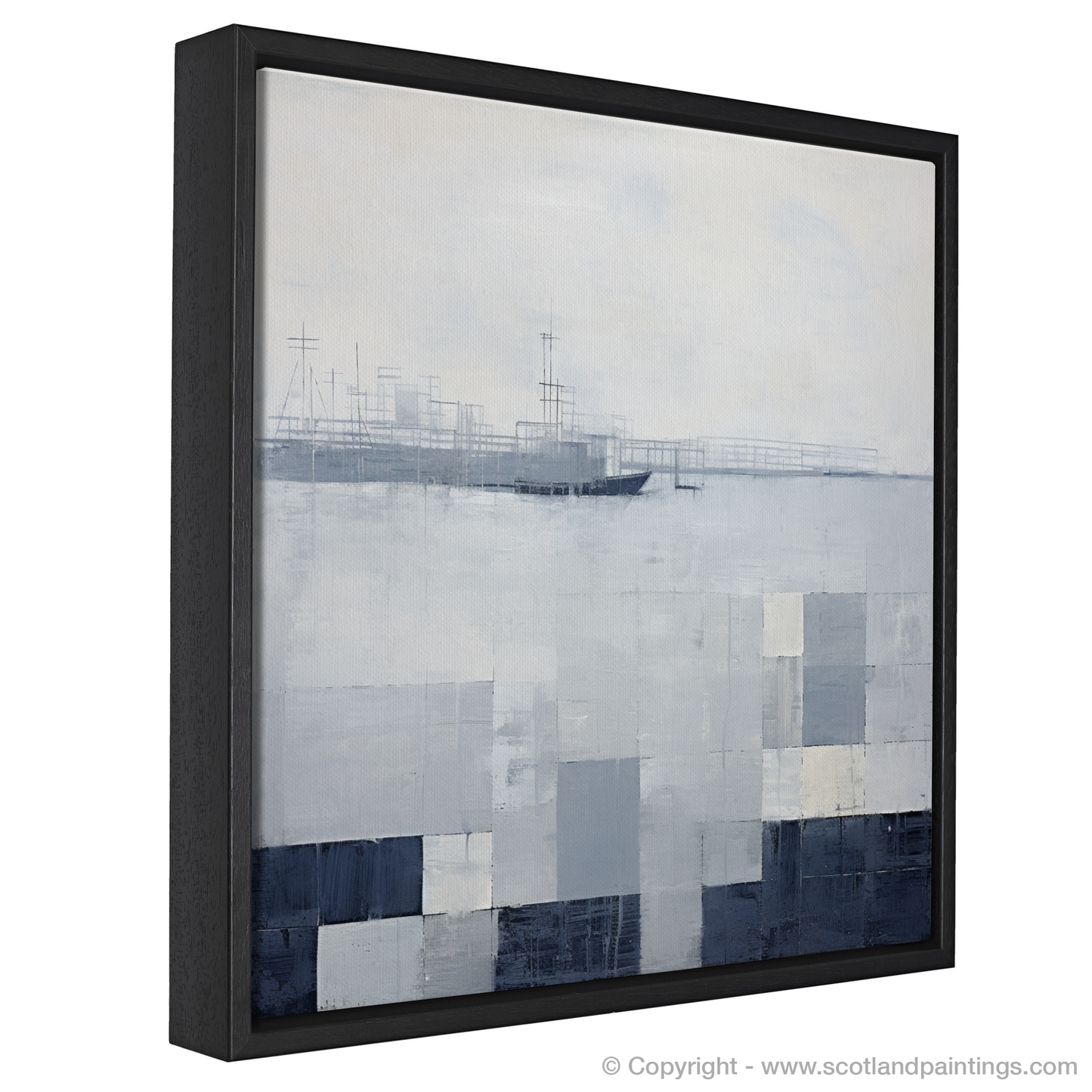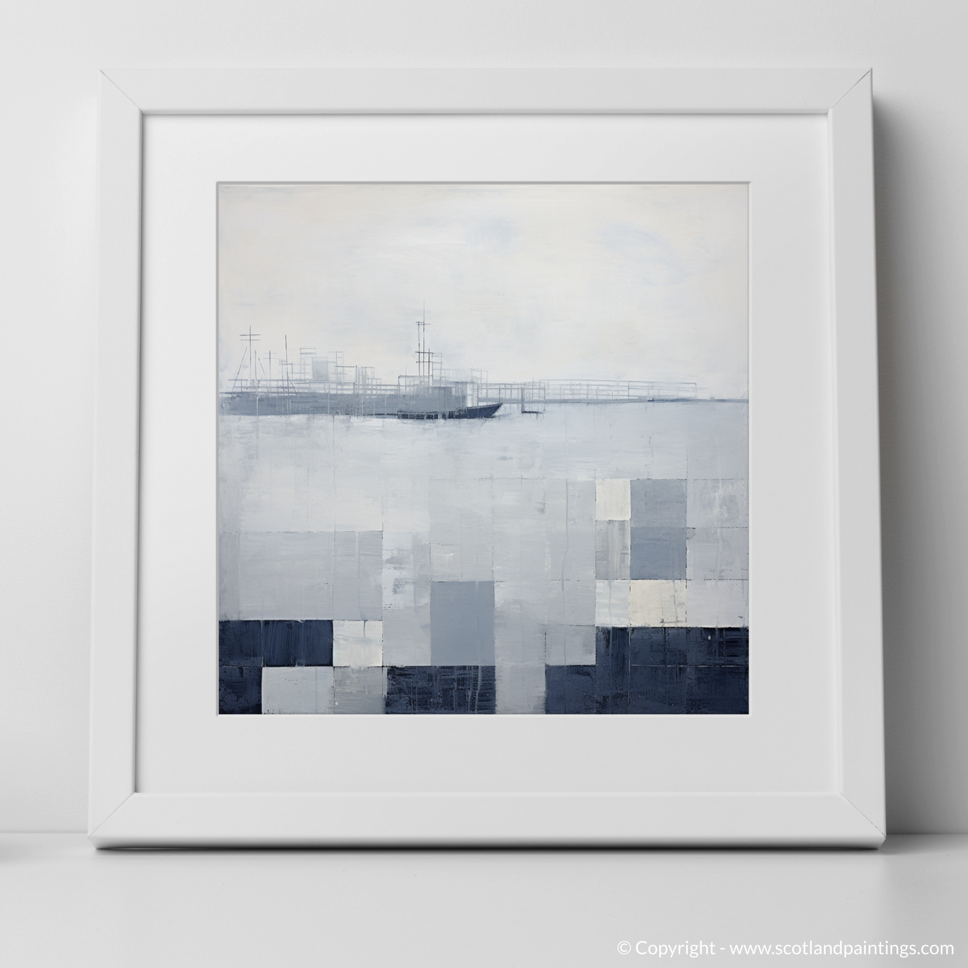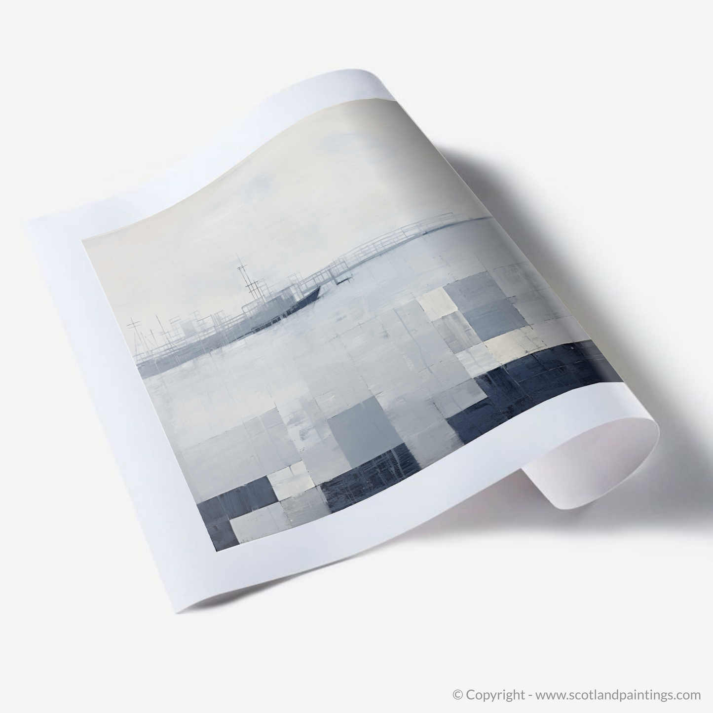 Boats and structures barely emerge from the abstracted forms, suggesting the faint outlines of masts and the harbour's industrial features, fading into the mist of the anticipating squall. The harmonic blend of abstract shapes and maritime elements invokes a sense of mystery and captures the viewer's imagination, nudging them to consider the boundary between the tangible harbour structures and the boundless play of nature's moods. This print stands as a testament to the atmospheric beauty of Scottish Harbours, inviting the observer to reflect on the transient yet timeless dance between sea and sky.