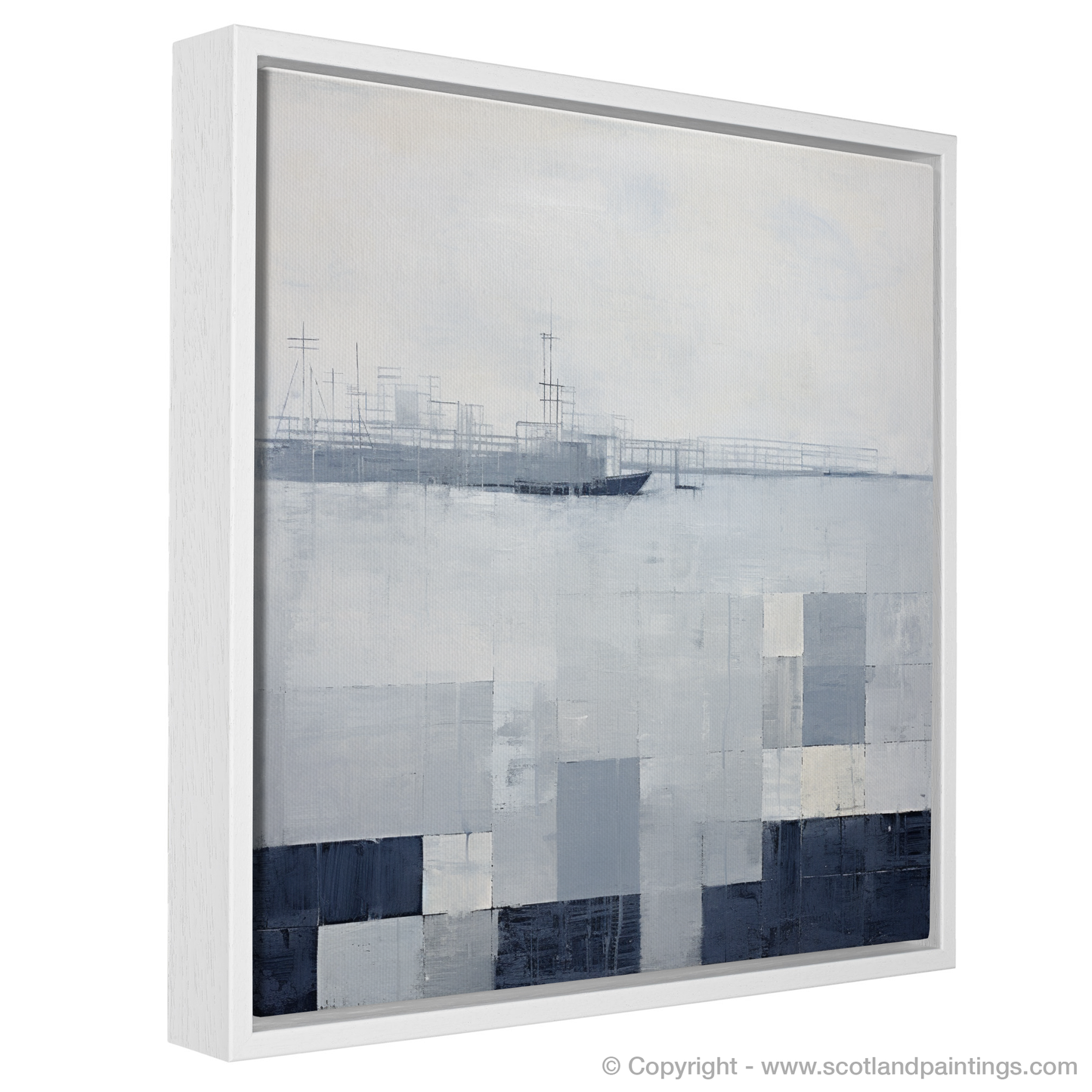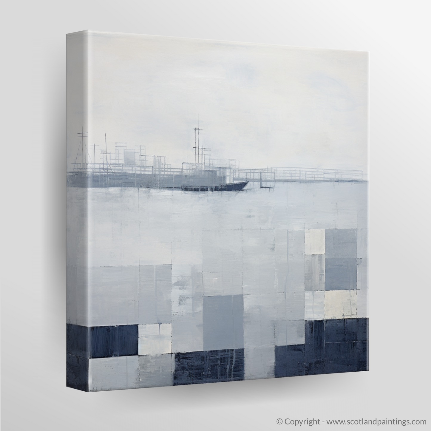 Encapsulating the rugged essence of a storm-brewing over Charlestown Harbour, this evocative abstract print offers a contemporary take on traditional Scottish maritime scenery. A symphony of muted greys and tranquil whites dance across the canvas, capturing the prelude to tempestuous weather with a serene yet dynamic energy. The scene is cleverly partitioned into a series of geometric blocks, each echoing the choppy waters and the tumultuous clouds with textured layers that add depth and movement to the composition.