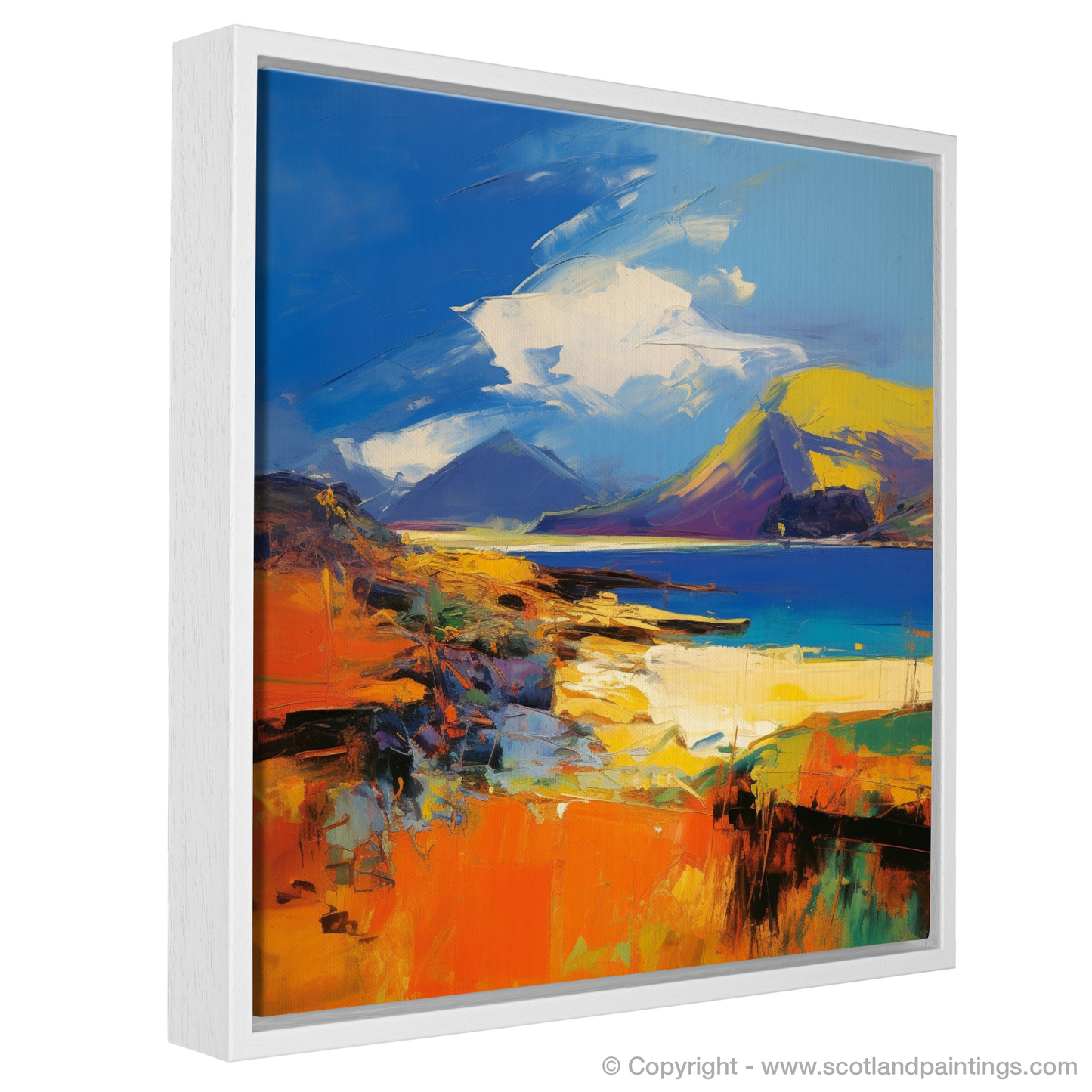 From the deep, resonant blues of the surrounding waters to the fiery hues that ignite the land, each colour seems to dance across the canvas, alive with the light and shadows cast by a sun unseen. Bold yellows, invigorating oranges, and soothing whites reflect the unique harmony of the Scottish landscape, simulating the vivid interplay of land and sea, sky and shore.