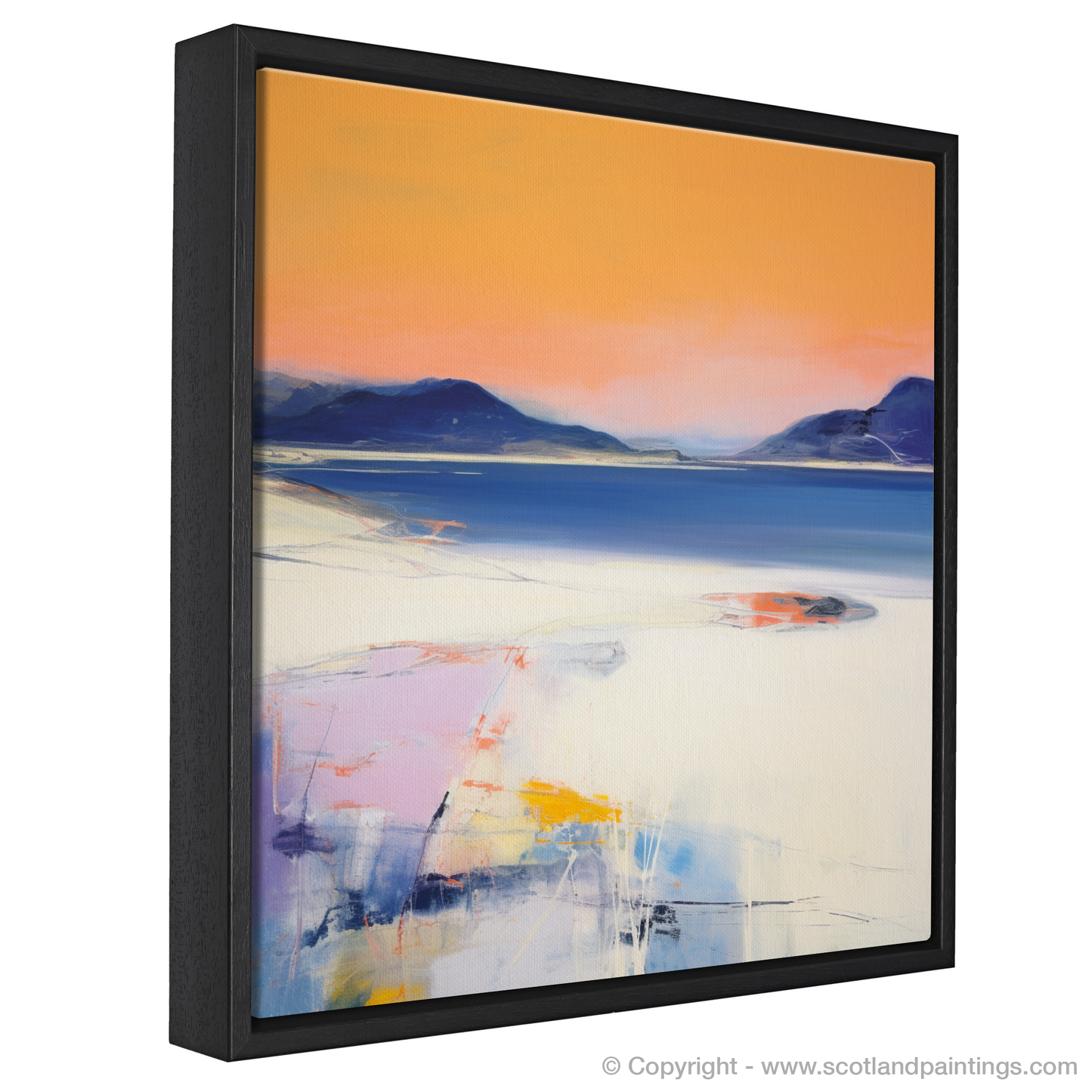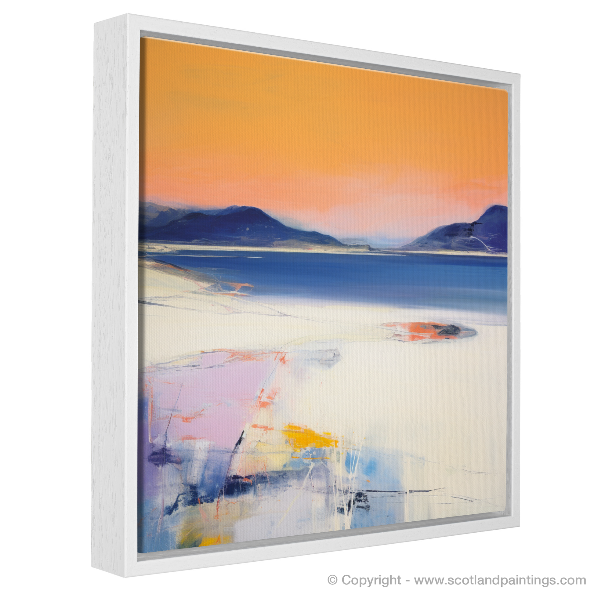 Immerse yourself in the ethereal beauty of a Scottish cove at the close of day, as captured in this evocative abstract print. The enchanting hues of dusk bathe Camusdarach Beach in a mesmerising blend of warm and cool tones, where the sky transitions from a soft, lavender-infused blue to a resplendent coral flush at the horizon. The artistic representation plays with texture and colour, transporting the viewer to a place of tranquillity and serenity.