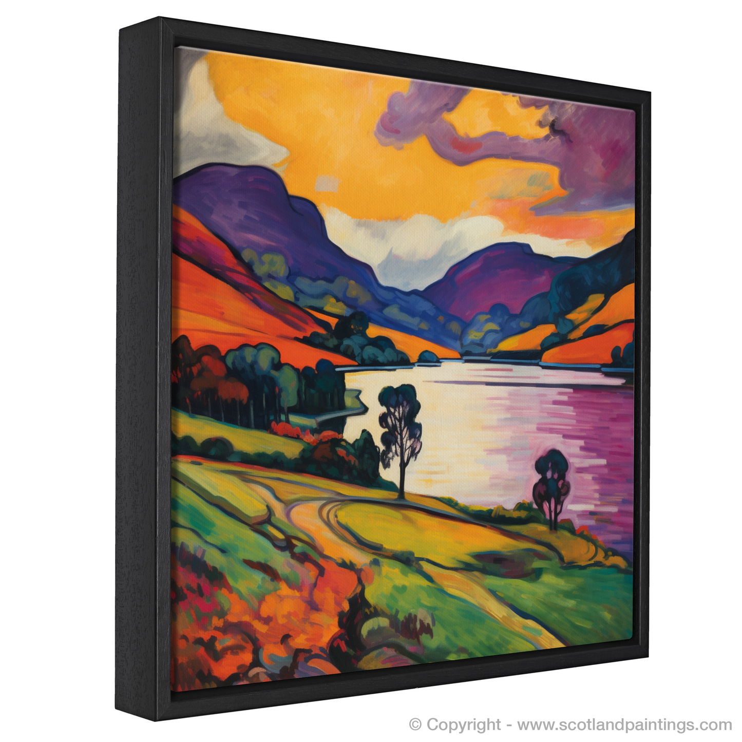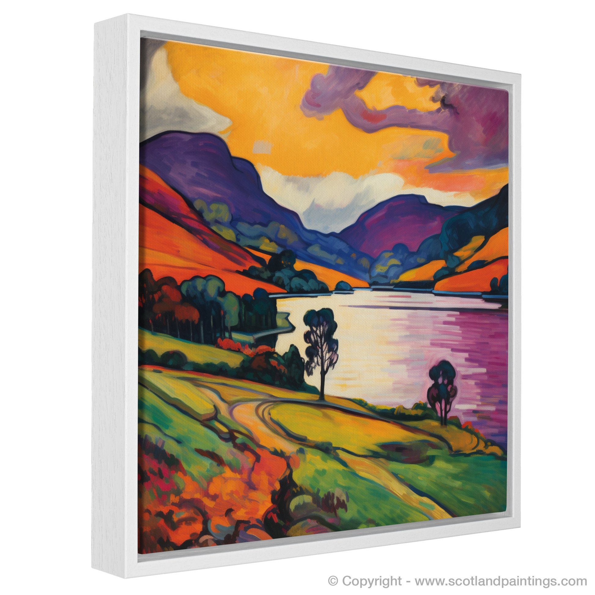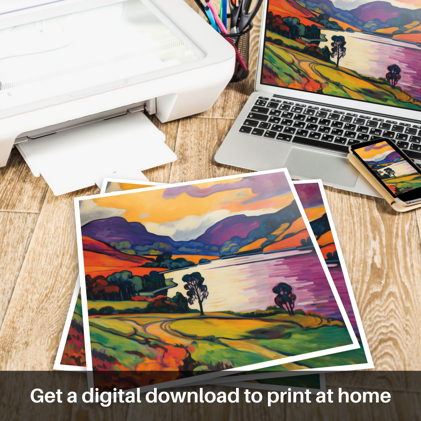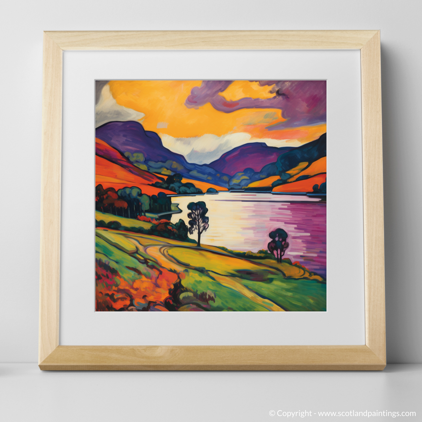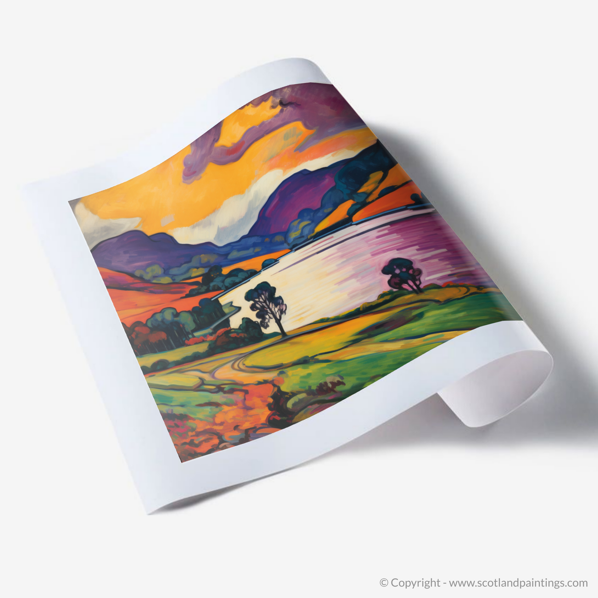 Immerse yourself in the dynamic vibrancy of our exclusive print, capturing the essence of Loch Earn with a visual symphony of vivid colours and energetic brushstrokes, reminiscent of the Fauvist style that celebrated colour above all. The eye is immediately drawn to the bold spectrum of oranges and purples that dance across the sky, setting a backdrop of dramatic warmth against the cool tranquillity of the loch.