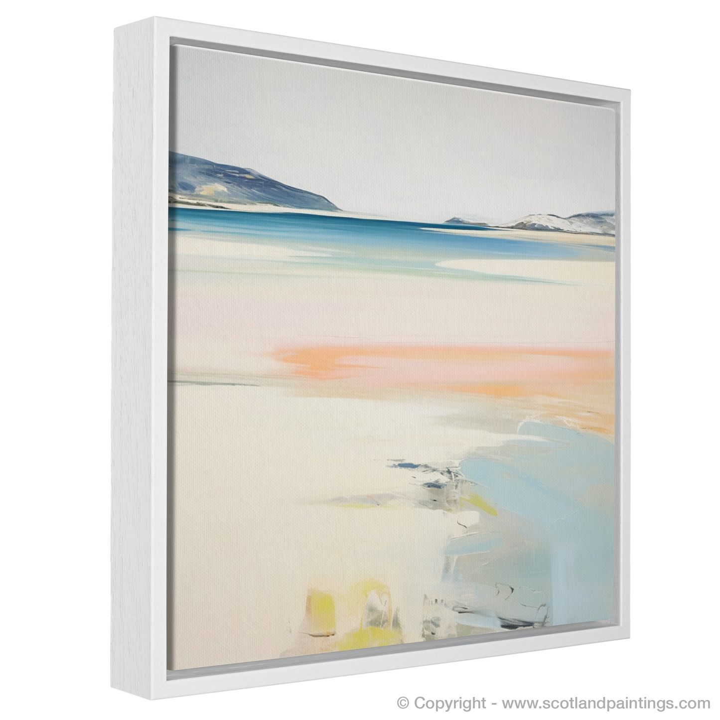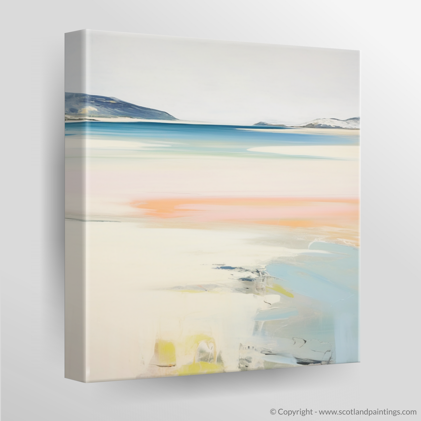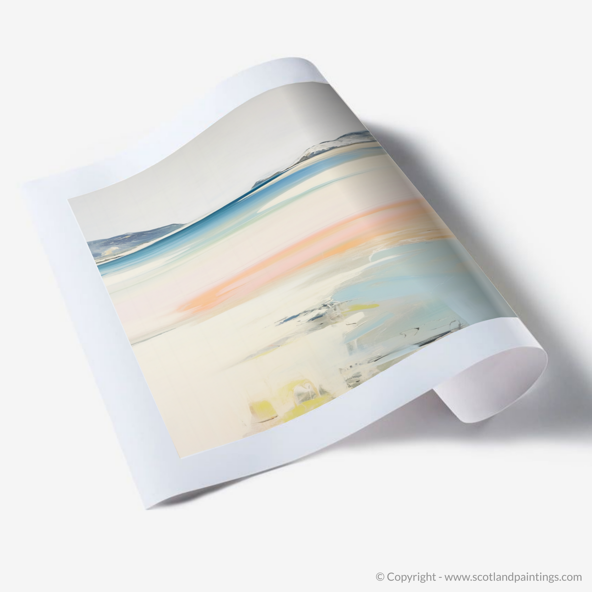 Sublime hues of azure and cerulean mimic the expansive sky and tranquil sea, sharply contrasting with the warm coral and apricot whispers that evoke the unique sands of the Hebridean beach. The soft, sweeping brushstrokes create an ethereal quality, suggesting the fluid motion of the tides and the gentle shift of the coastal breeze.