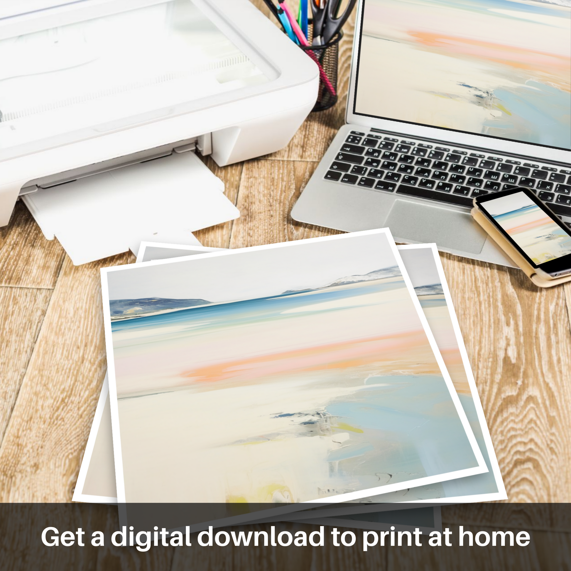 The serene beauty of Traigh Mhor, translated into a canvas of abstract wonder, beckons the observer to delve into a realm of poetic tranquility. This exquisite piece captures the majestic essence of one of Scotland's most cherished seascapes through a masterful interplay of colour and form.
