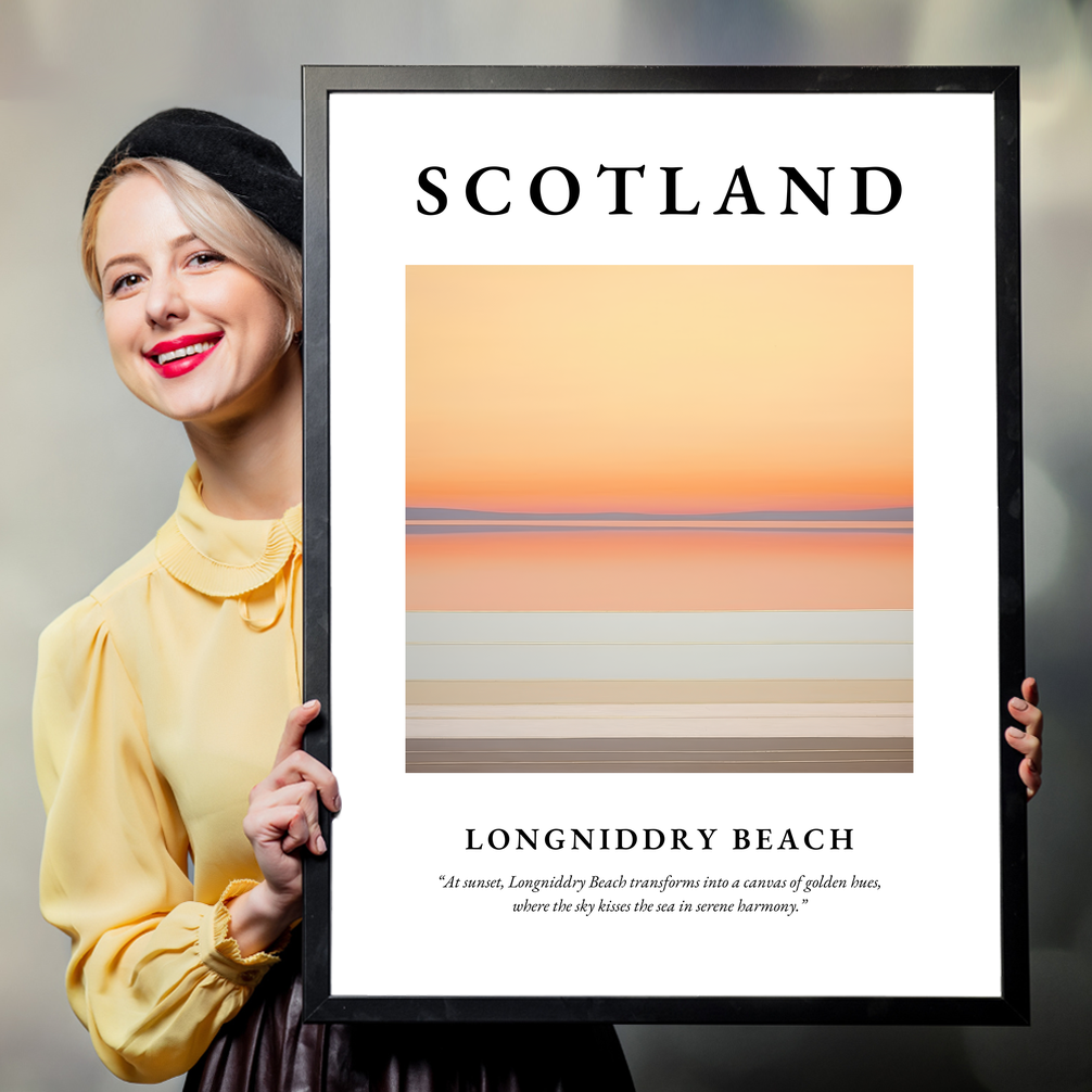 At the top, the word “SCOTLAND” is boldly displayed, immediately drawing attention and setting the scene for what lies beneath. The heart of this poster is an abstract painting of Longniddry Beach, a masterful creation that captures the ethereal transition of day into night. The interplay of soft tones and golden hues creates a soothing palette, evoking the serene harmony of a beach at sunset, where the sky meets the sea. Beneath this captivating artwork, the quote “At sunset, Longniddry Beach transforms into a canvas of golden hues, where the sky kisses the sea in serene harmony” encapsulates the essence of this magical location.