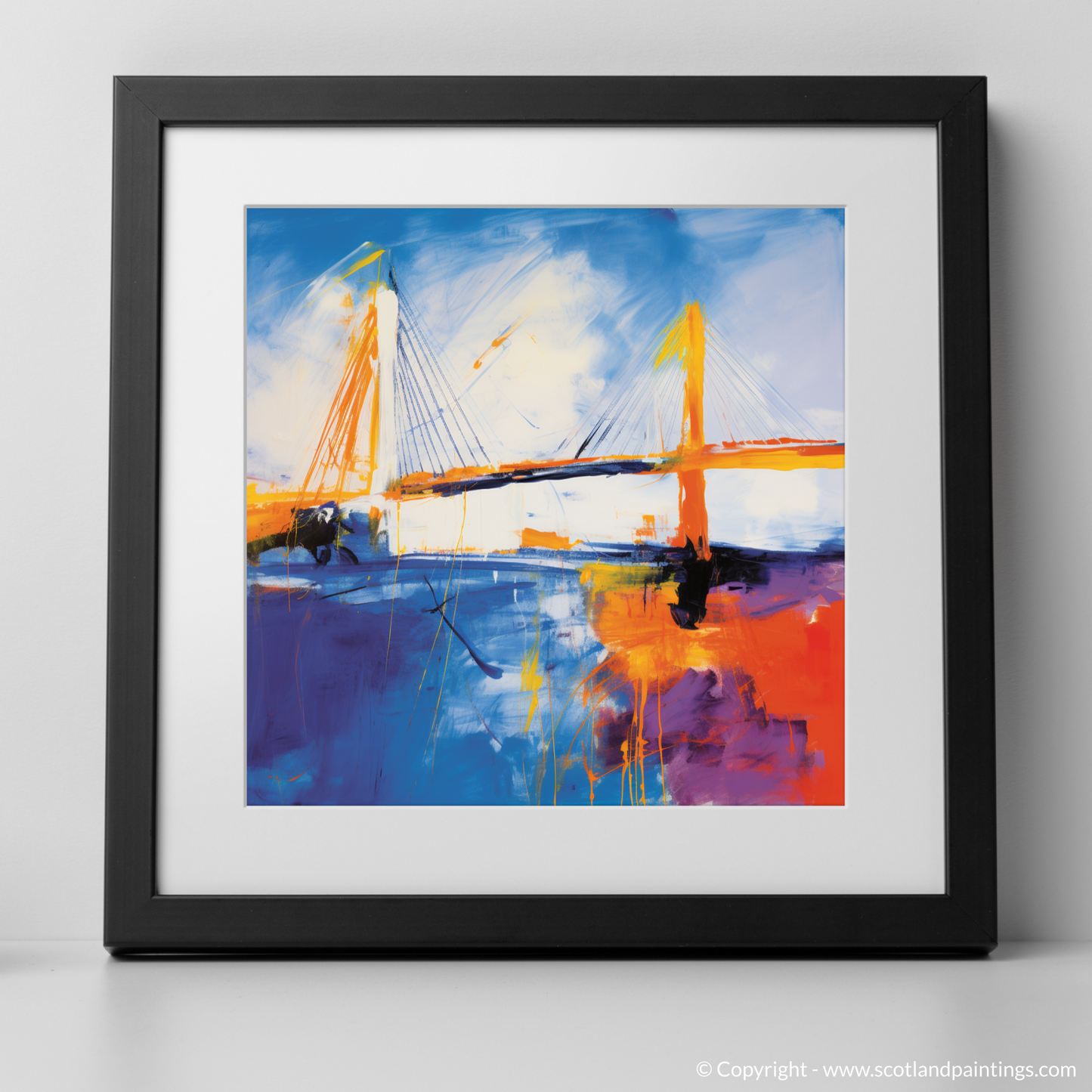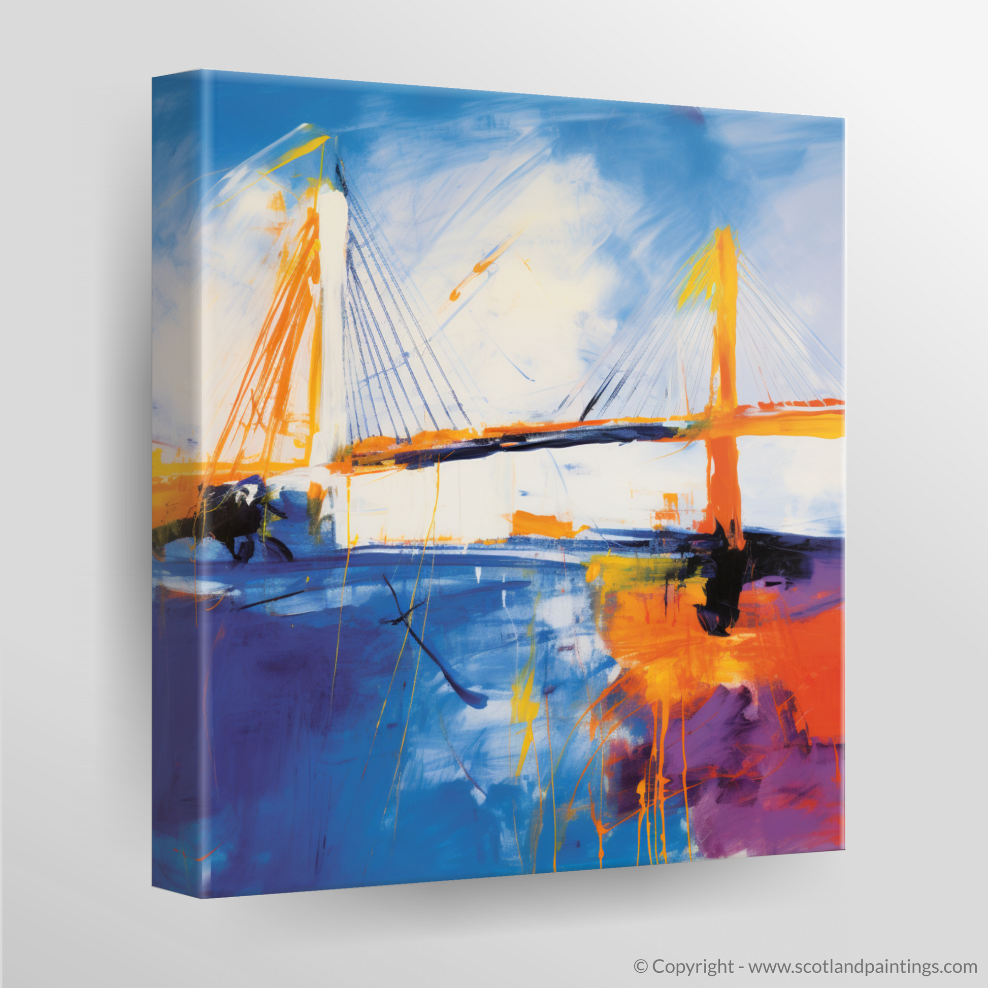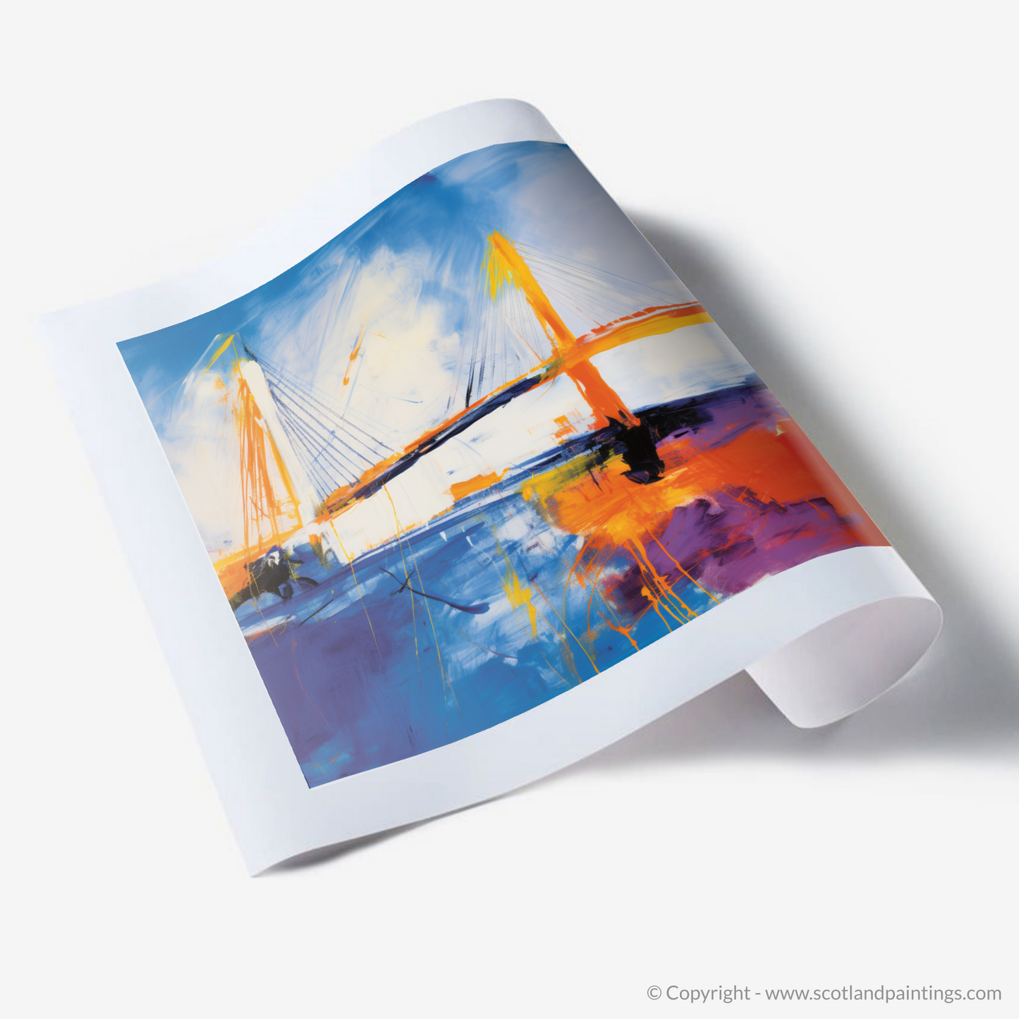 Immerse yourself in the vibrant essence of abstract expressionism with this captivating print, a dynamic homage to the iconic Queensferry Crossing. Bold sweeps of electric blue and radiant orange dance across the canvas, encapsulating the kinetic energy and raw power of the Scottish landscape. The print, a part of the esteemed 'Scottish Bridges' collection, presents an imaginative reinterpretation of the celebrated bridge.