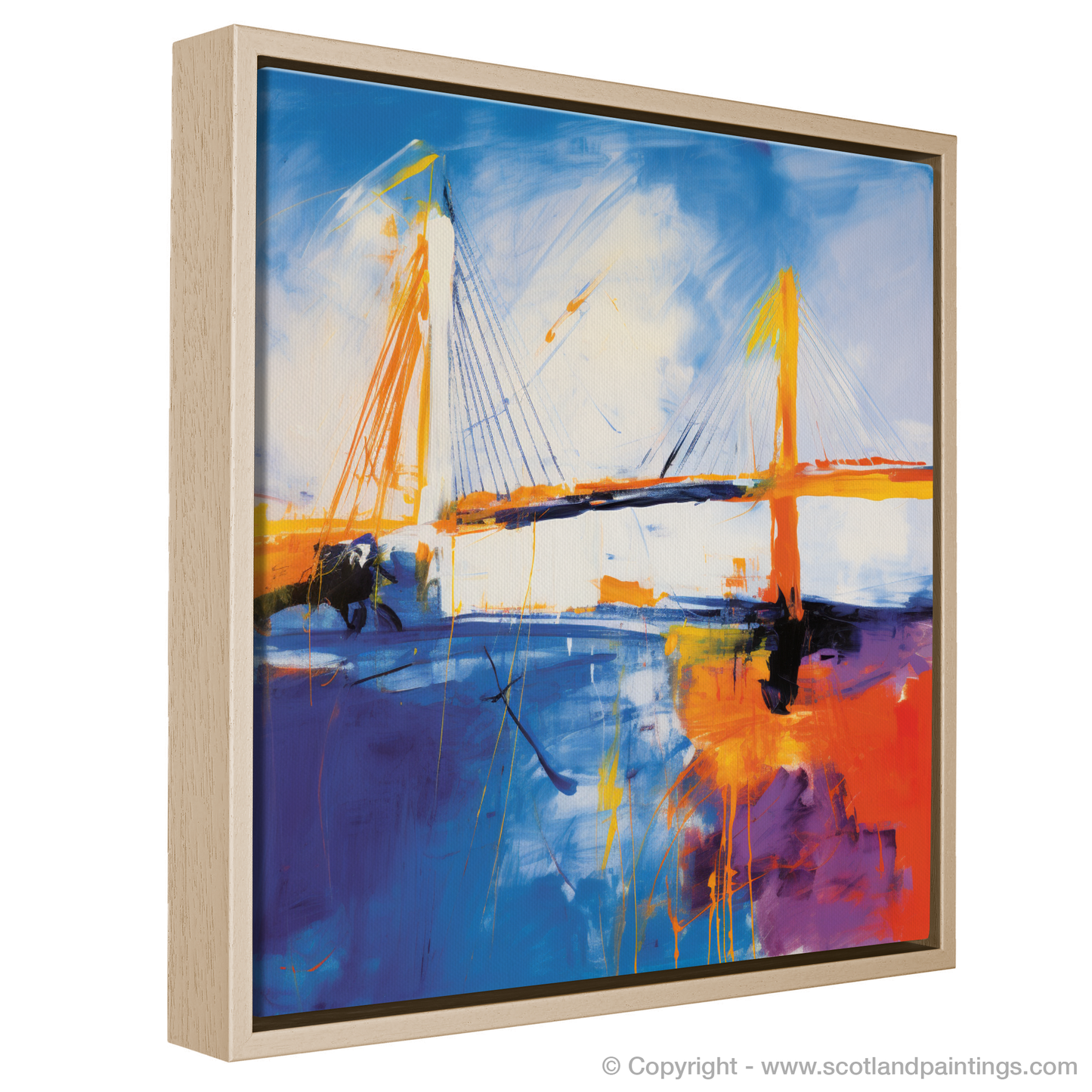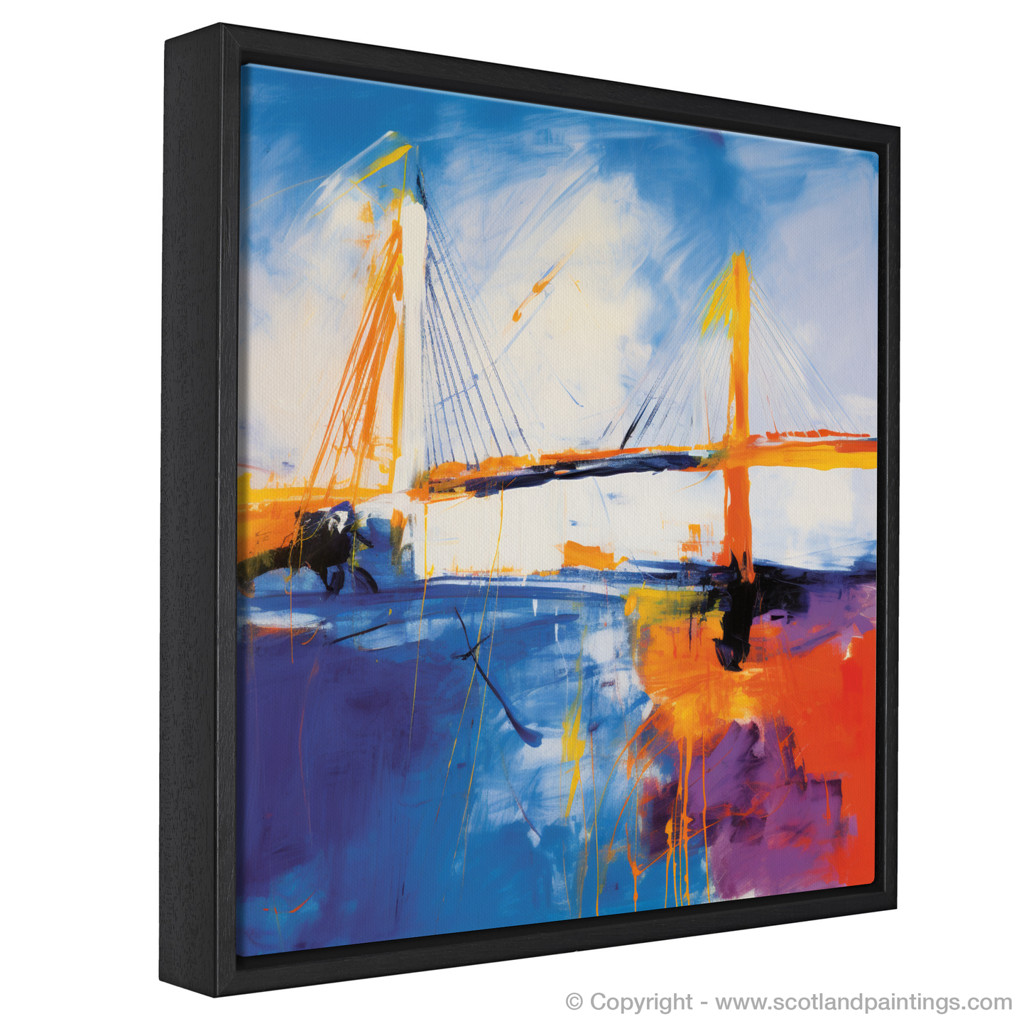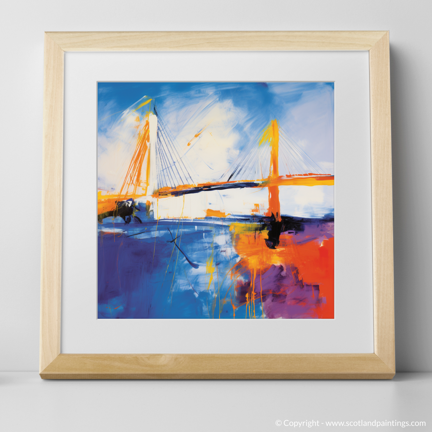 Immerse yourself in the vibrant essence of abstract expressionism with this captivating print, a dynamic homage to the iconic Queensferry Crossing. Bold sweeps of electric blue and radiant orange dance across the canvas, encapsulating the kinetic energy and raw power of the Scottish landscape. The print, a part of the esteemed 'Scottish Bridges' collection, presents an imaginative reinterpretation of the celebrated bridge.