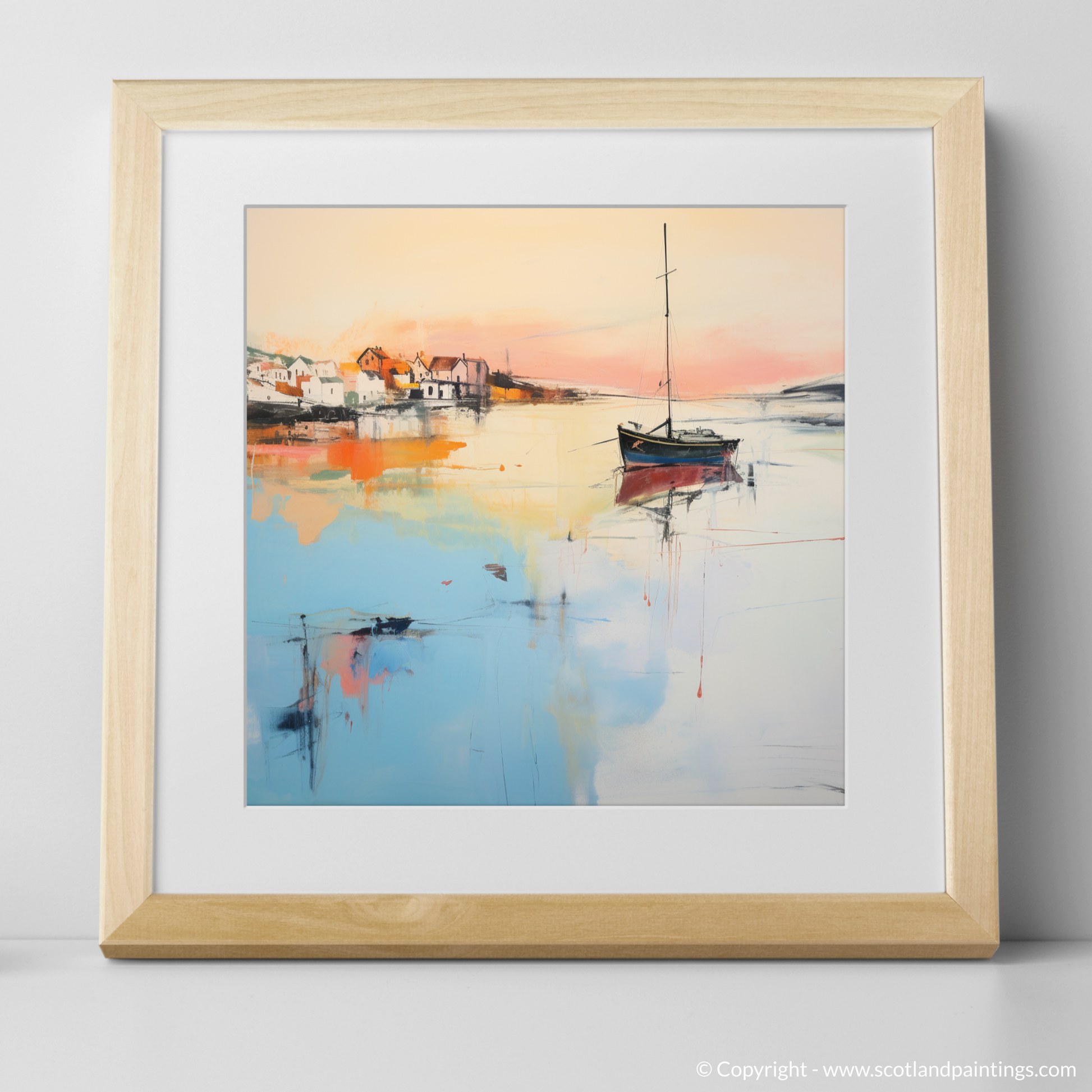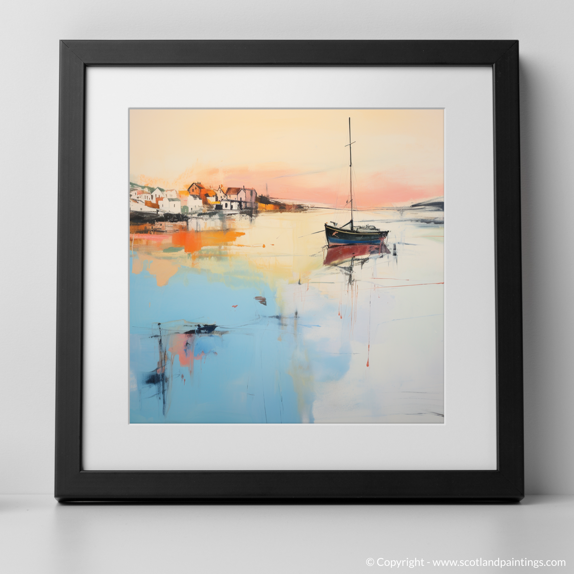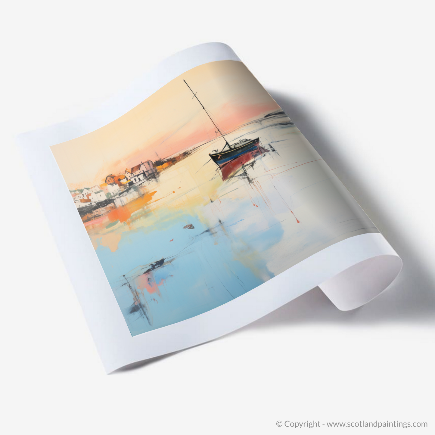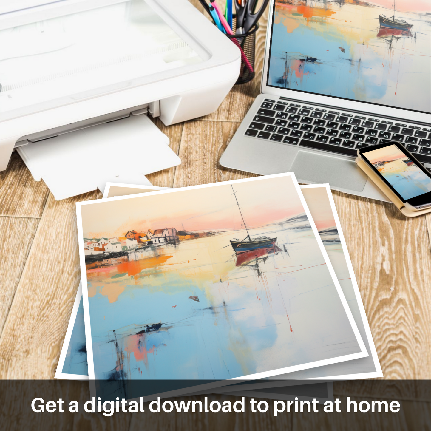 Immerse yourself in the tranquil beauty of a Scottish harbour at golden hour, captured in this evocative abstract print. The essence of Port Ellen is distilled through vibrant brush strokes and a deftly curated palette, intertwining the warmth of the sunset with the cool tranquillity of the sea.