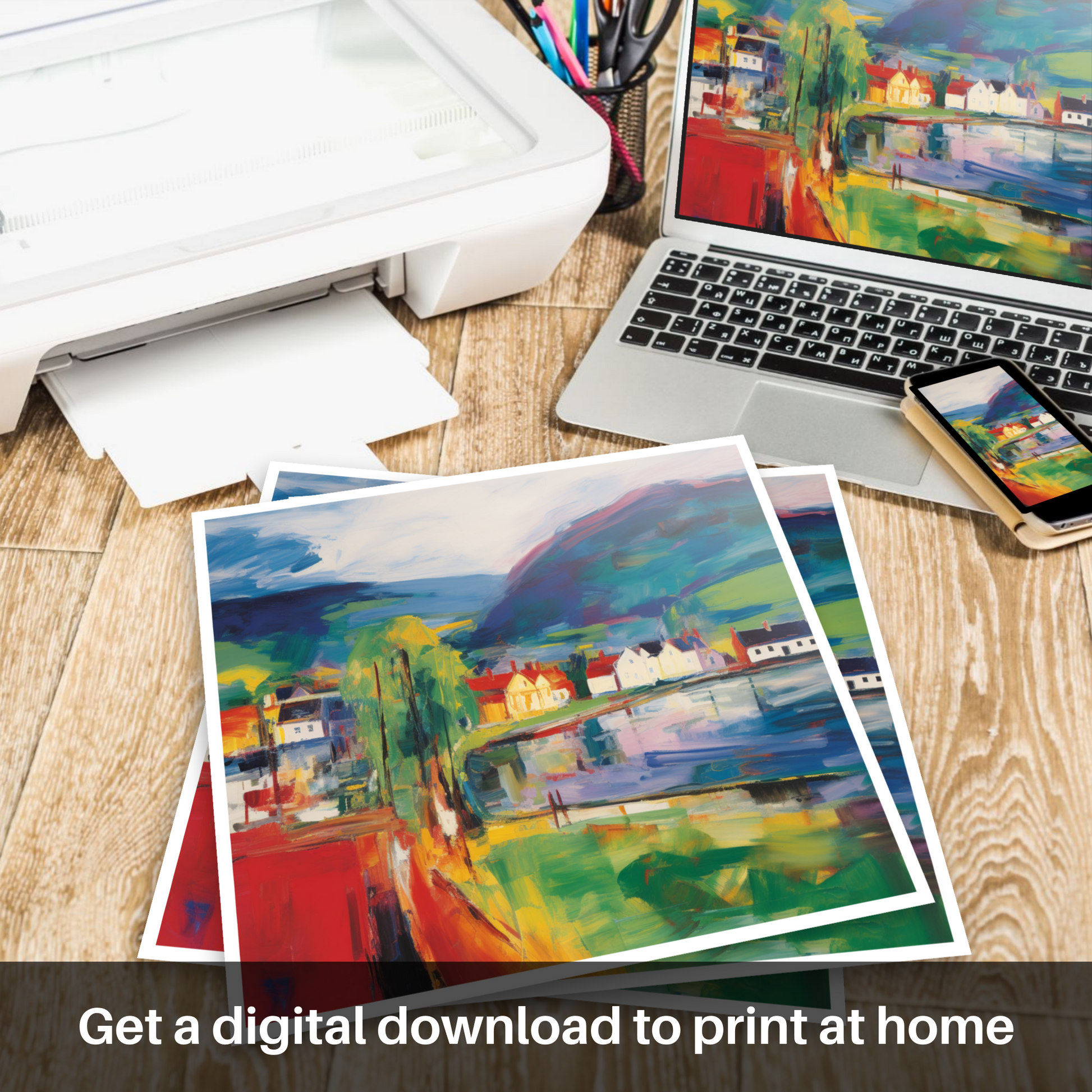 Immerse yourself in the vivacious strokes and robust hues of a print that captures the essence of Inveraray through the emotive lens of Abstract Expressionism. This compelling piece abstracts the charming scenery of this Scottish village, adorning it with a palpable energy that sings from the canvas.