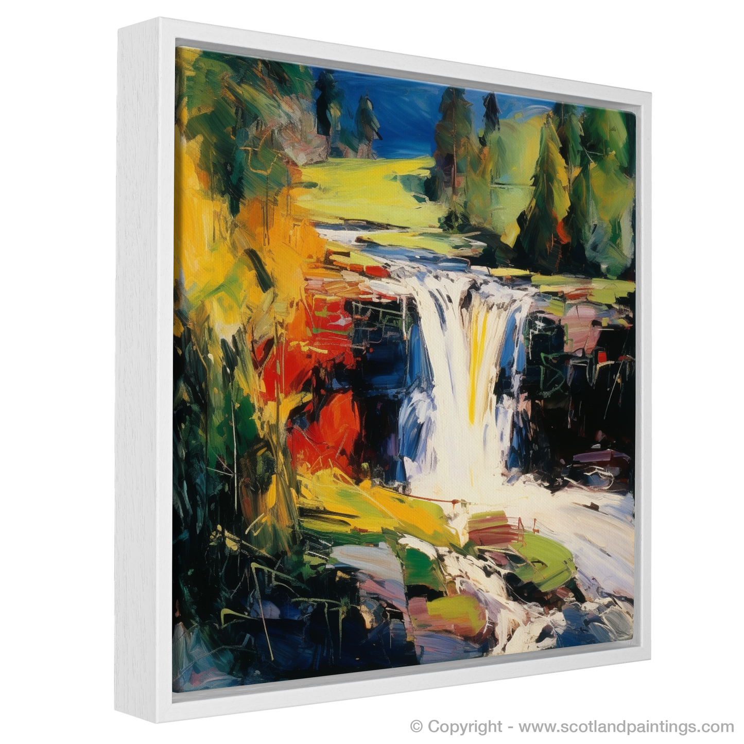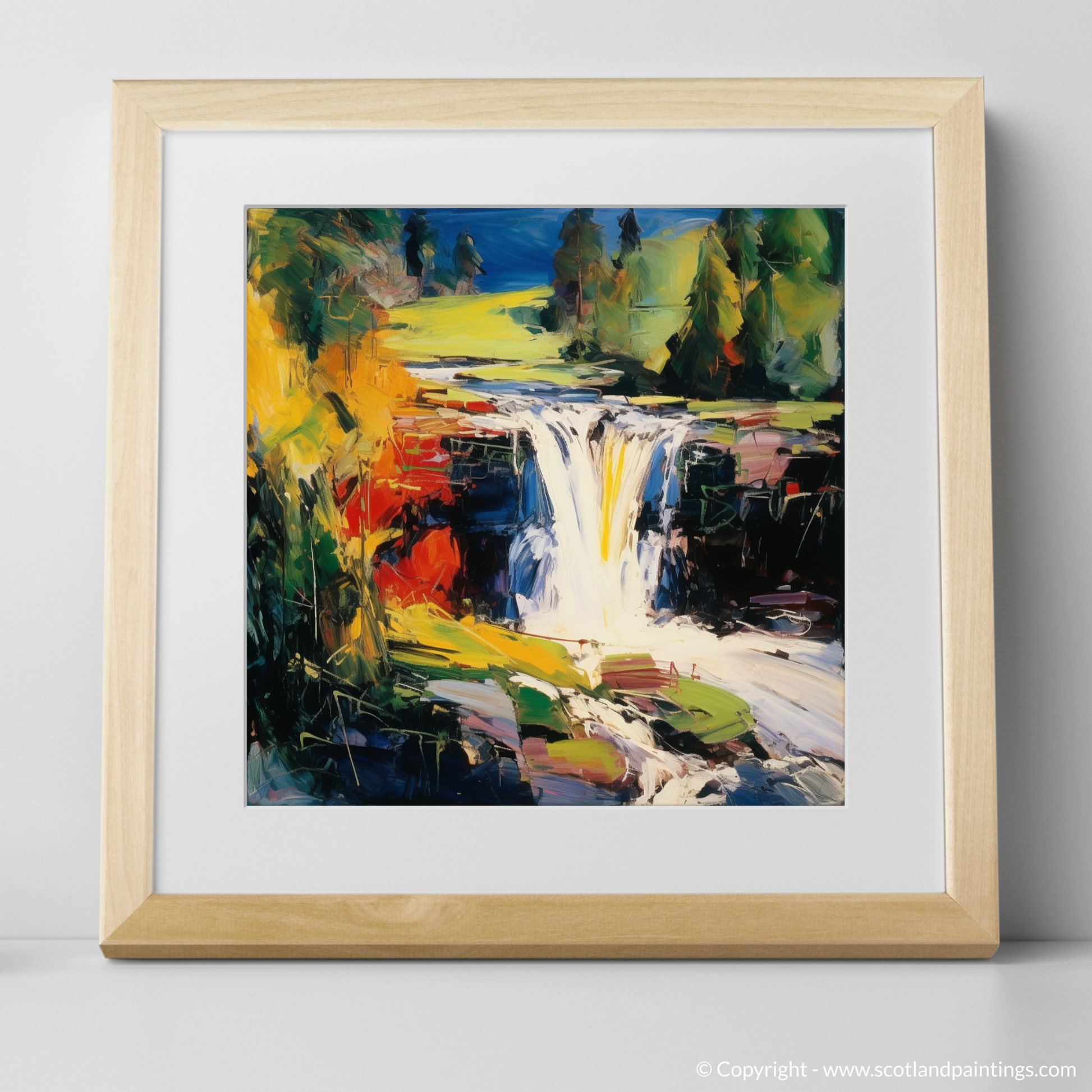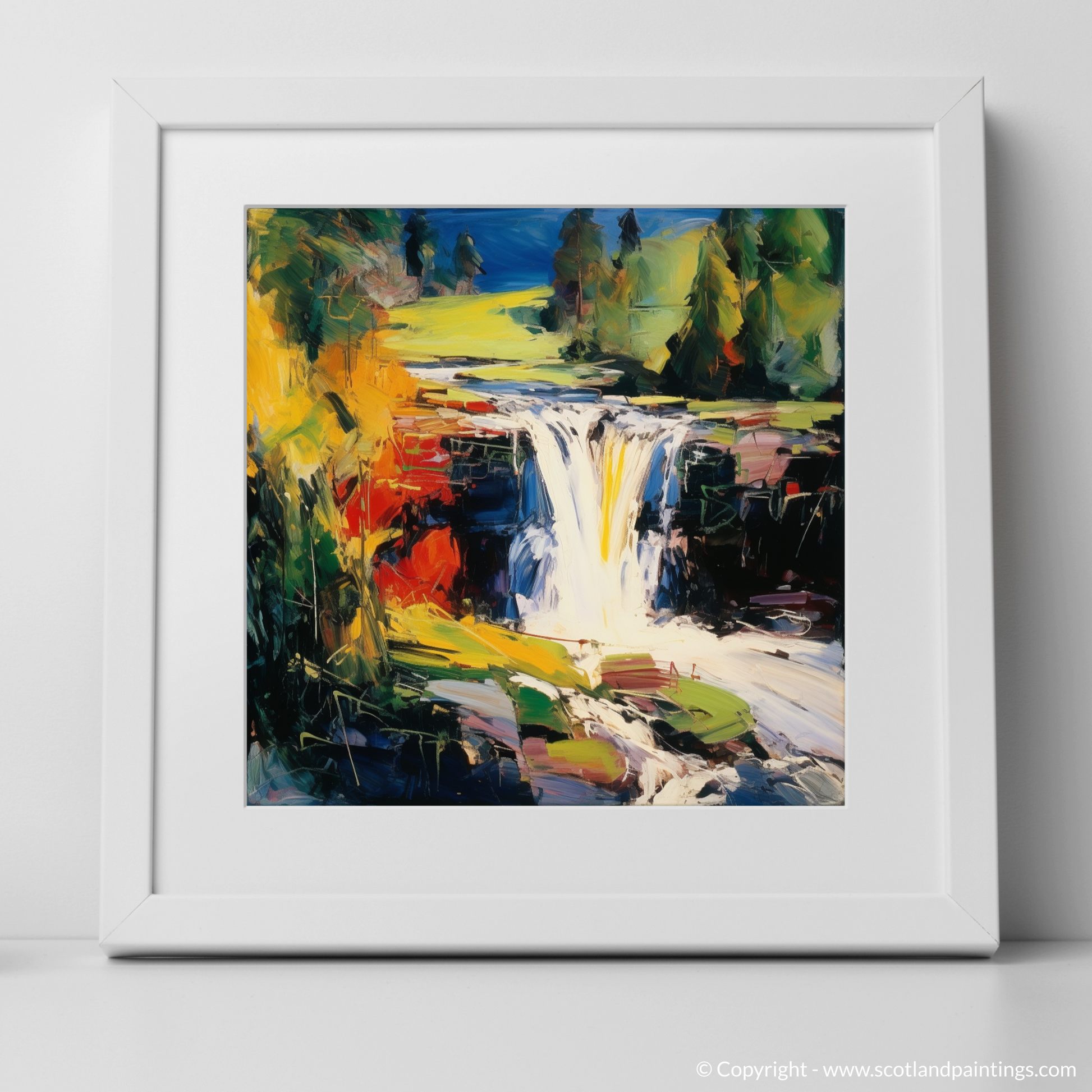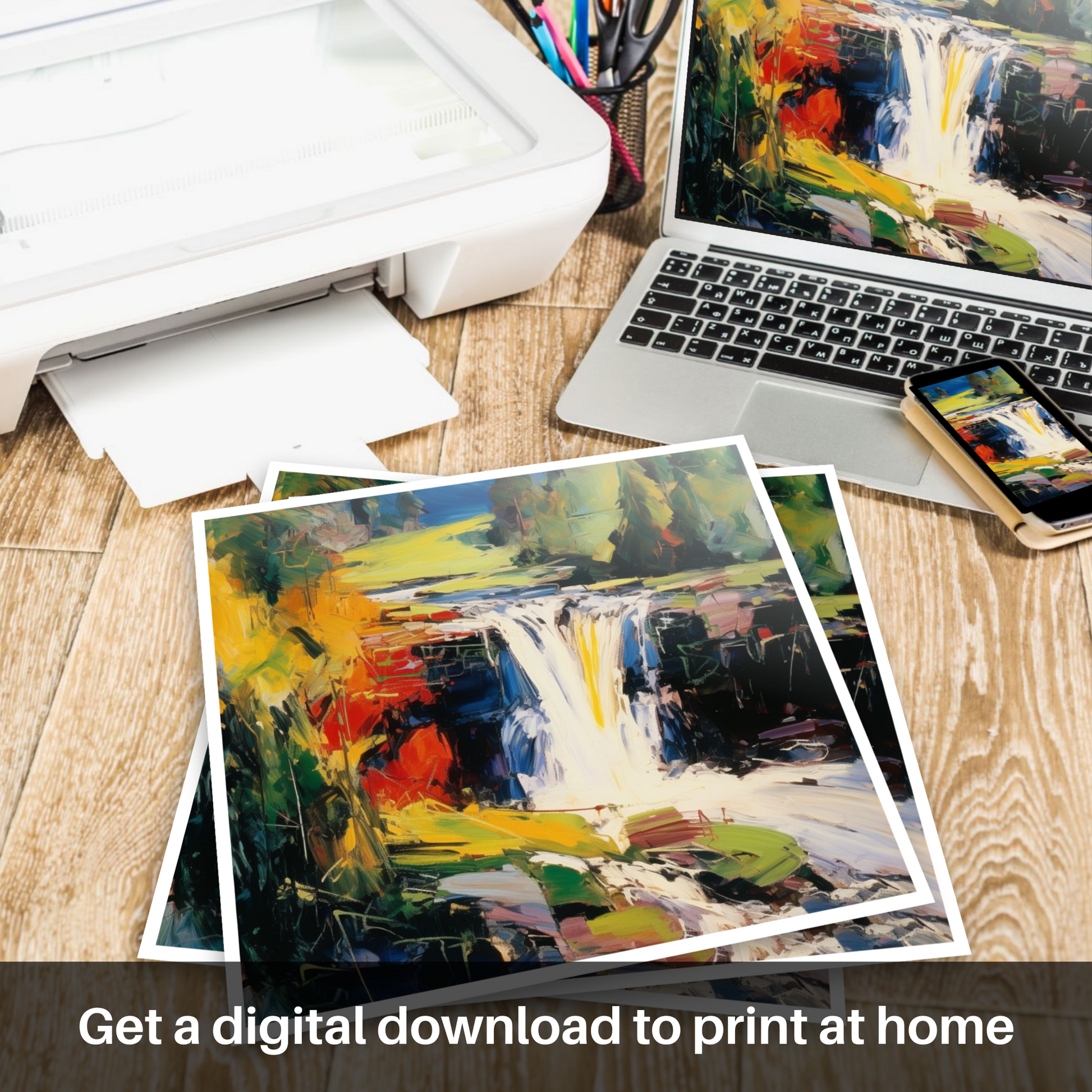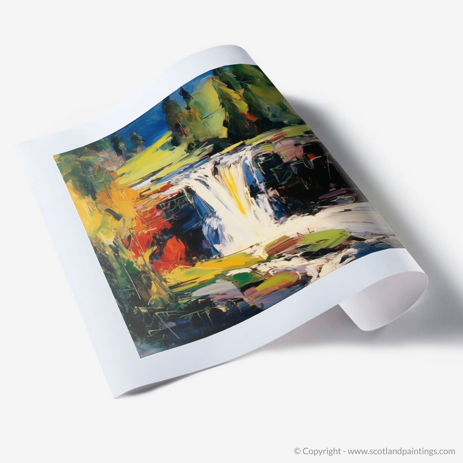 Immerse yourself in the visceral vibrancy of nature with this striking abstract expressionist interpretation of the Falls of Bruar, a natural spectacle nestled in the heart of Perthshire. Through a symphony of bold strokes and impulsive swaths of colour, this piece evokes the tumultuous energy and the sheer force of the cascading waters, harmonised with the serene beauty of the surrounding forest.