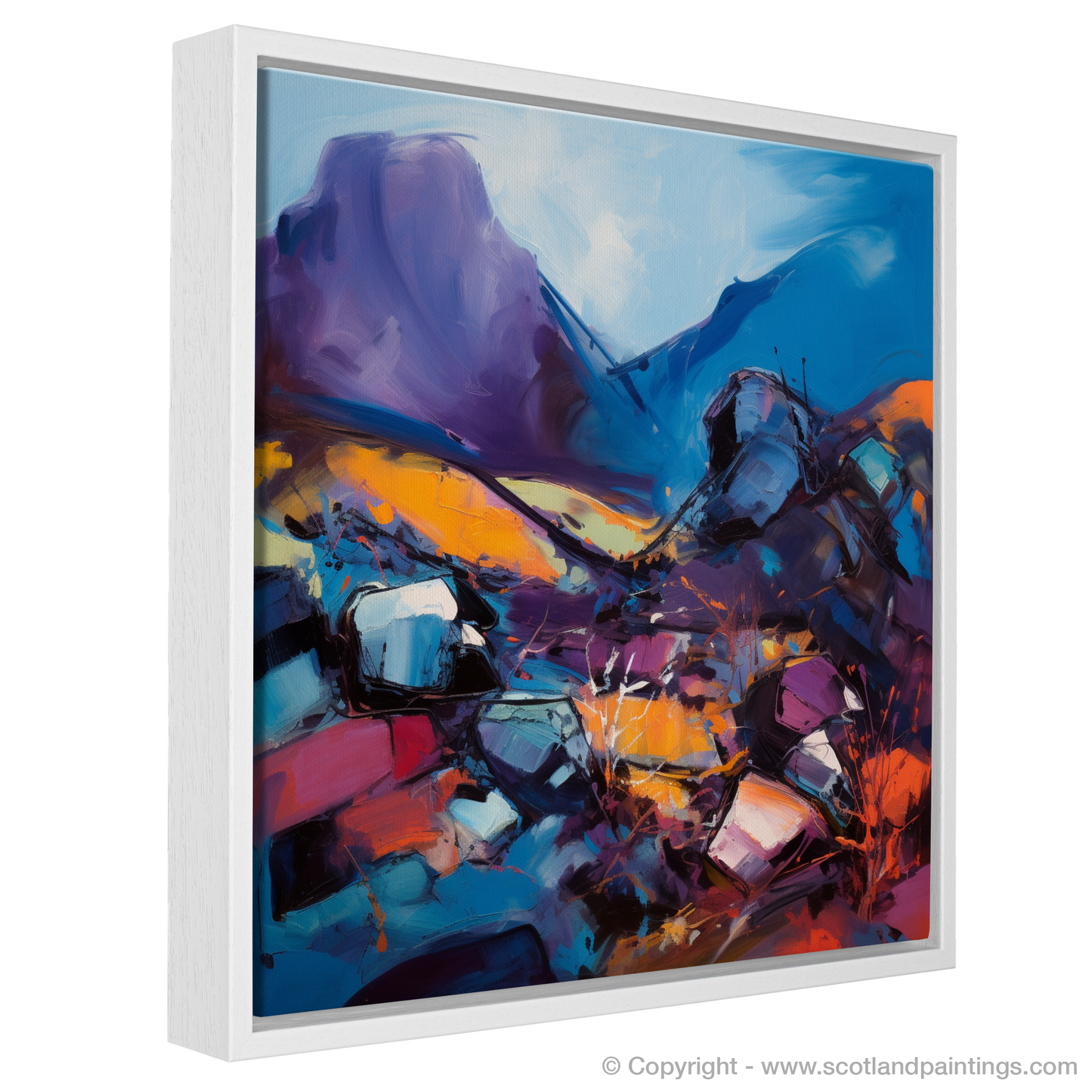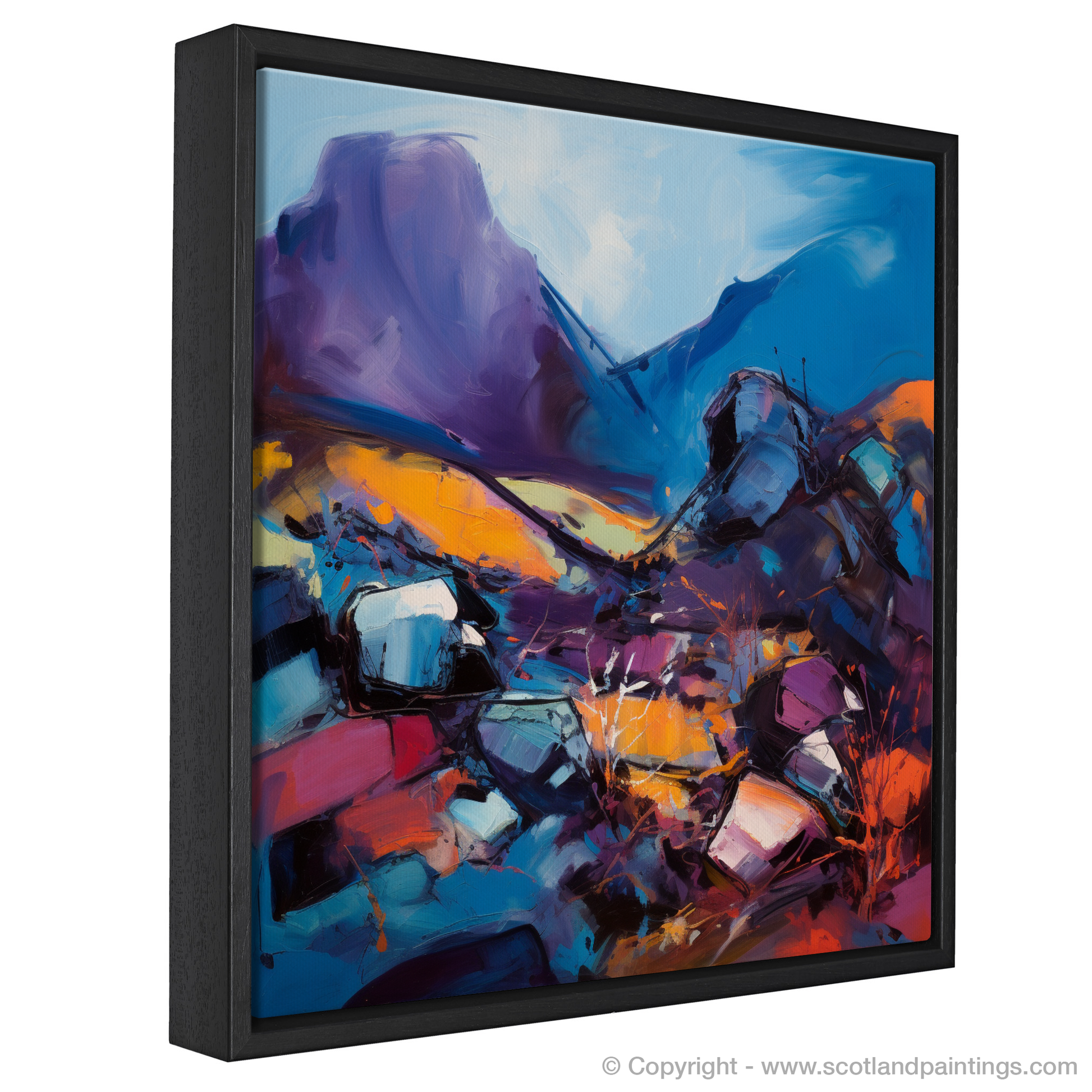 Immerse yourself in the vibrant interplay of colour and form with our evocative print, where the wild essence of Crowberry ebbs and flows across the canvas. This piece is an exploration of the rugged beauty of Buachaille Etive Mòr, where flora meets ancient stone, rendered through the emotive lens of Abstract Expressionism.