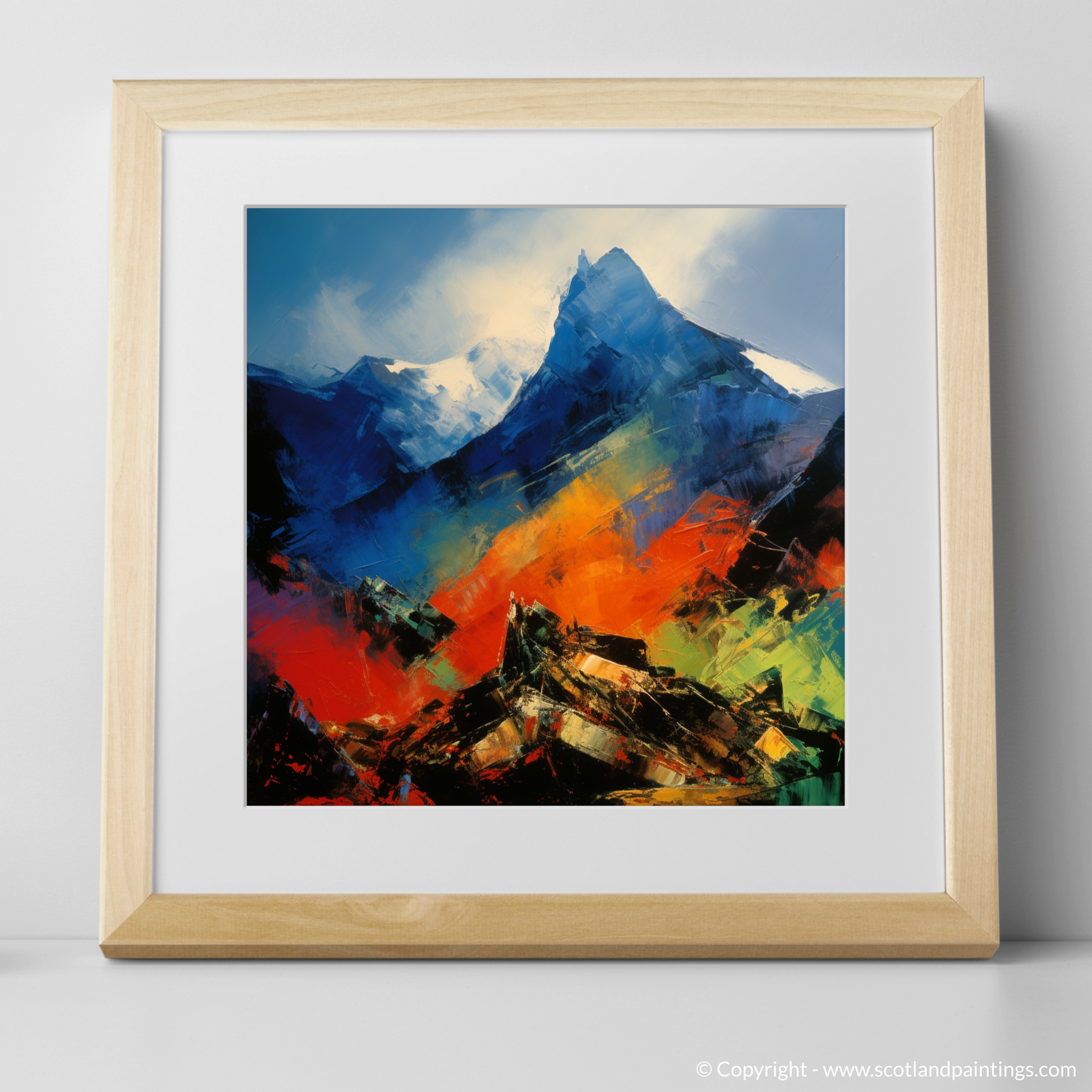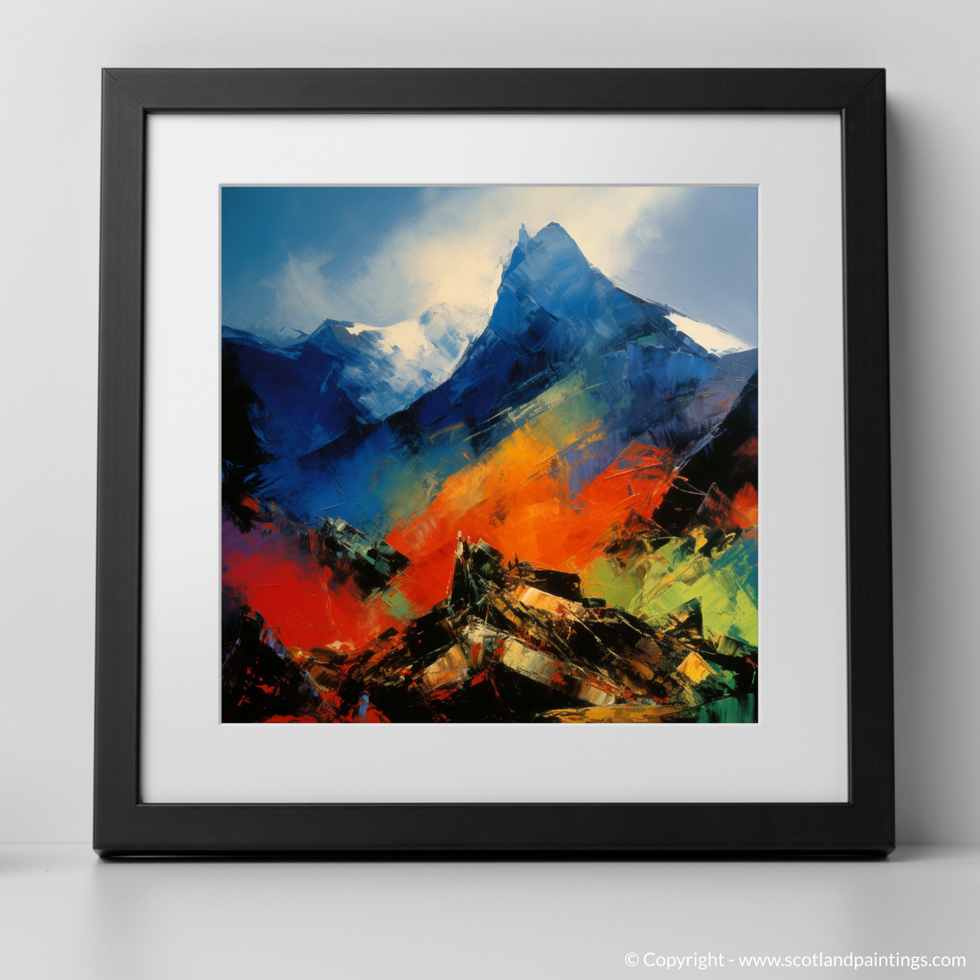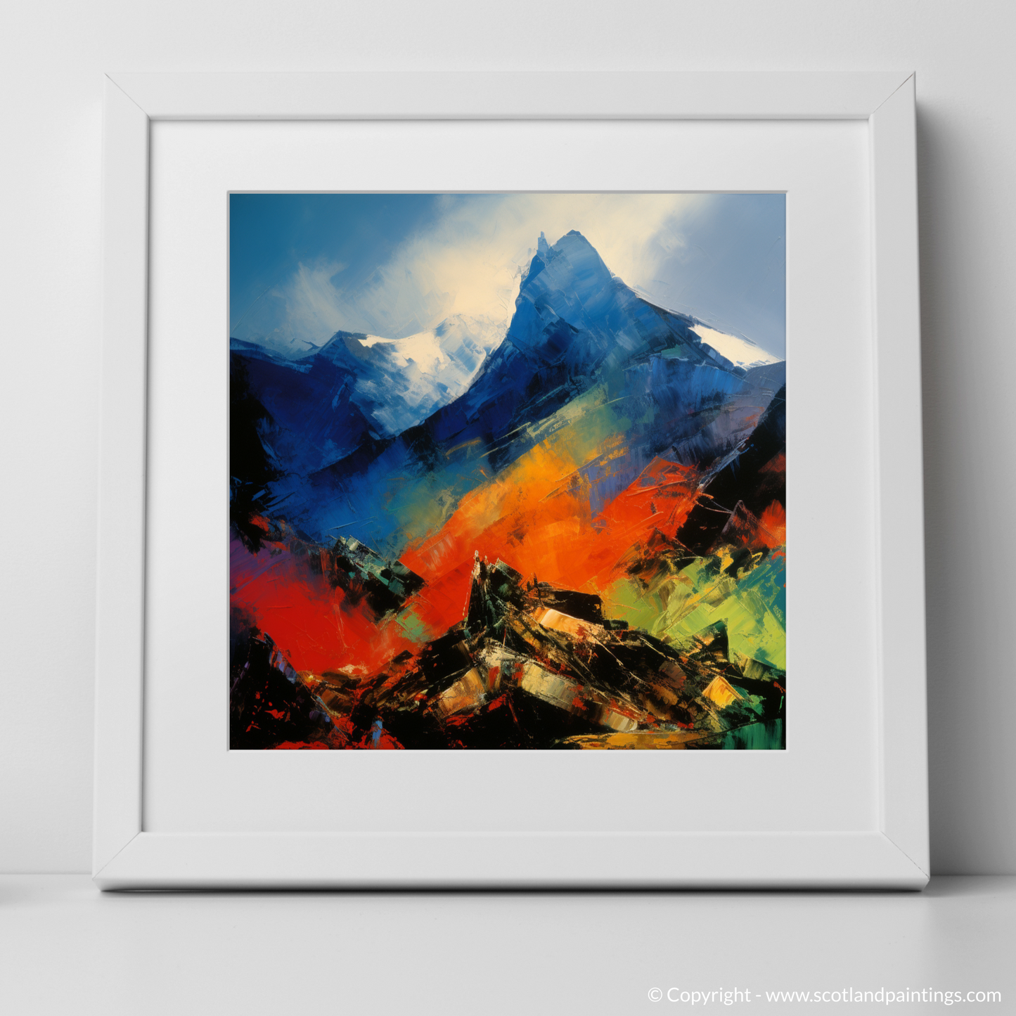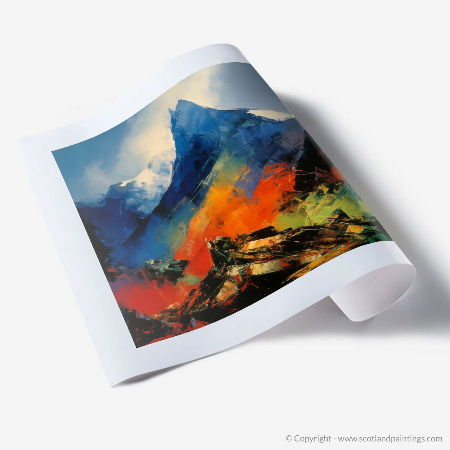Immerse yourself in the raw emotional energy captured within this vigorous abstract expressionist print inspired by the rugged beauty of The Cobbler in the Arrochar Alps of Scotland. Bold brushstrokes and a tempest of colours collide to evoke the wild and untamed essence of the Scottish Highlands. Vivid tones of fiery orange, crimson, and sunlit gold blaze like the fleeting seconds of sunset against the cool, deep blues and purples that dance across the craggy mountain peaks. The occasional stroke of pure white illuminates the scene, as if capturing the ethereal touch of snow upon the crests of this majestic landscape.