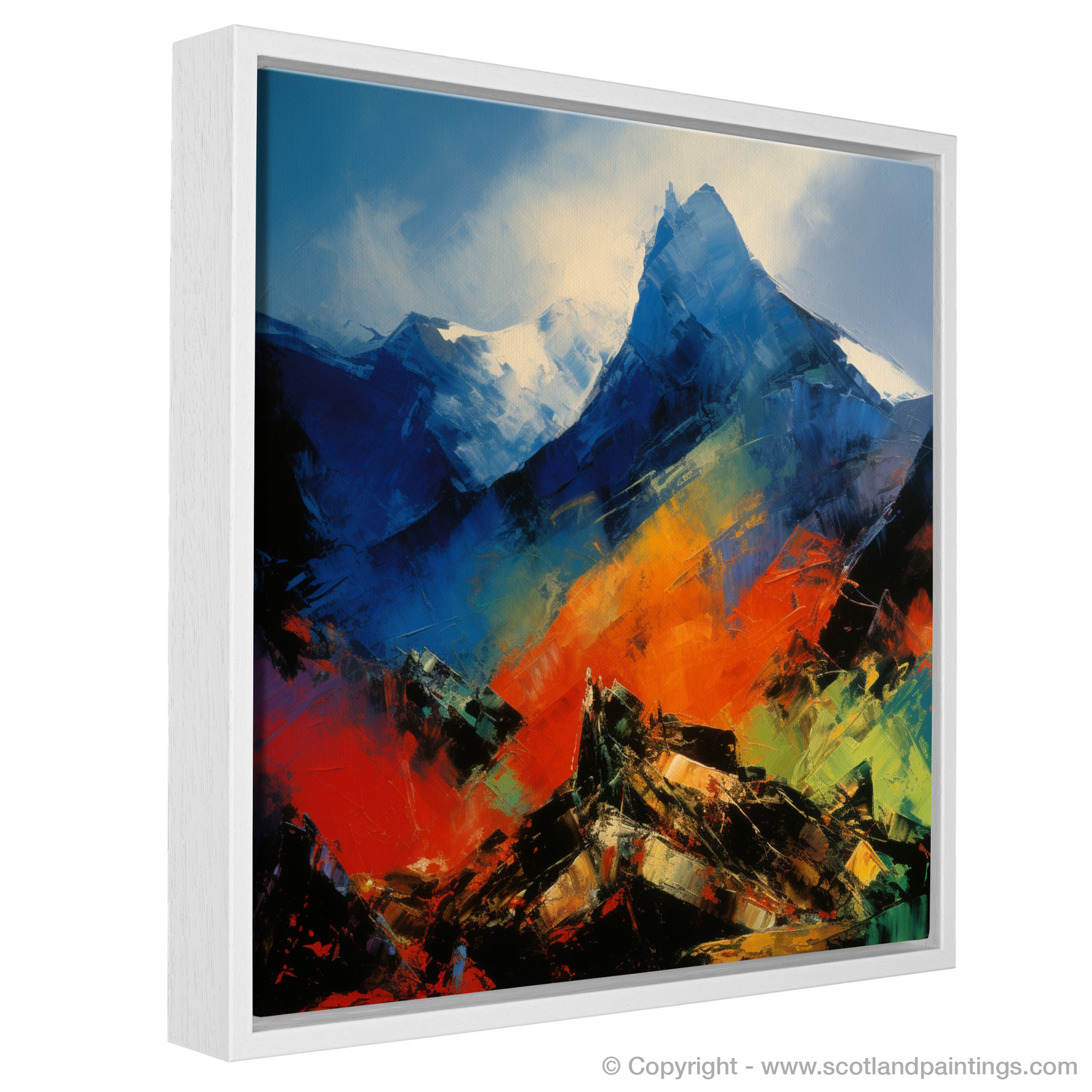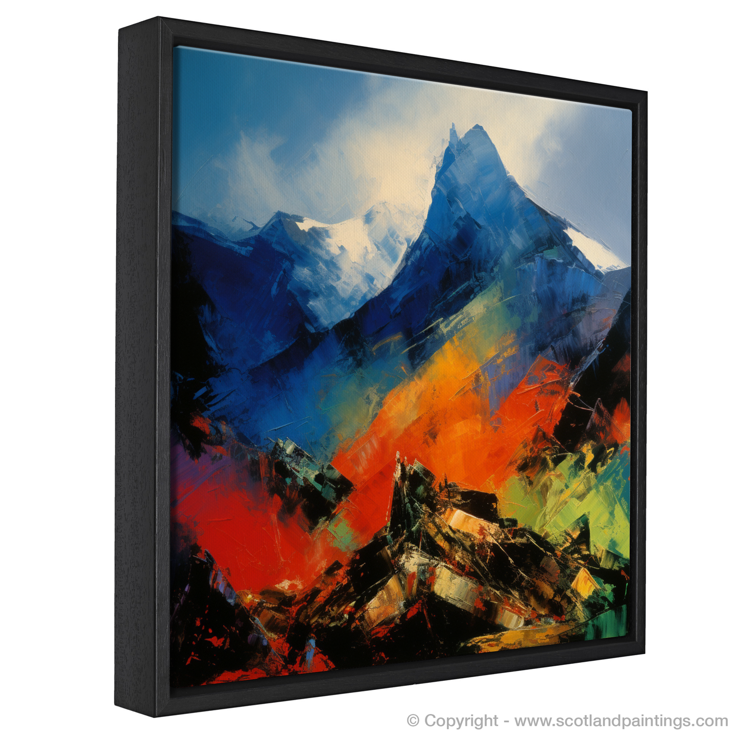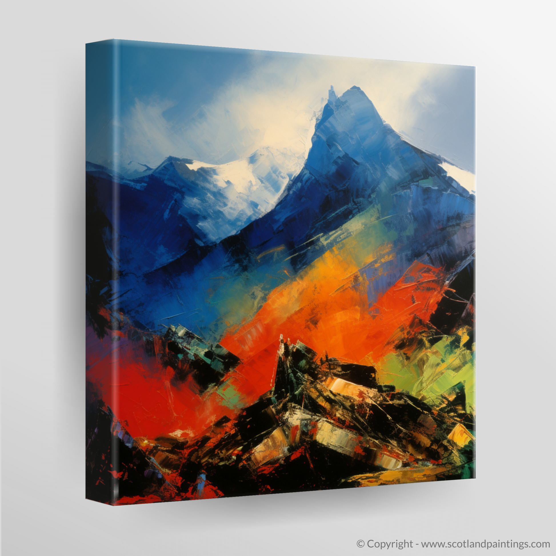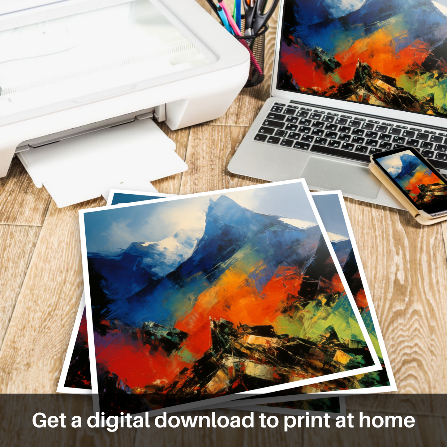 Immerse yourself in the raw emotional energy captured within this vigorous abstract expressionist print inspired by the rugged beauty of The Cobbler in the Arrochar Alps of Scotland. Bold brushstrokes and a tempest of colours collide to evoke the wild and untamed essence of the Scottish Highlands. Vivid tones of fiery orange, crimson, and sunlit gold blaze like the fleeting seconds of sunset against the cool, deep blues and purples that dance across the craggy mountain peaks. The occasional stroke of pure white illuminates the scene, as if capturing the ethereal touch of snow upon the crests of this majestic landscape.