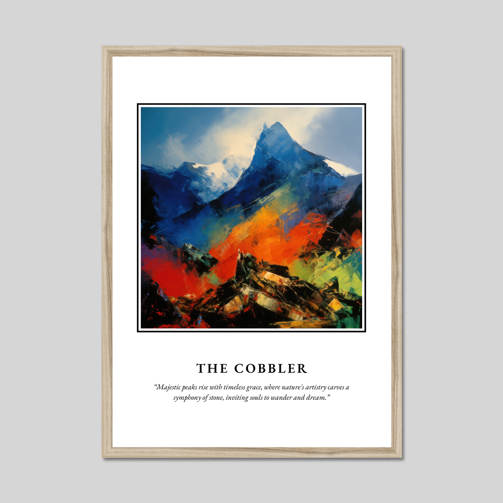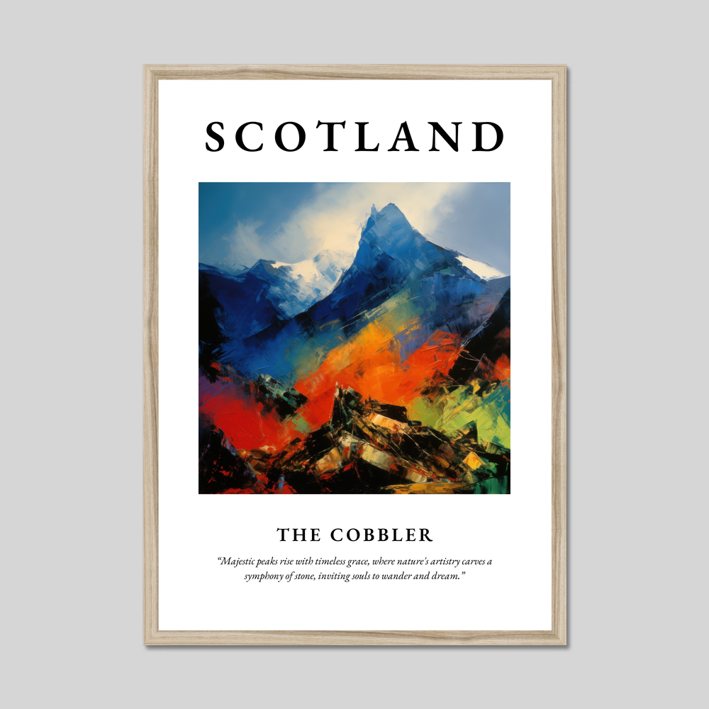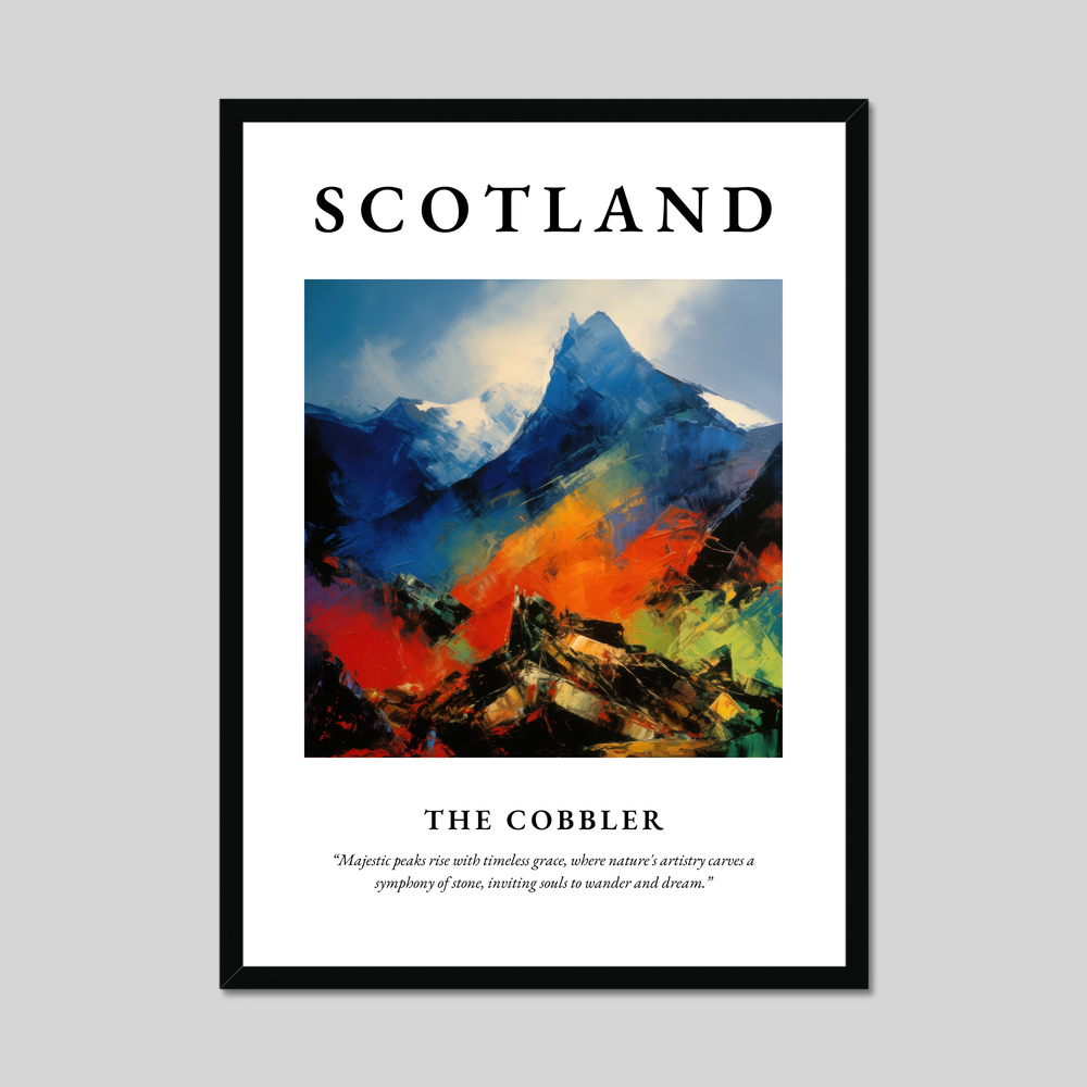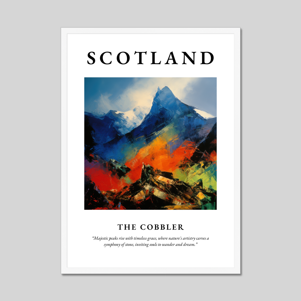 At the top, the bold lettering of "SCOTLAND" commands attention, setting the stage for the breathtaking visual journey below. The Cobbler, known for its distinctive peaks, is reimagined in a symphony of vivid colours and dynamic brushstrokes. The animated hues dance across the canvas, capturing the mountain's timeless majesty and inviting viewers to wander and dream, just as the evocative quote beneath the painting suggests.