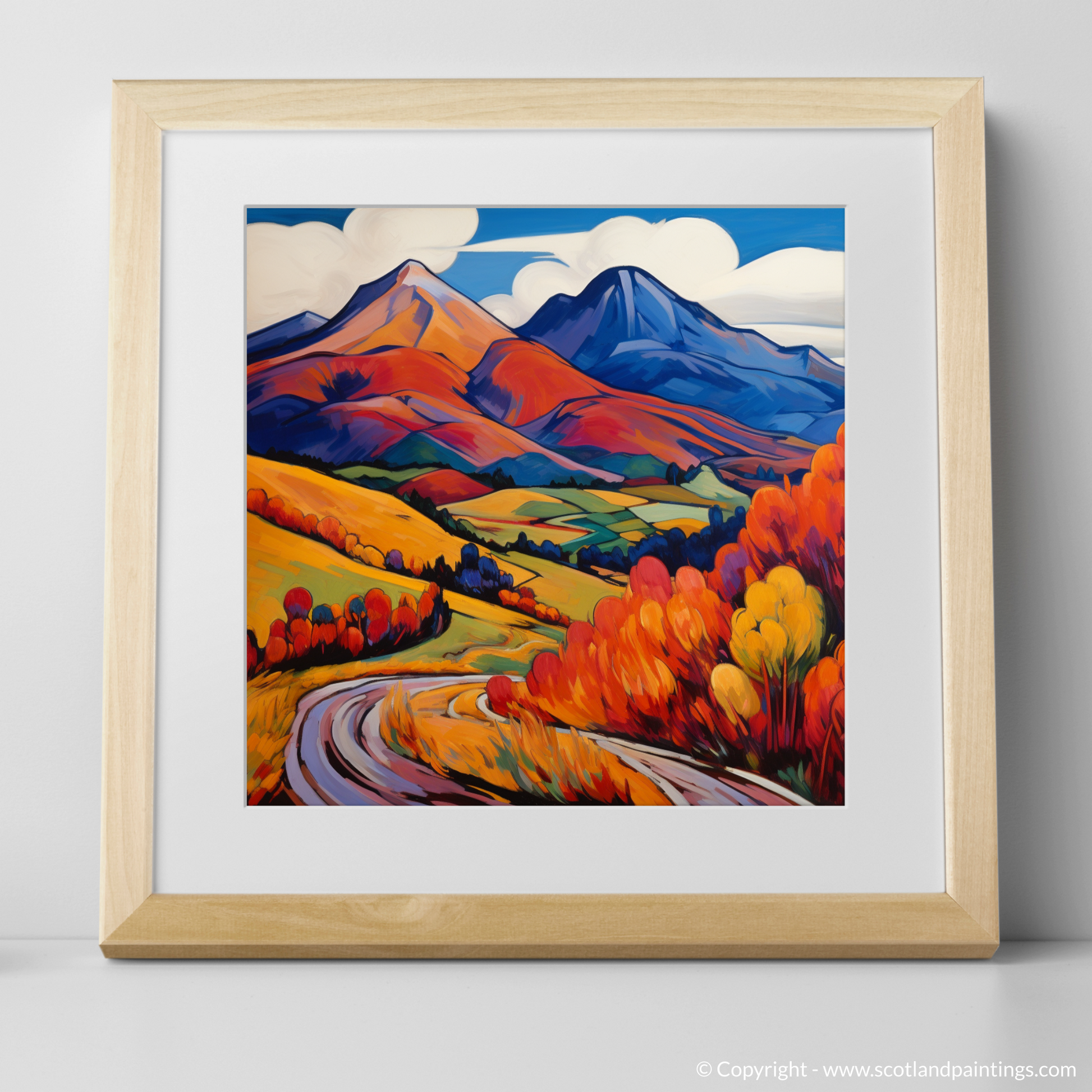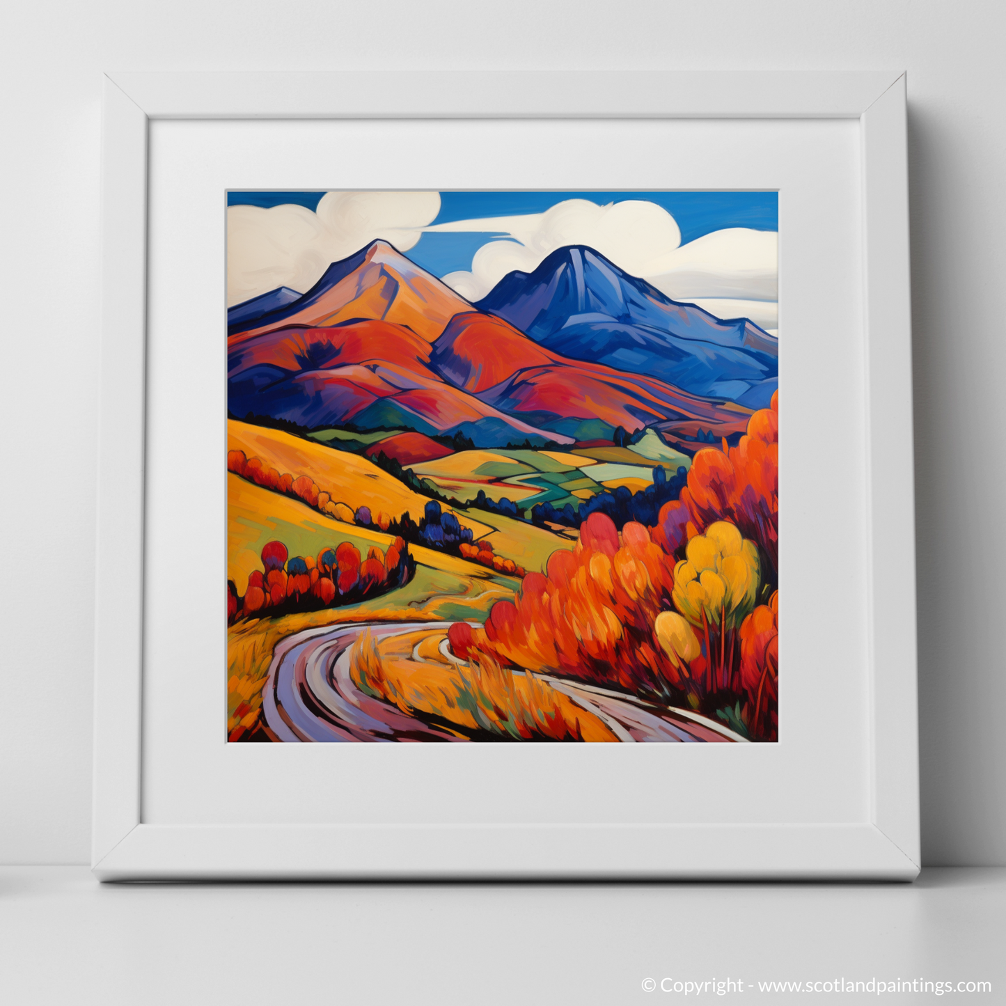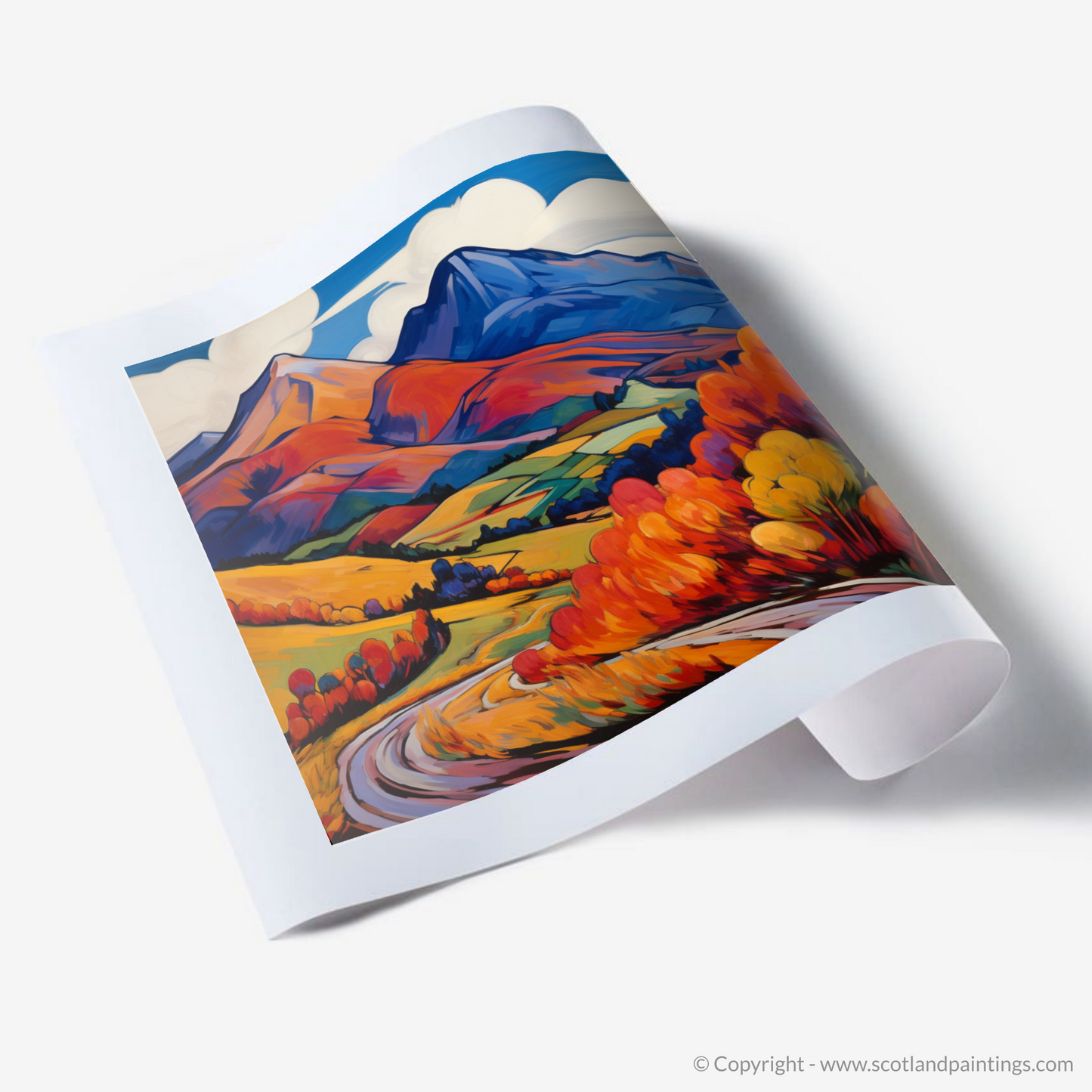 Allow the vivacious spirit of Fauvism to whisk you away to the Scottish Highlands with this captivating print. The dynamic brushstrokes and bold, expressive colours capture Ben Lawers, Perth and Kinross, in a manner that incites a passionate response from the viewer. Fiery oranges and reds ignite the rolling hills, evoking a feeling of the wild heather and bracken ablaze in the glow of the sunset. Intense blues and purples lend depth and contrast to the majestic mountains, drawing the eye upward to the serene expanse of sky, wherein soft cloudbanks drift lazily by.