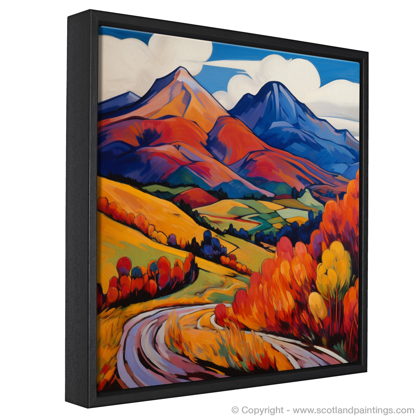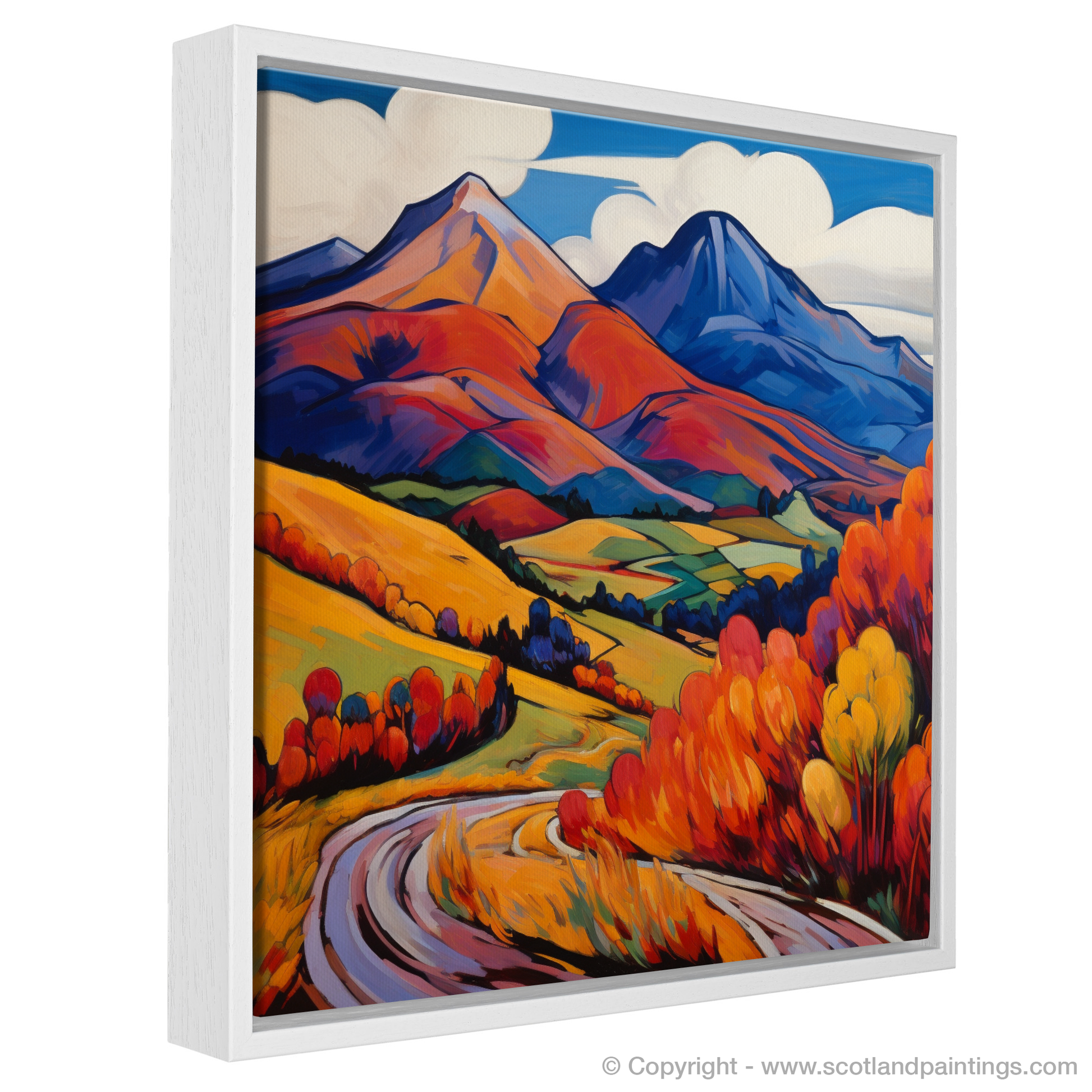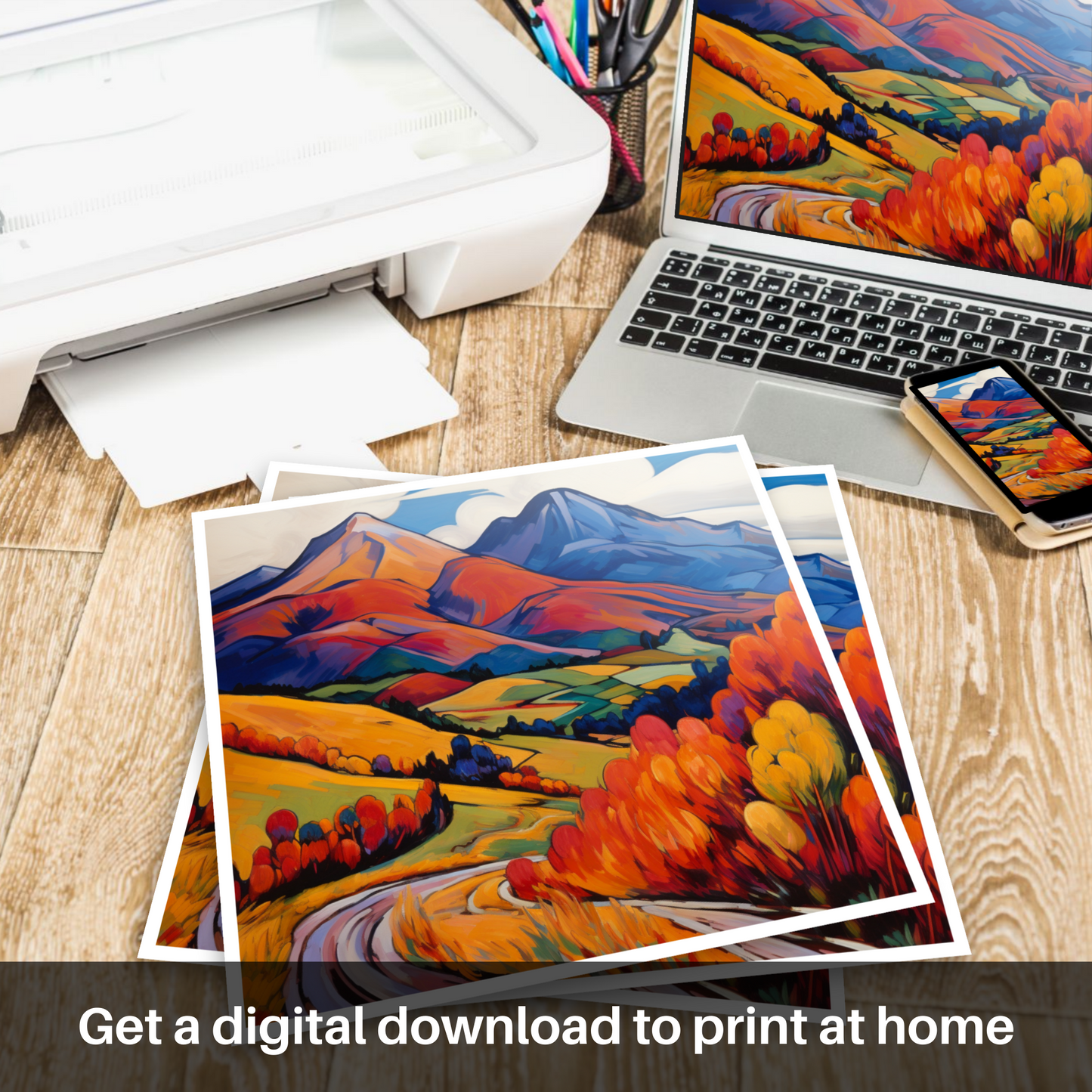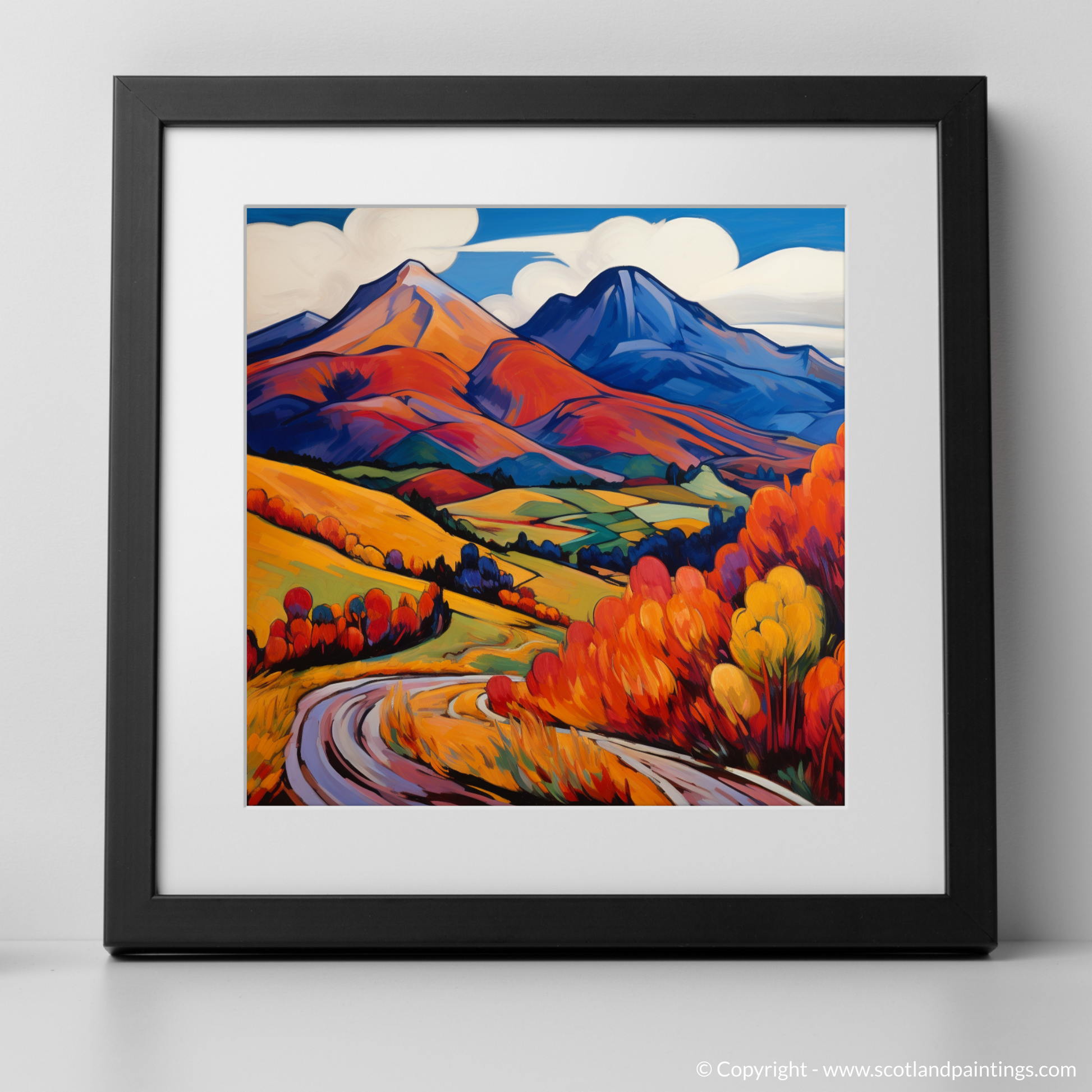 Allow the vivacious spirit of Fauvism to whisk you away to the Scottish Highlands with this captivating print. The dynamic brushstrokes and bold, expressive colours capture Ben Lawers, Perth and Kinross, in a manner that incites a passionate response from the viewer. Fiery oranges and reds ignite the rolling hills, evoking a feeling of the wild heather and bracken ablaze in the glow of the sunset. Intense blues and purples lend depth and contrast to the majestic mountains, drawing the eye upward to the serene expanse of sky, wherein soft cloudbanks drift lazily by.