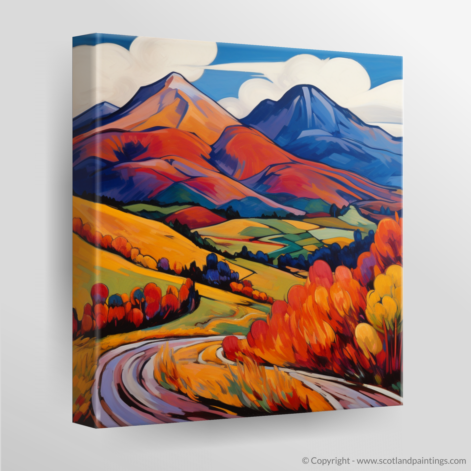 This visual celebration showcases the Scottish Mountains with a rich tapestry of colours that breathe life into the landscape. A serpentine road winds its way through the composition, inviting the spectator on a journey through the richly hued valleys where trees, painted in shades of saffron and crimson, stand like sentinels of the seasons. The patchwork of fields, depicted in a variety of greens, adds a sense of harmonious tranquility to the scene.