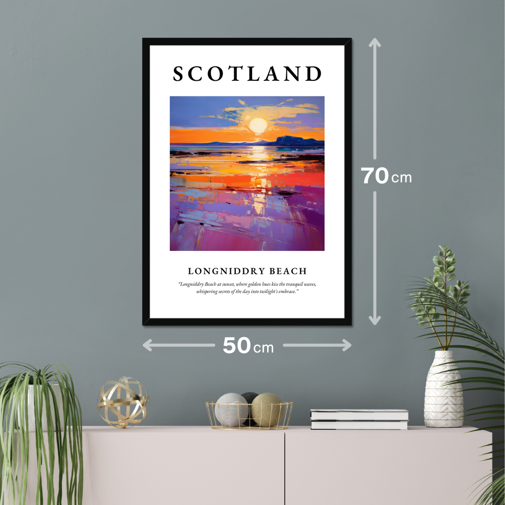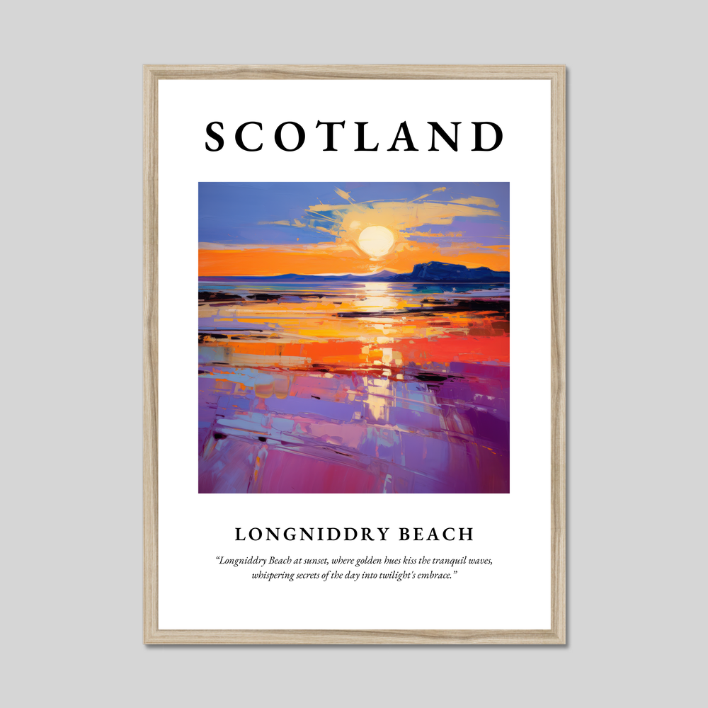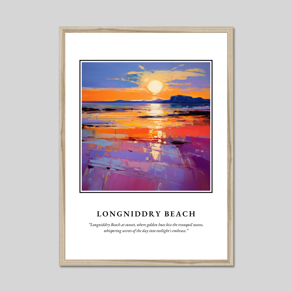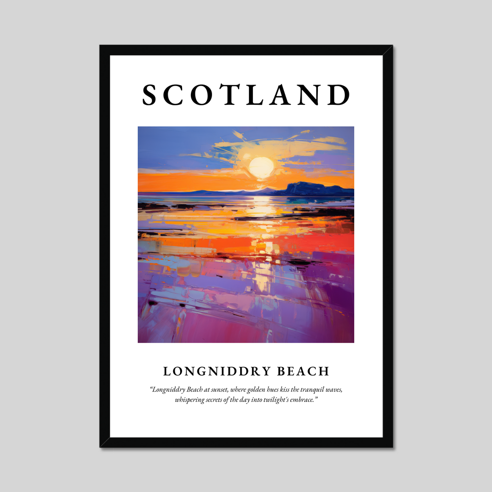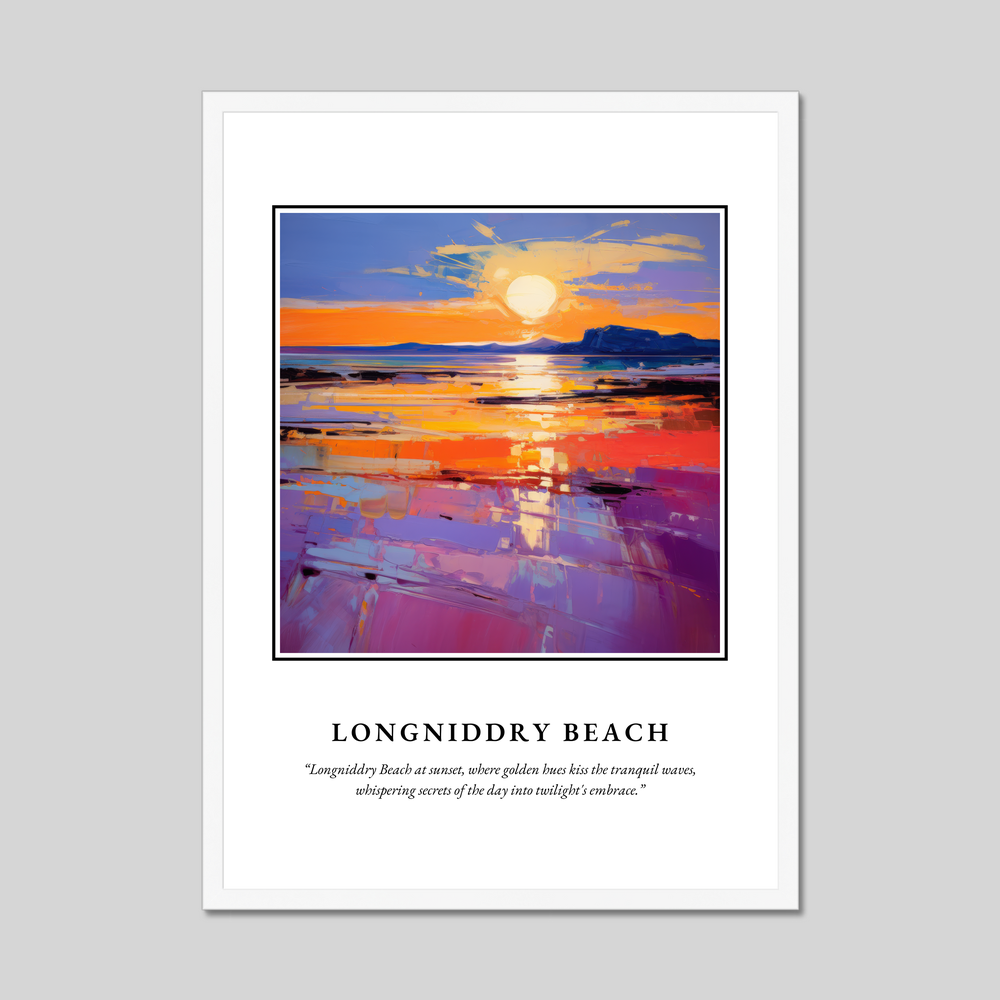 Longniddry Beach, nestled in East Lothian on Scotland's coast, is a haven of tranquillity and natural beauty. Known for its wide sandy stretches and breathtaking sunsets, it's a place where the rhythm of the waves and the whispers of the breeze create a serene escape. This stunning beach is popular with locals and visitors alike, offering opportunities for seaside walks, bird watching, and simply enjoying the undisturbed beauty of the Scottish coastline. The painting featured in this print beautifully encapsulates the ethereal glow of a sunset at Longniddry, echoing the real-life allure of this captivating location.